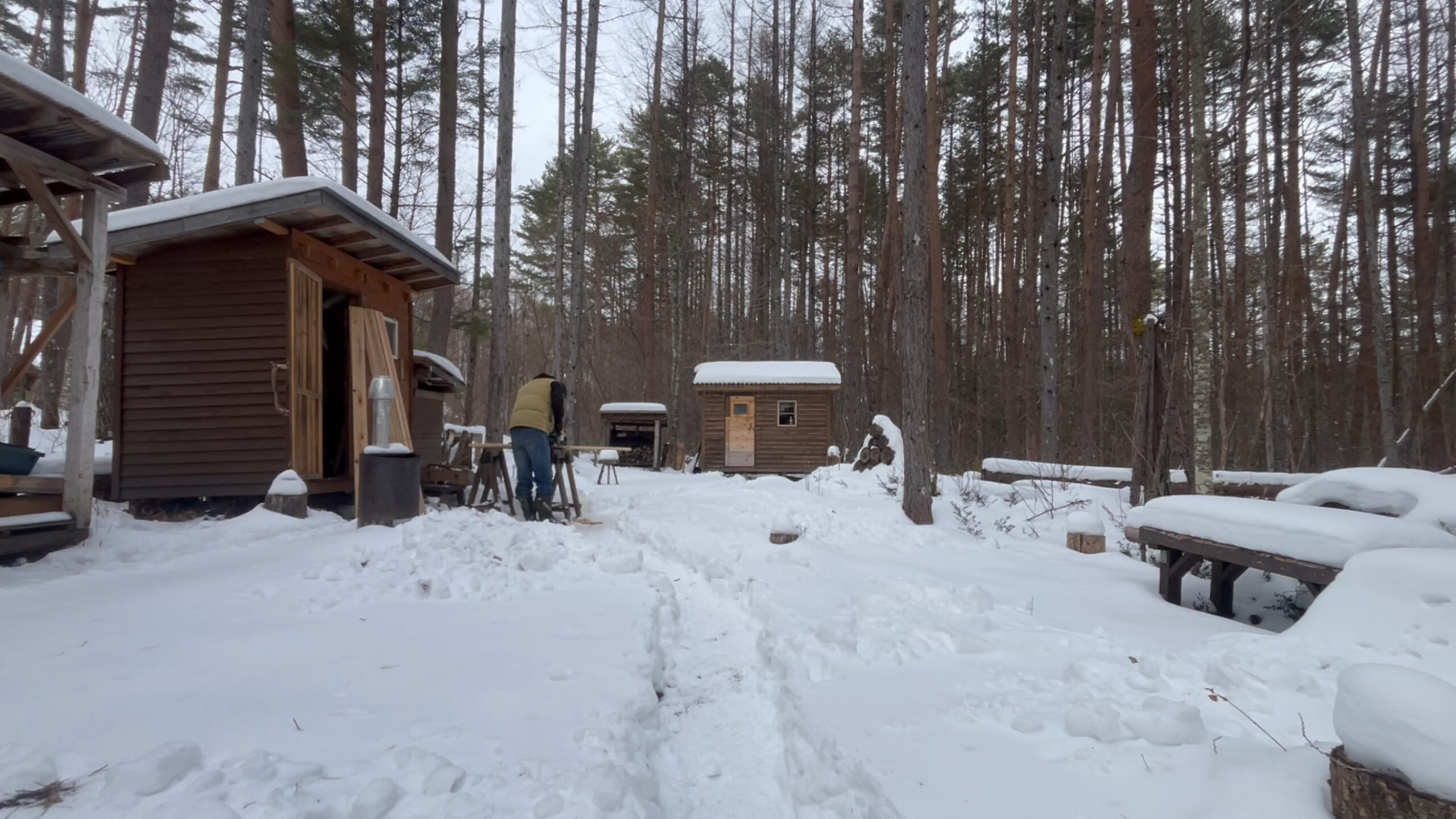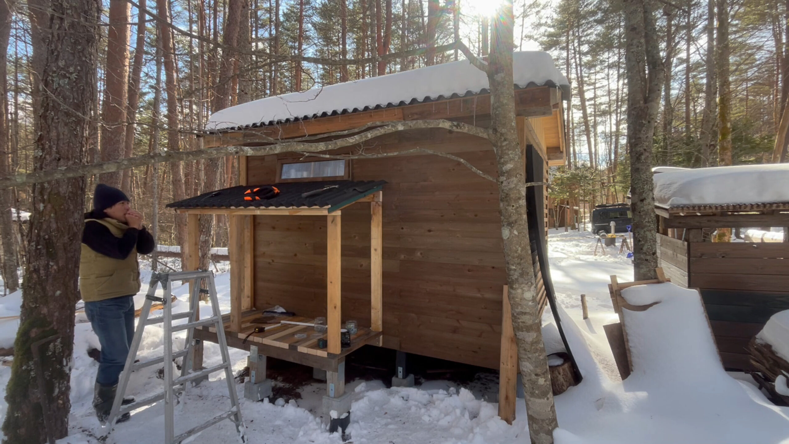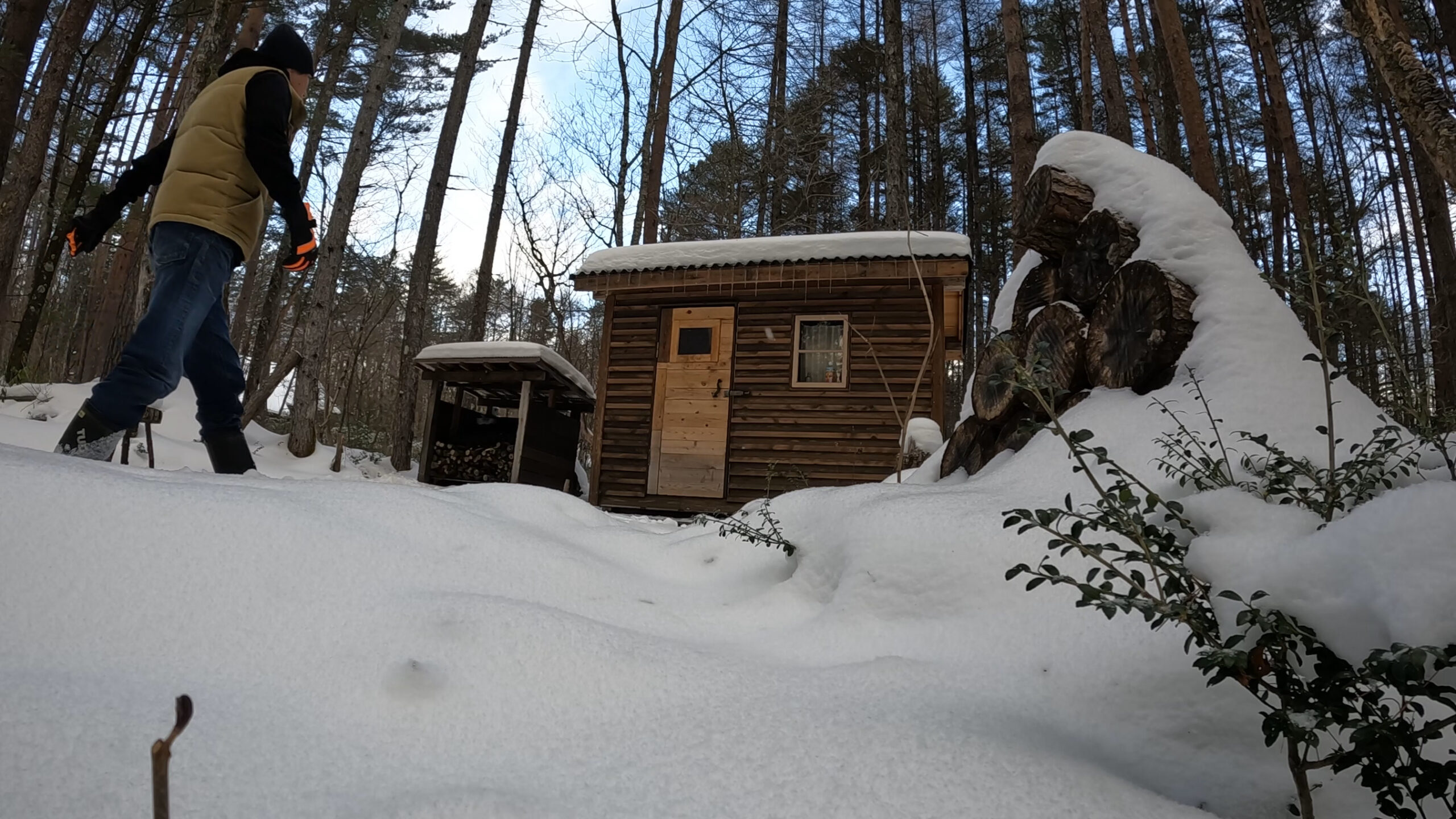 2020年の8月に開拓をスタートして、物置小屋、薪棚、雨水貯水システム、そして小さな小さな山小屋を建てました。