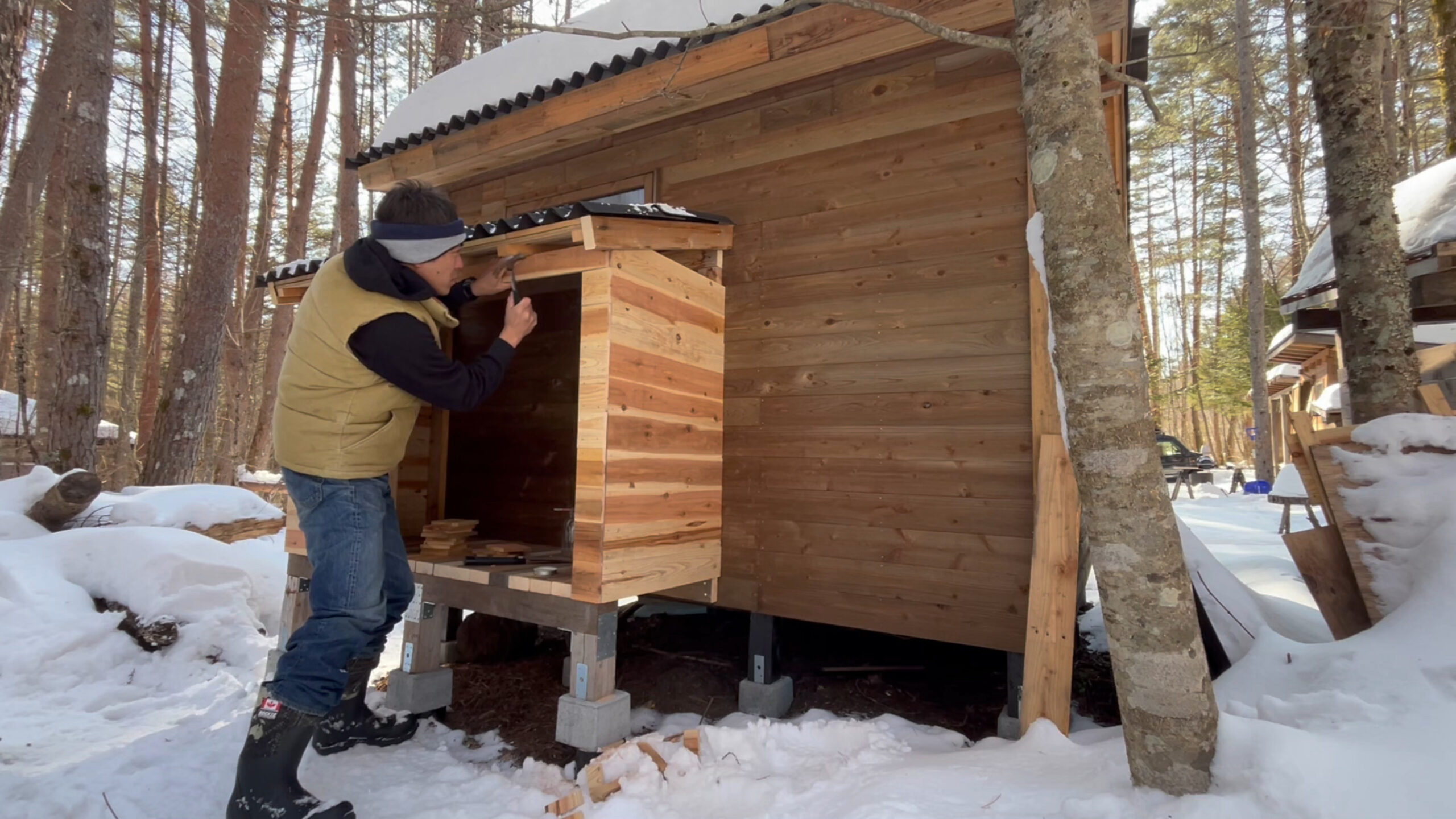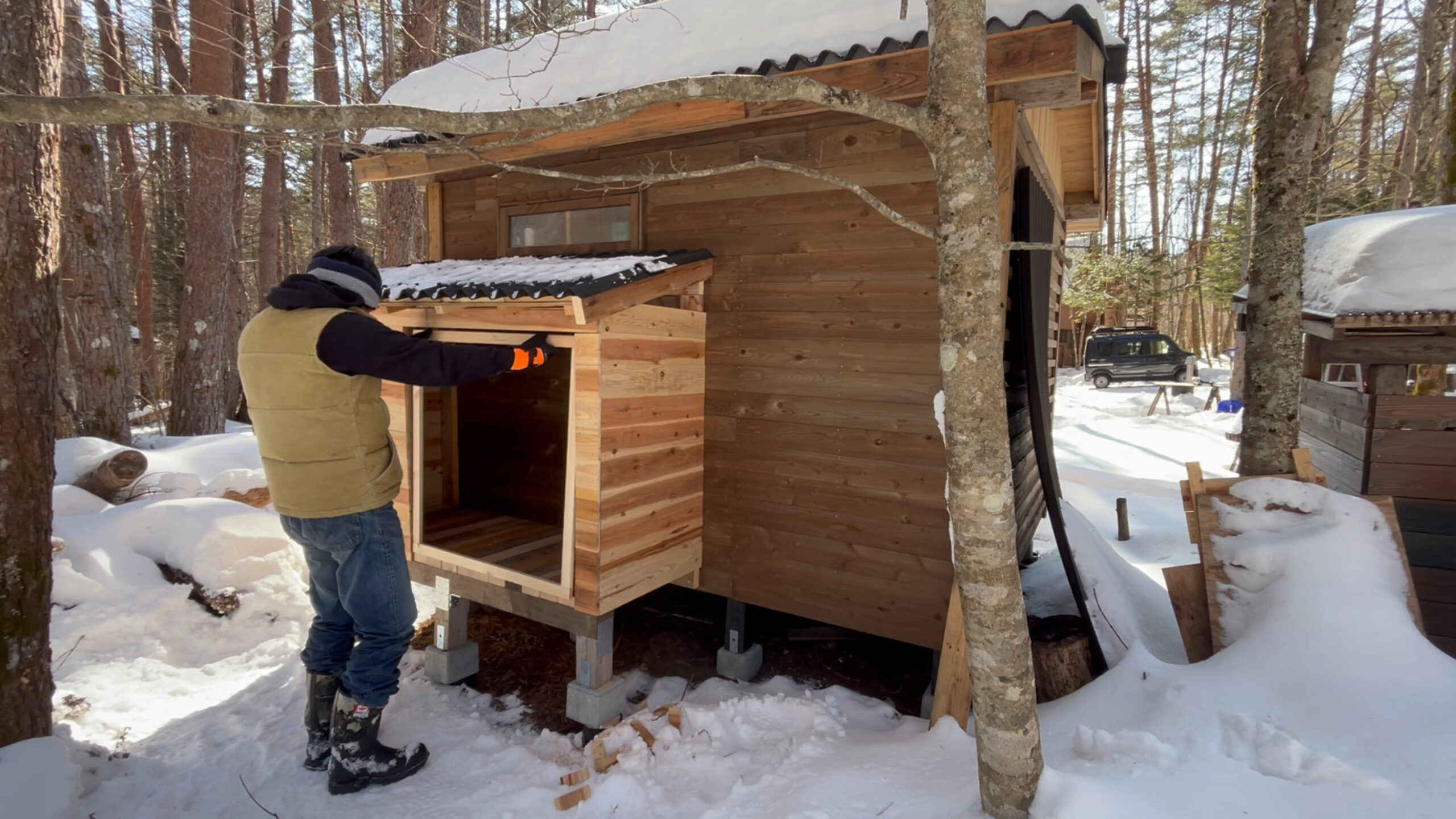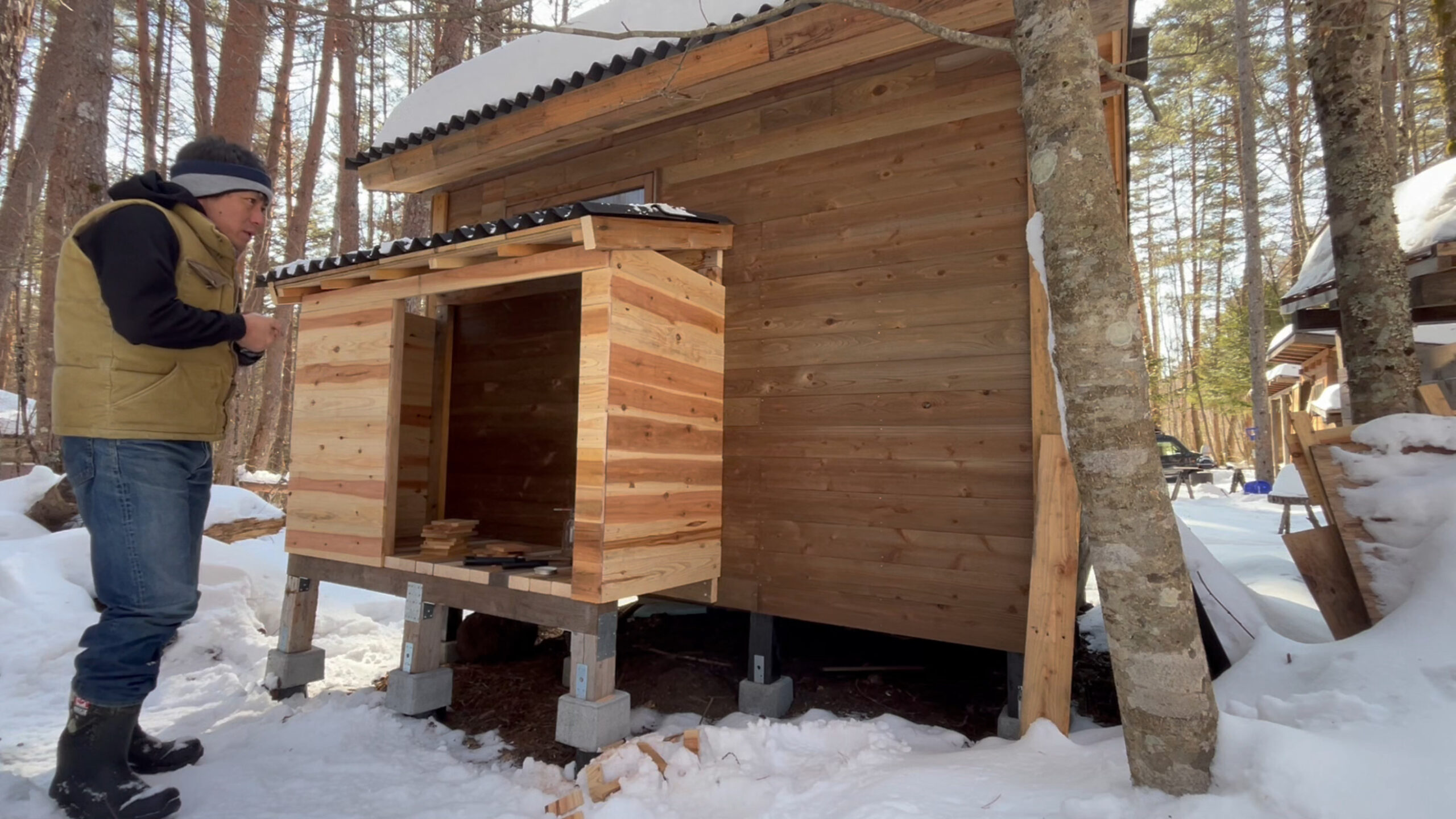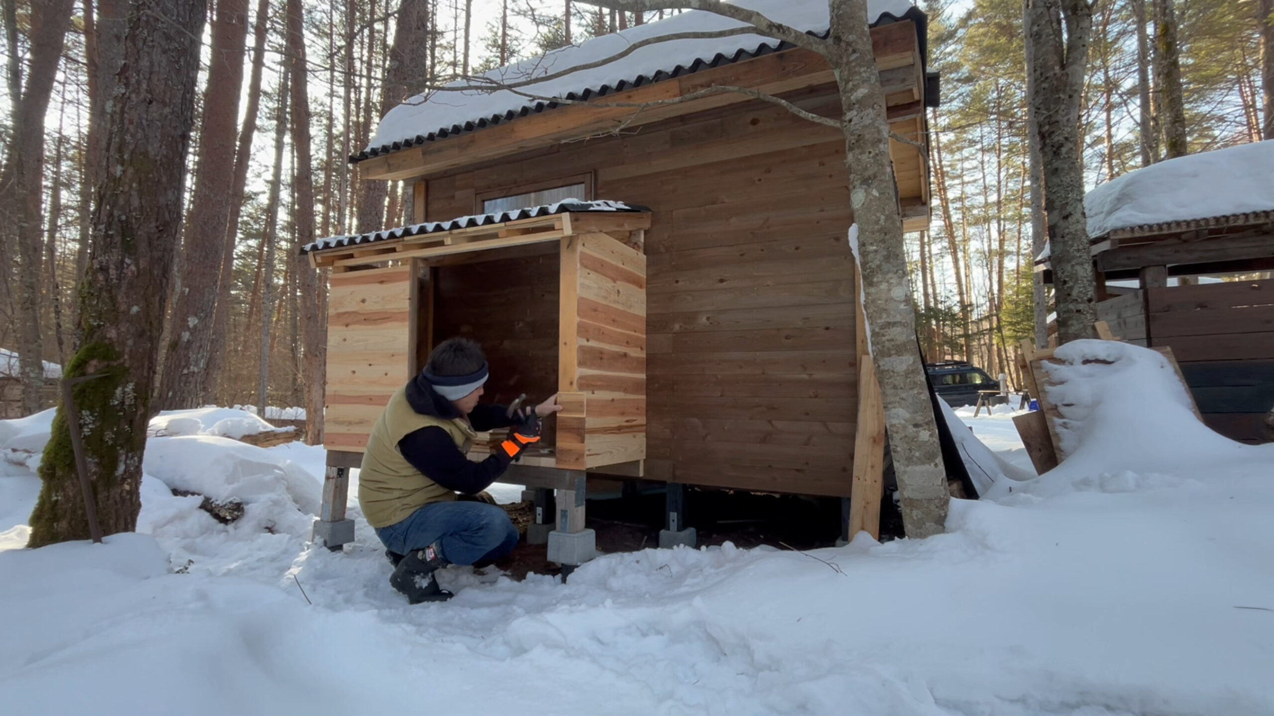 2020年の8月に開拓をスタートして、物置小屋、薪棚、雨水貯水システム、そして小さな小さな山小屋を建てました。