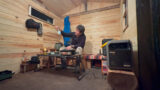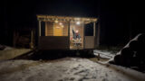 自作の山小屋でランタンの灯りの元お酒を…