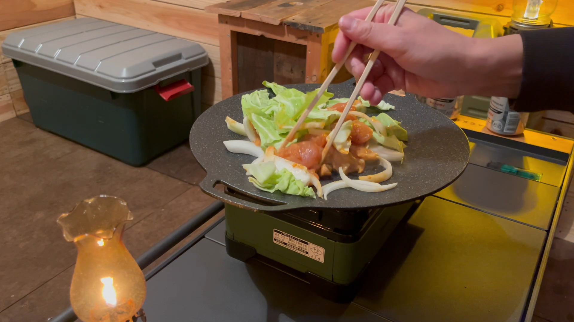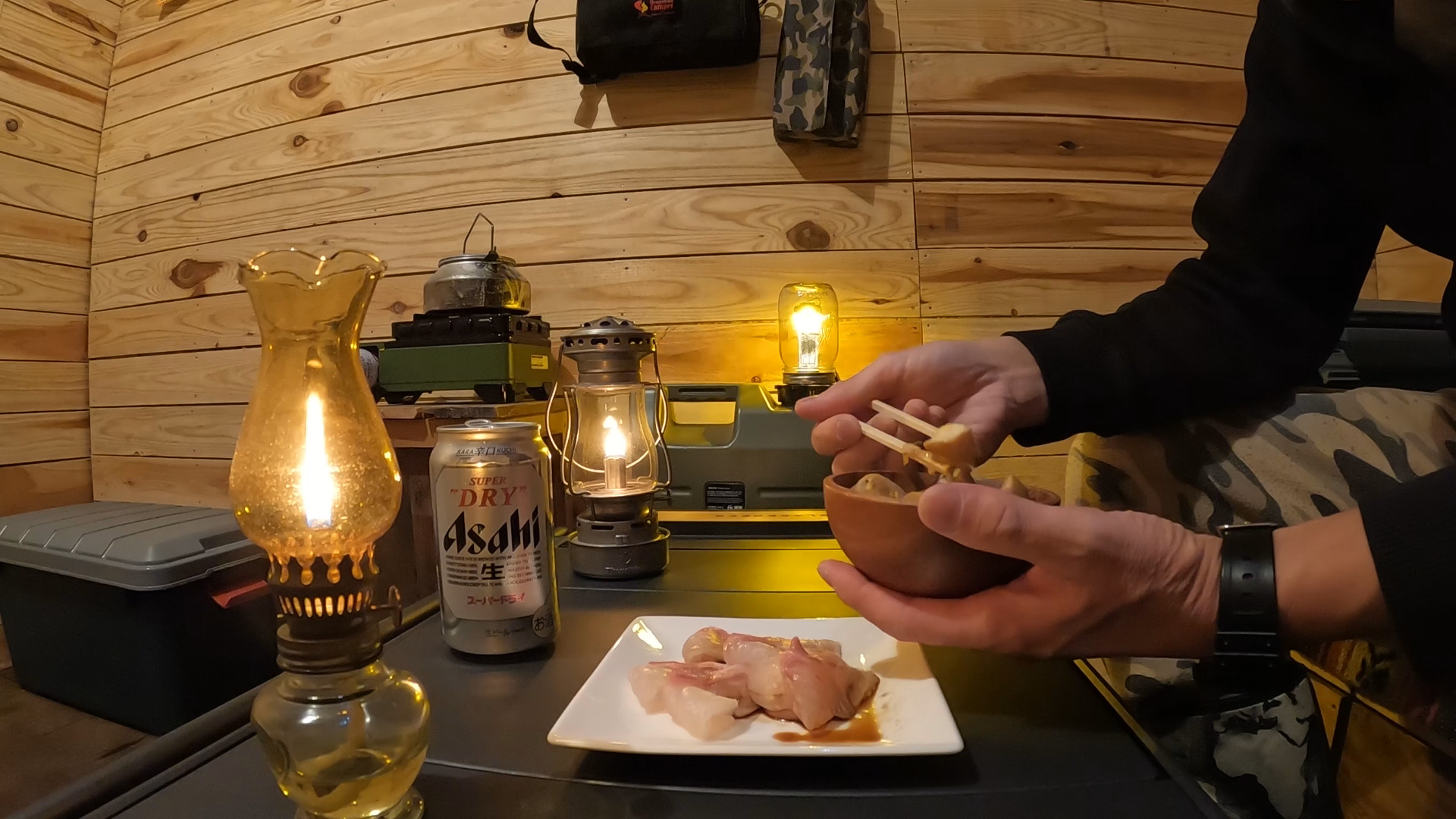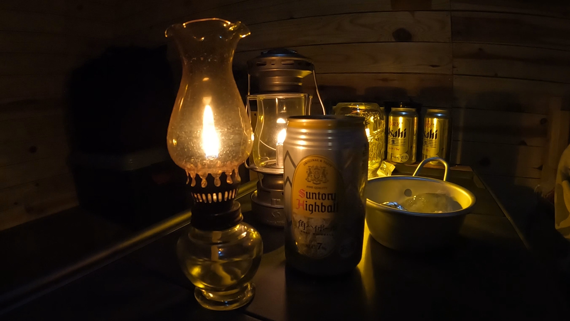 ランタンの灯りに囲まれて晩酌タイムとします。