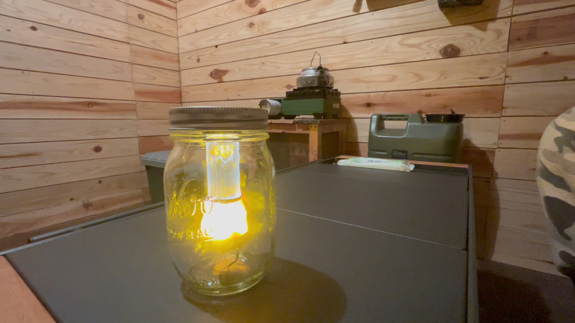 自宅から持って来たガラスの瓶とキャンプで使っている電気ランタンでボトルランタンを作ってみます。