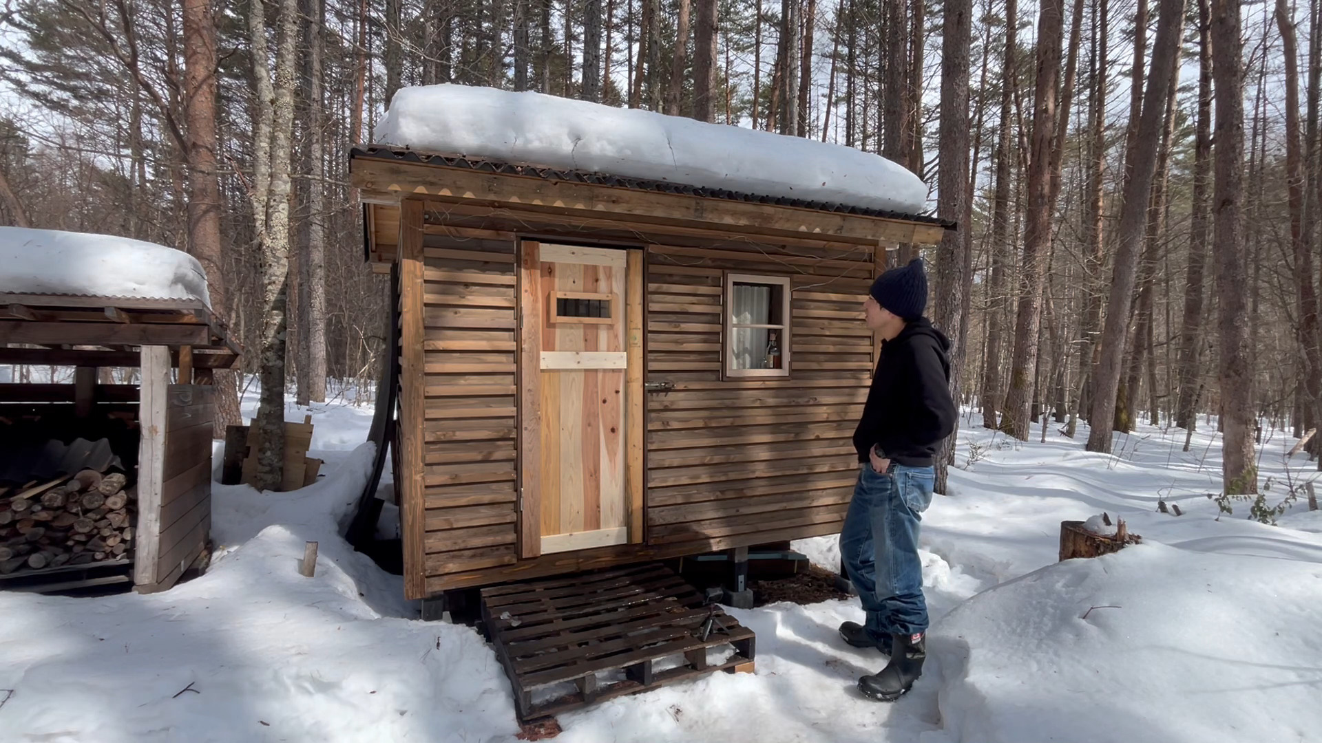 2020年の8月に開拓をスタートして、物置小屋、薪棚、雨水貯水システム、そして小さな小さな山小屋を建てました。