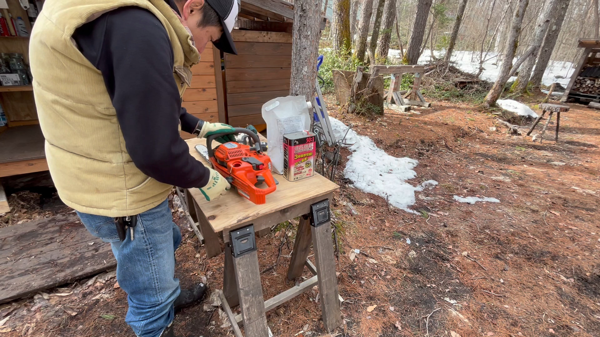 混合燃料とチェーンオイルを補充して