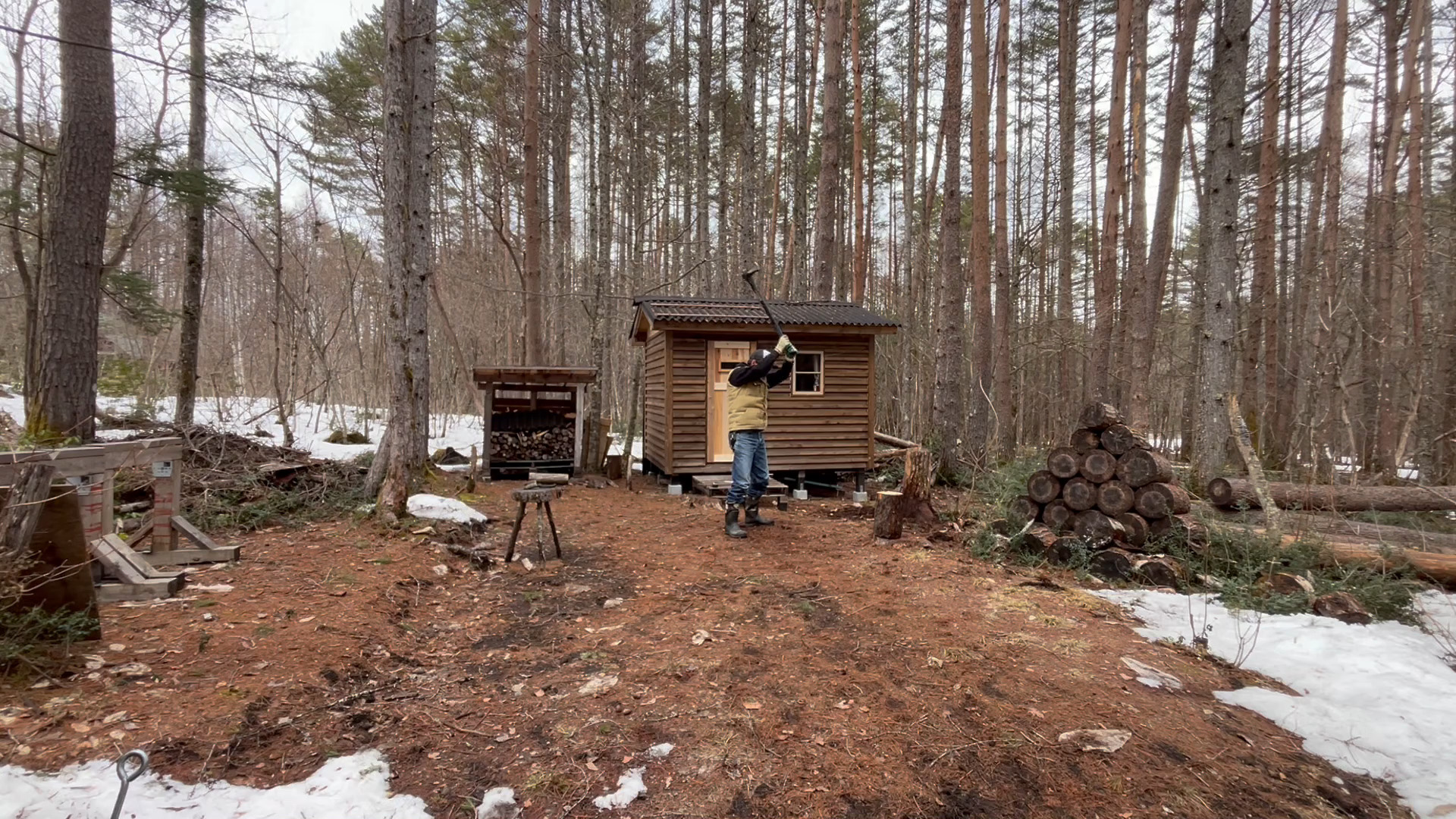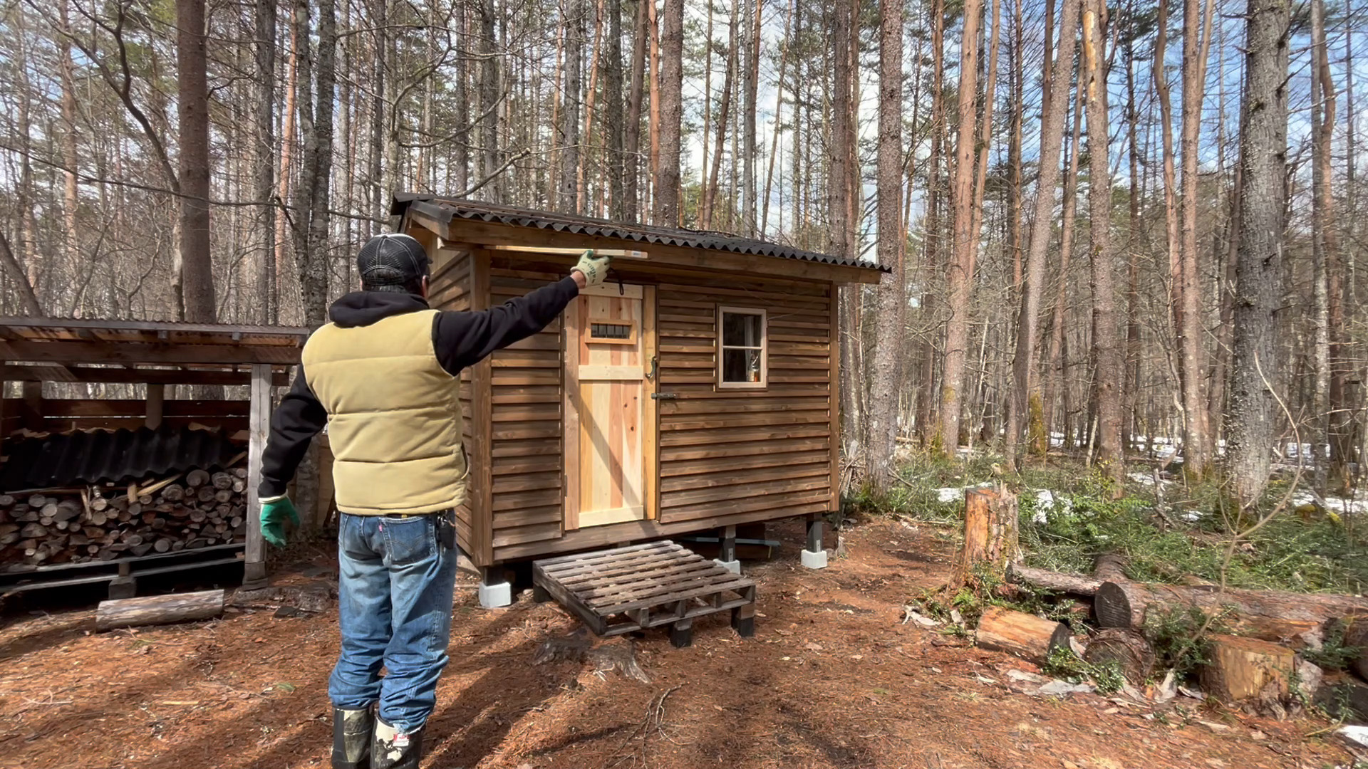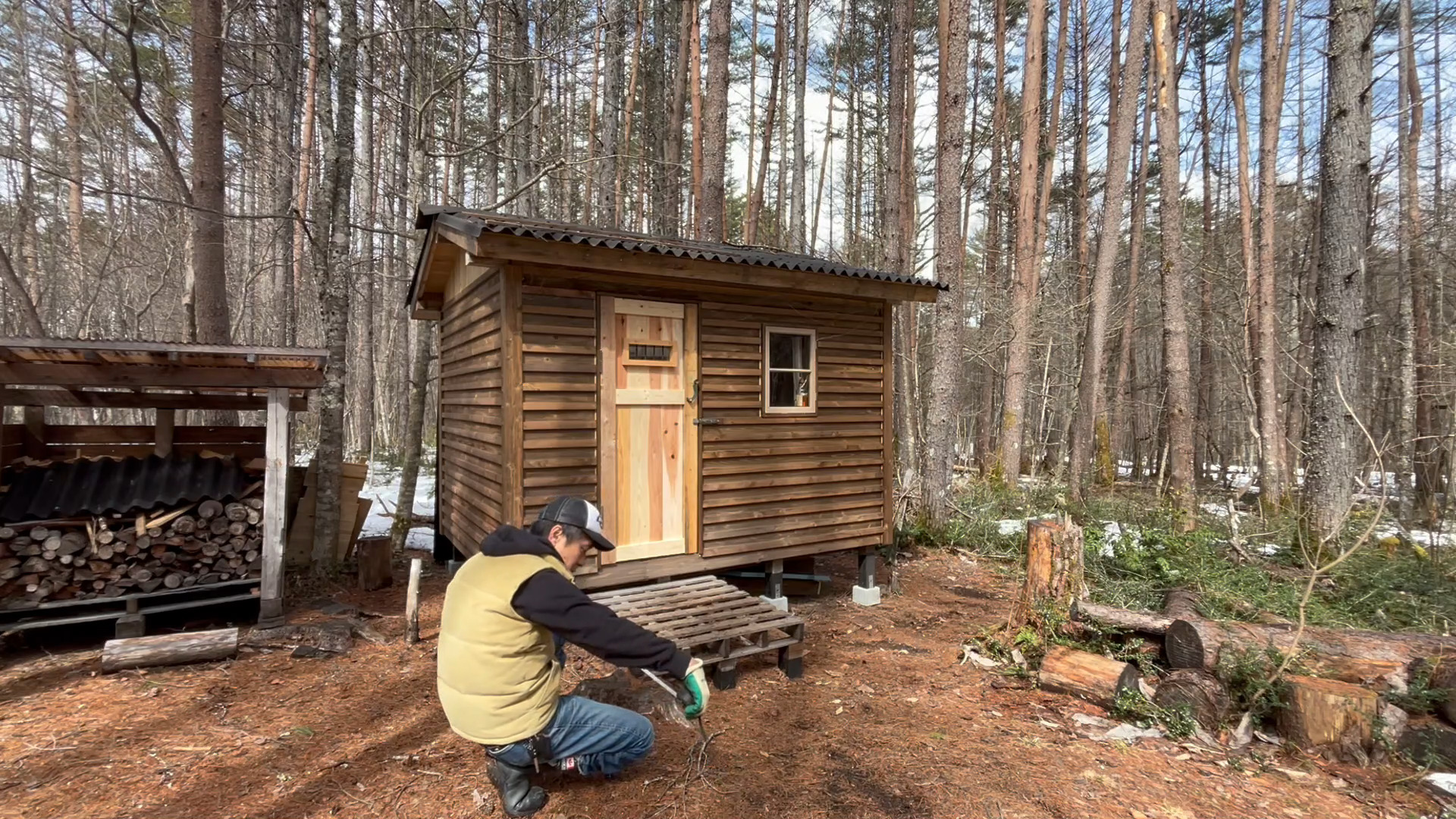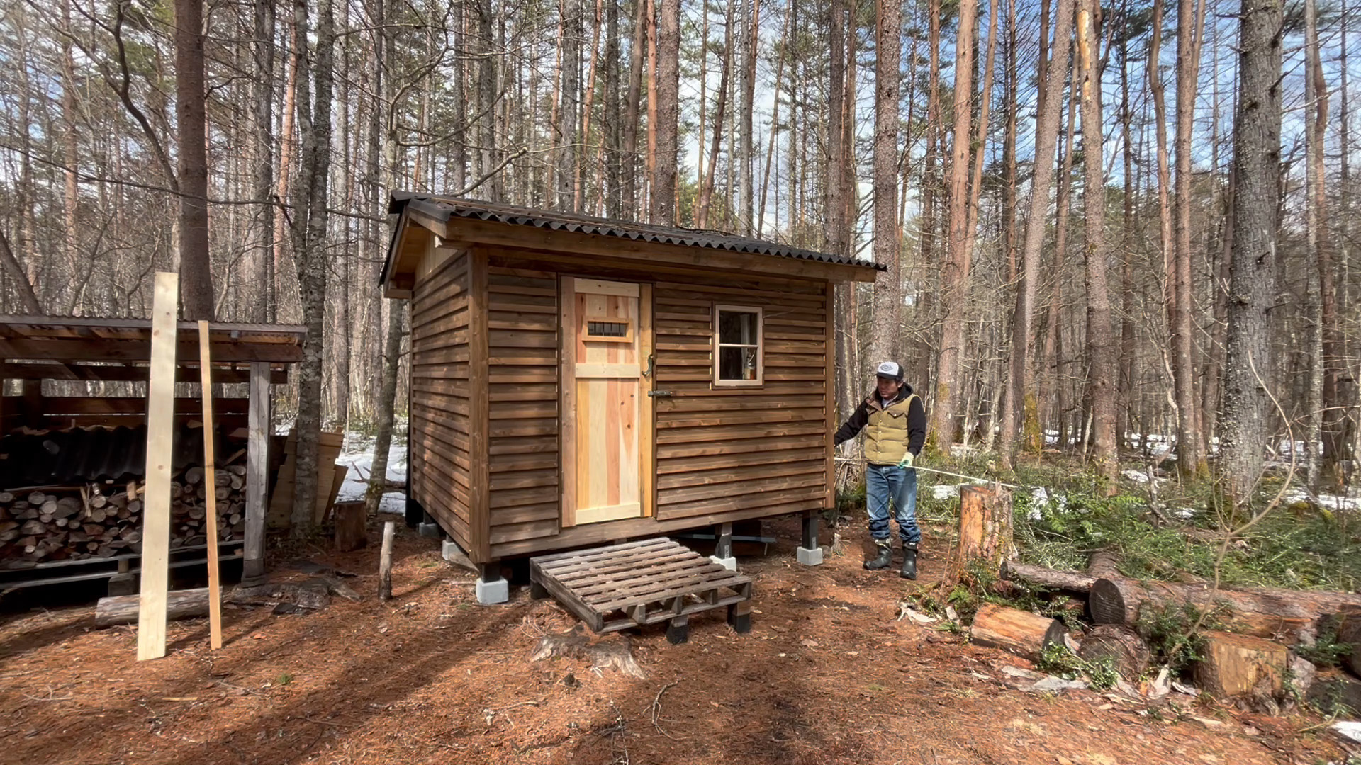 2020年の8月に開拓をスタートして、物置小屋、薪棚、雨水貯水システム、そして小さな小さな山小屋を建てました。