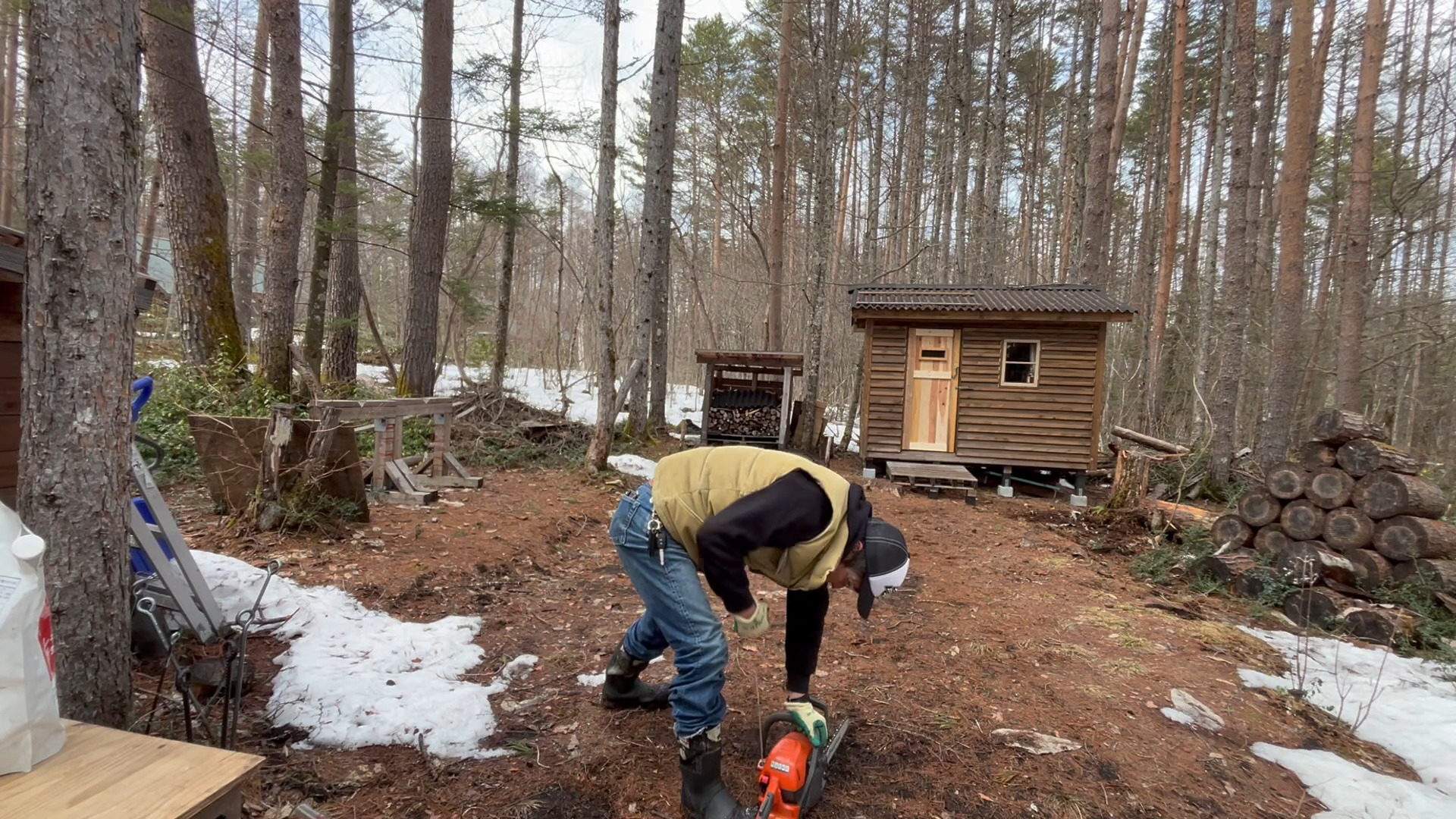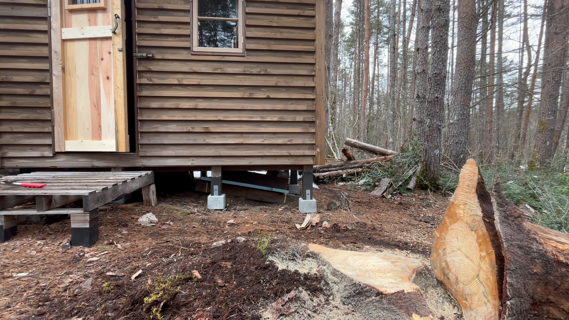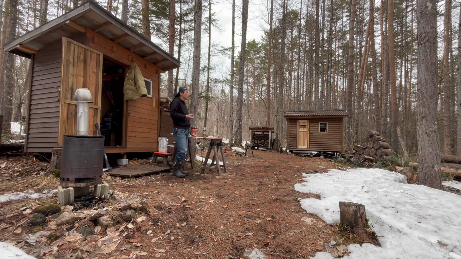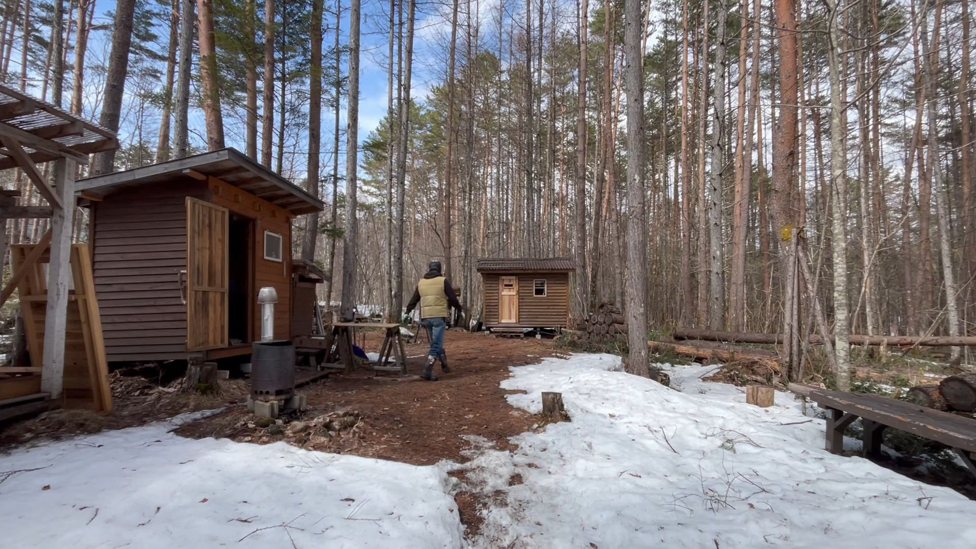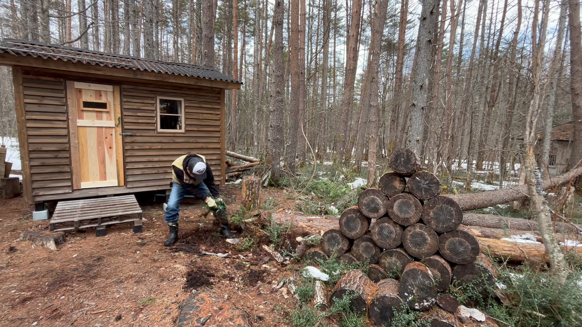 2020年の8月に開拓をスタートして、物置小屋、薪棚、雨水貯水システム、そして小さな小さな山小屋を建てました。