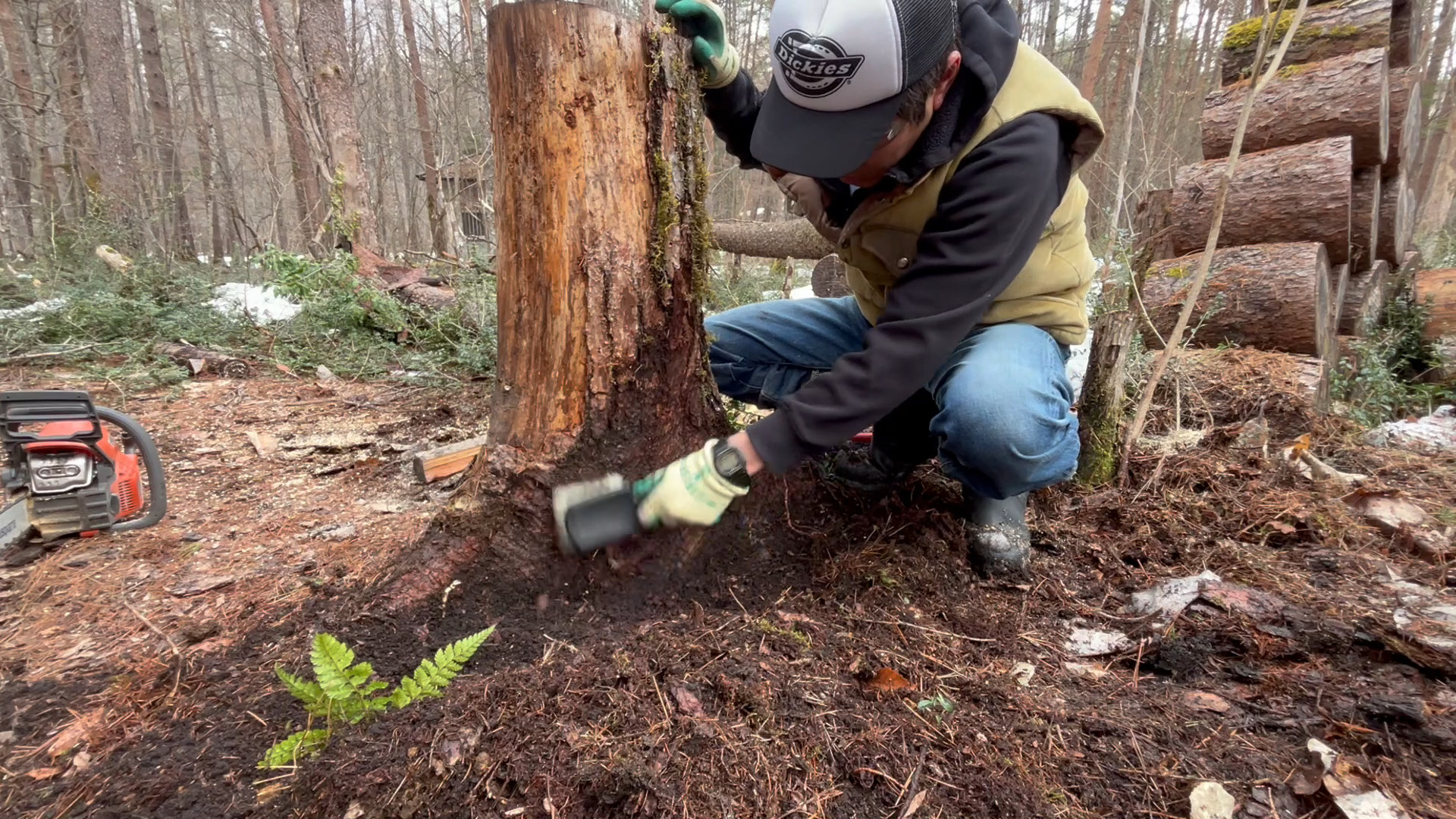 と言うことでデッキ製作に邪魔になる丸太や切株、草などを撤去していきます。