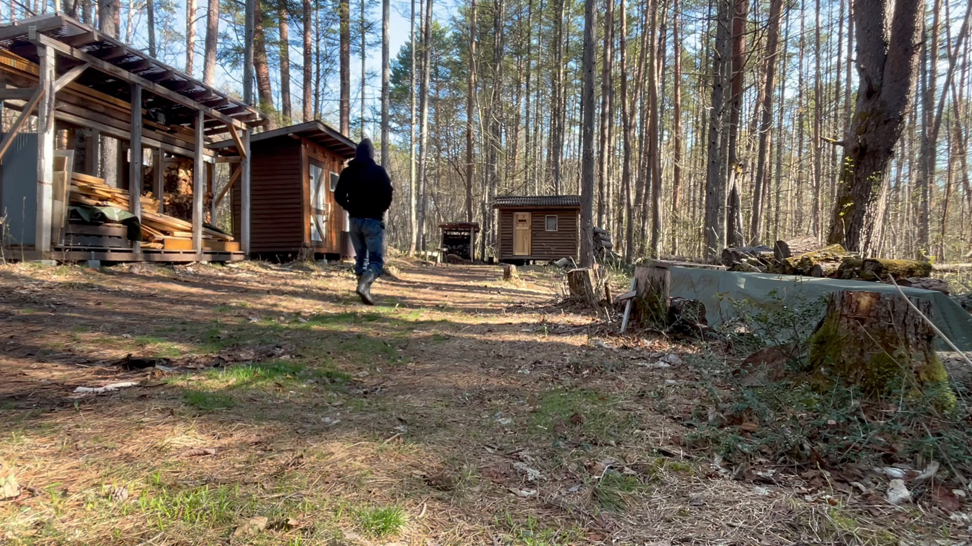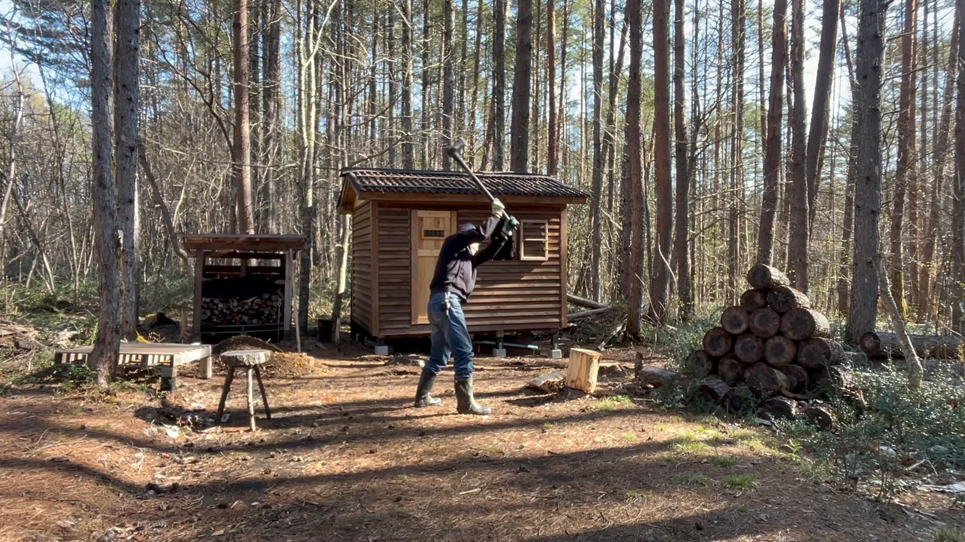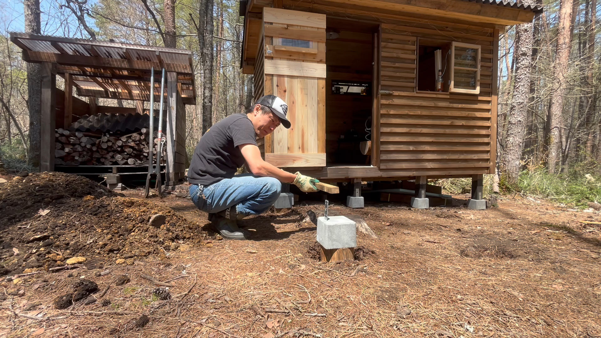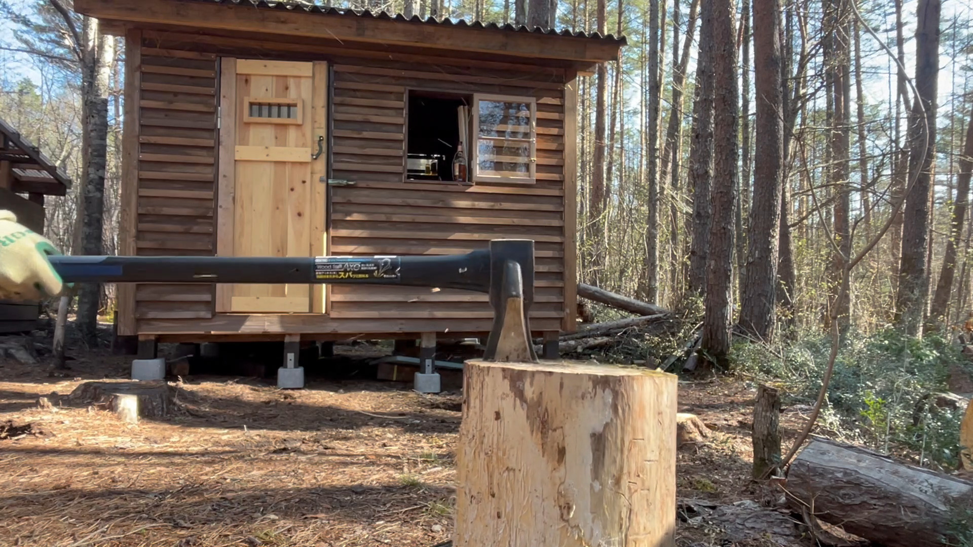 2020年の8月に開拓をスタートして、物置小屋、薪棚、雨水貯水システム、そして小さな小さな山小屋を建てました。