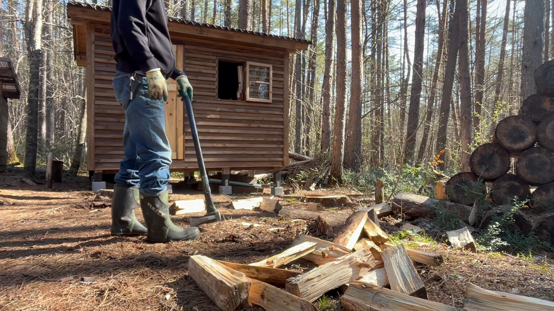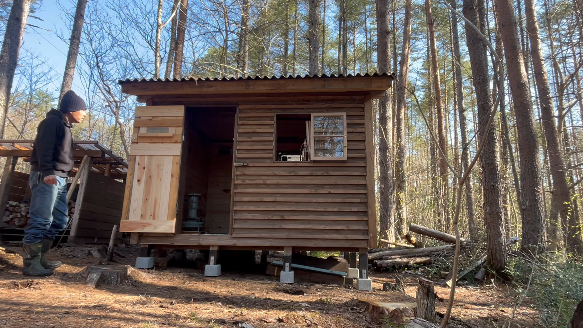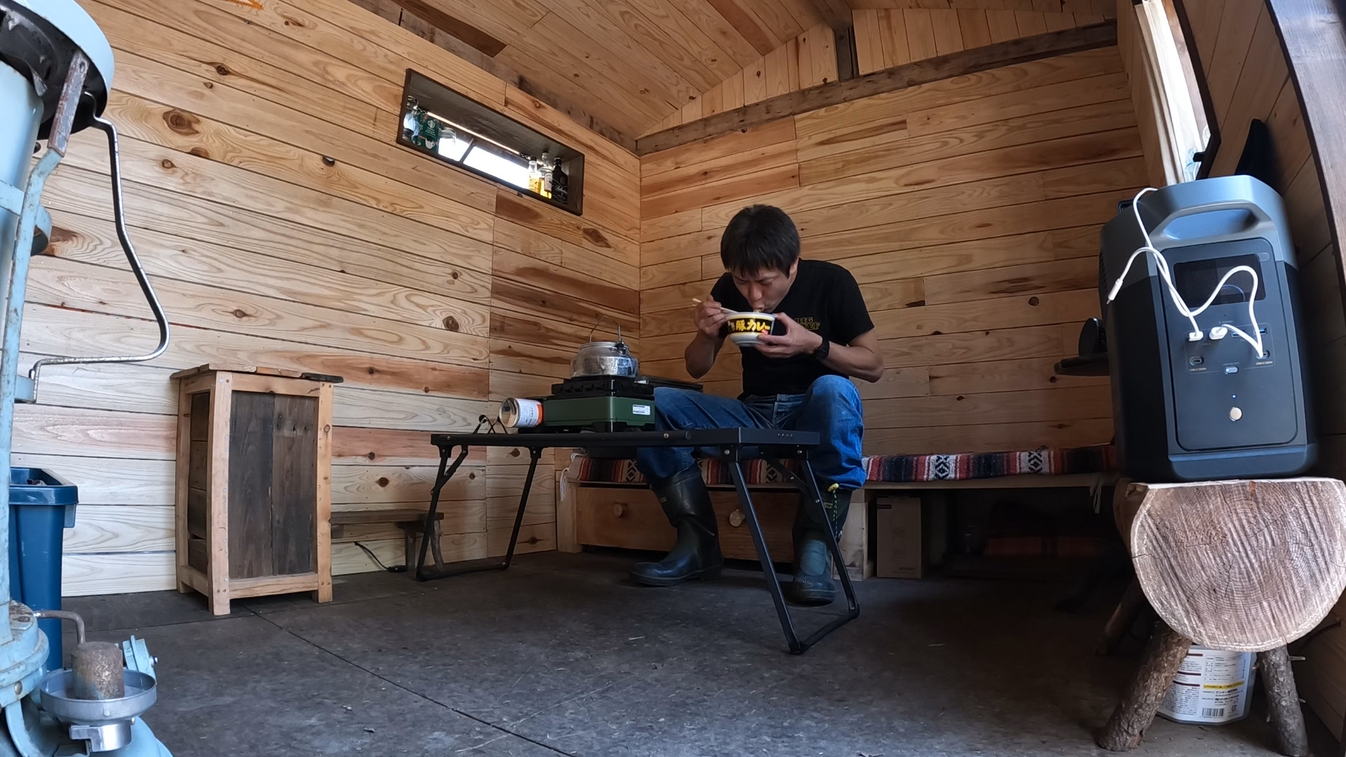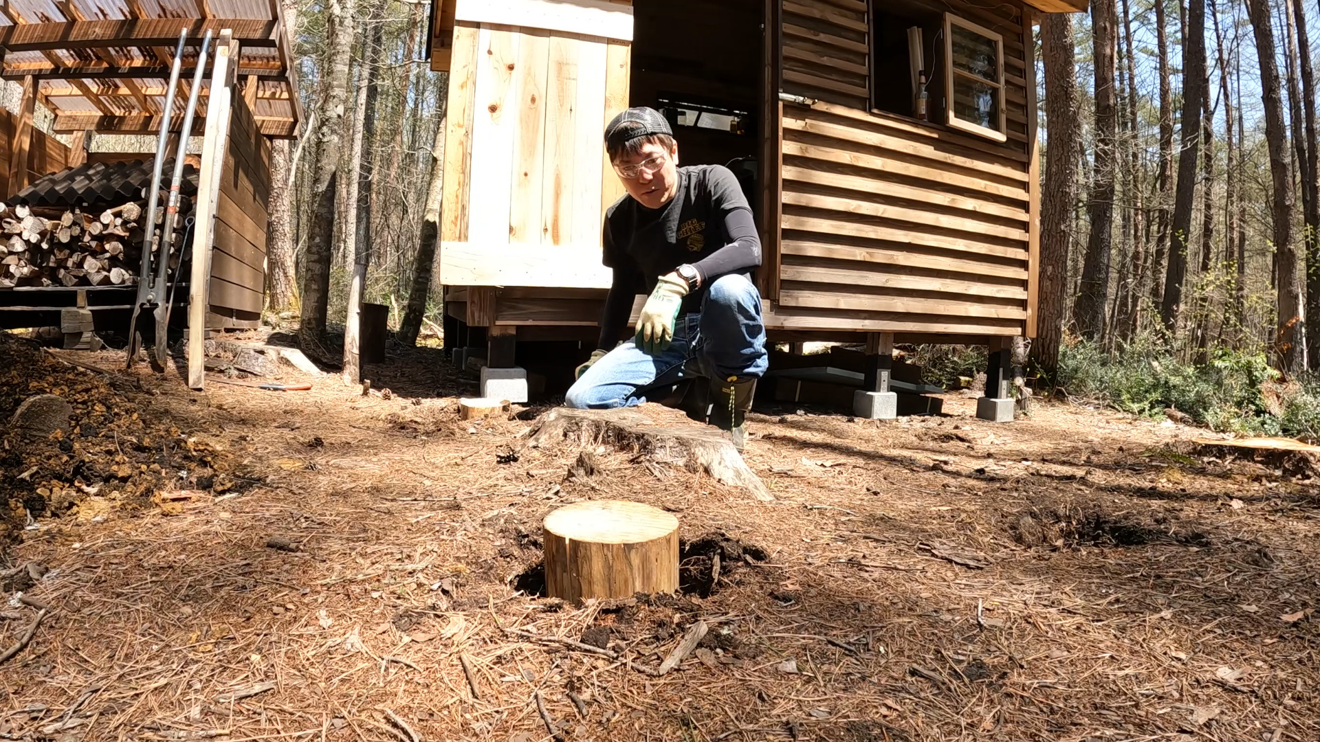 2020年の8月に開拓をスタートして、物置小屋、薪棚、雨水貯水システム、そして小さな小さな山小屋を建てました。