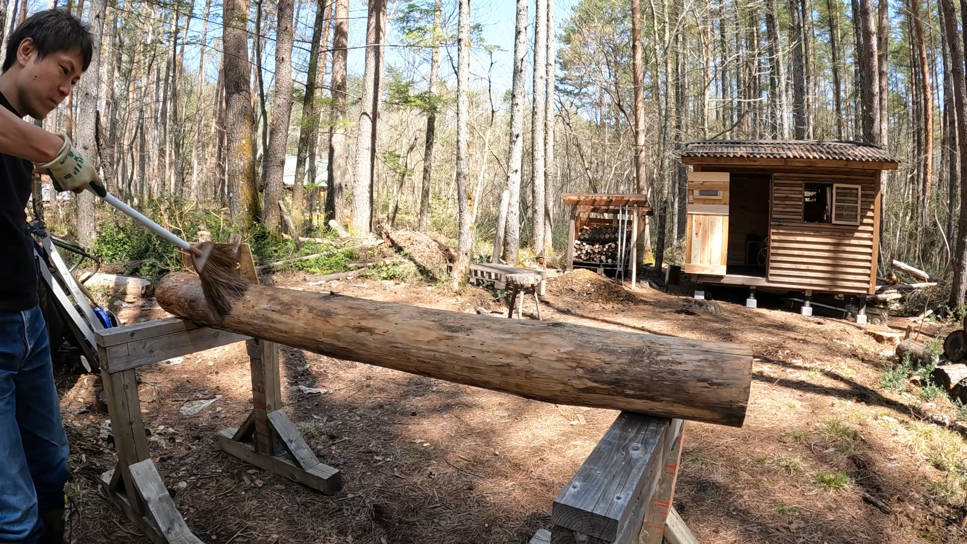 この丸太は以前丸太小屋を作っていた時に加工した物です。