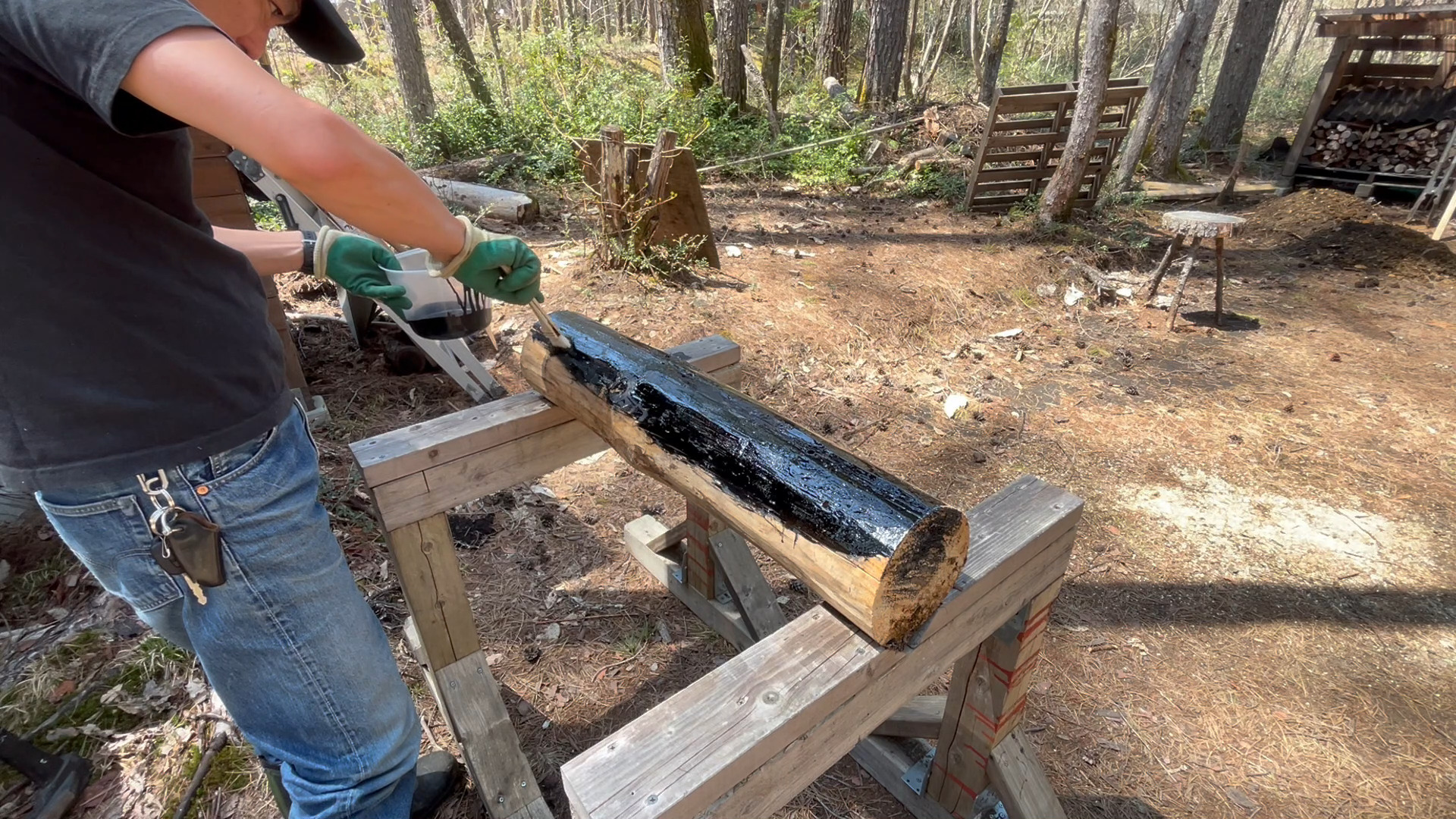 地中に埋める丸太なのでコールタールでしっかりコーティングします。