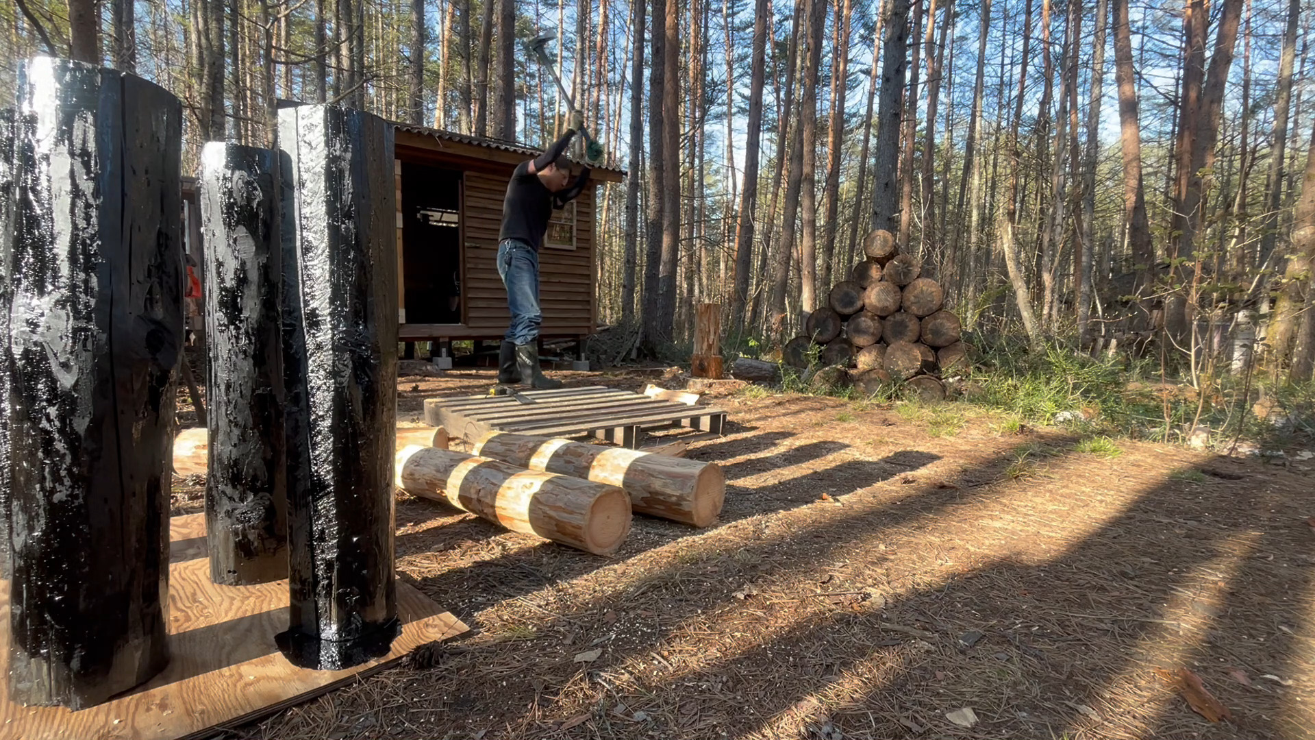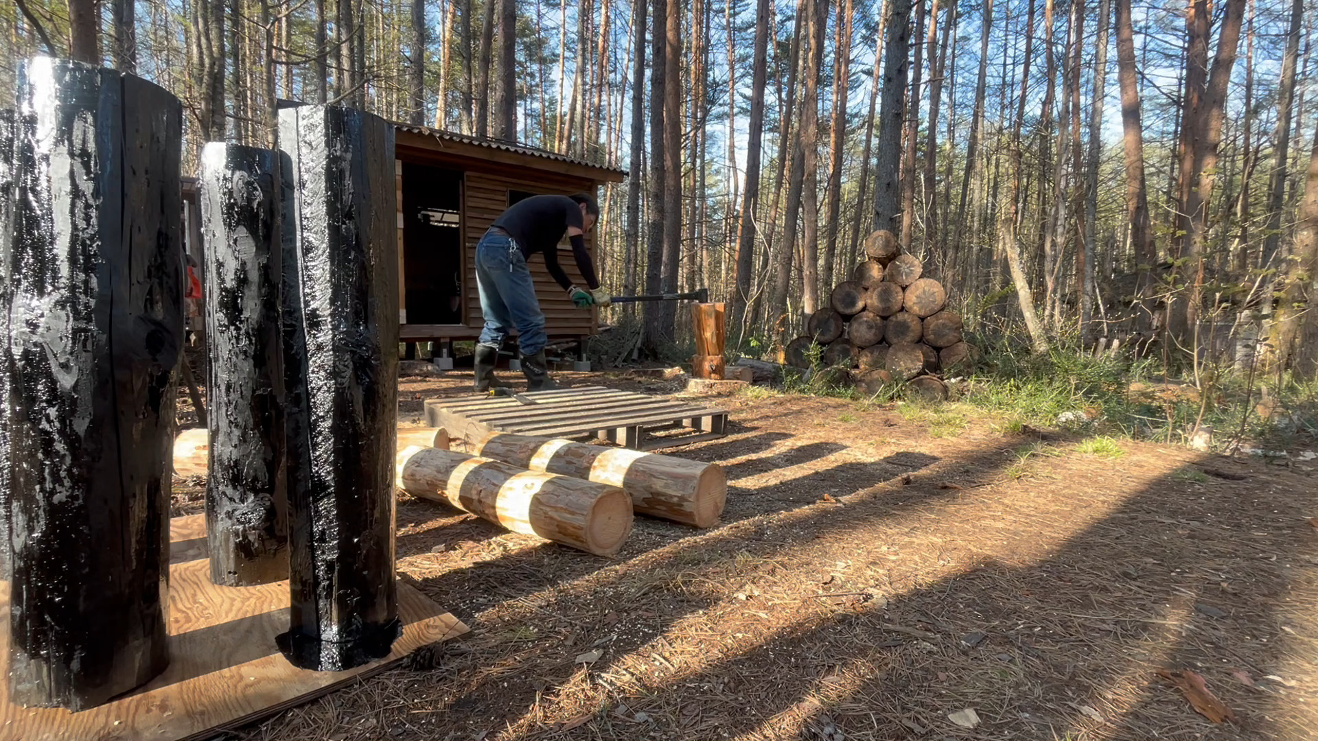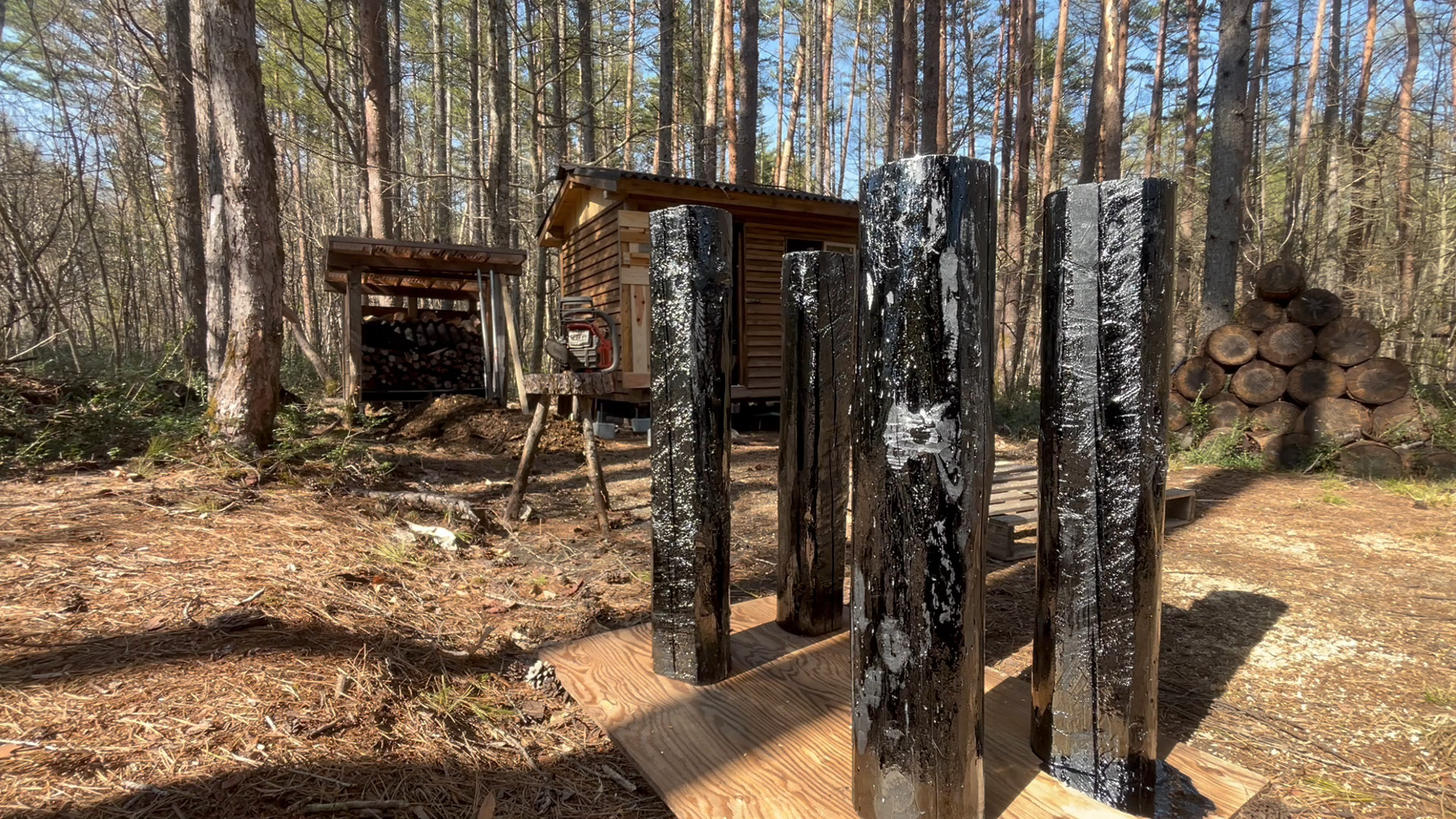 黒光する丸太…前回長さ850mmに切り揃えてコールタールを塗って防腐処理を施しました。