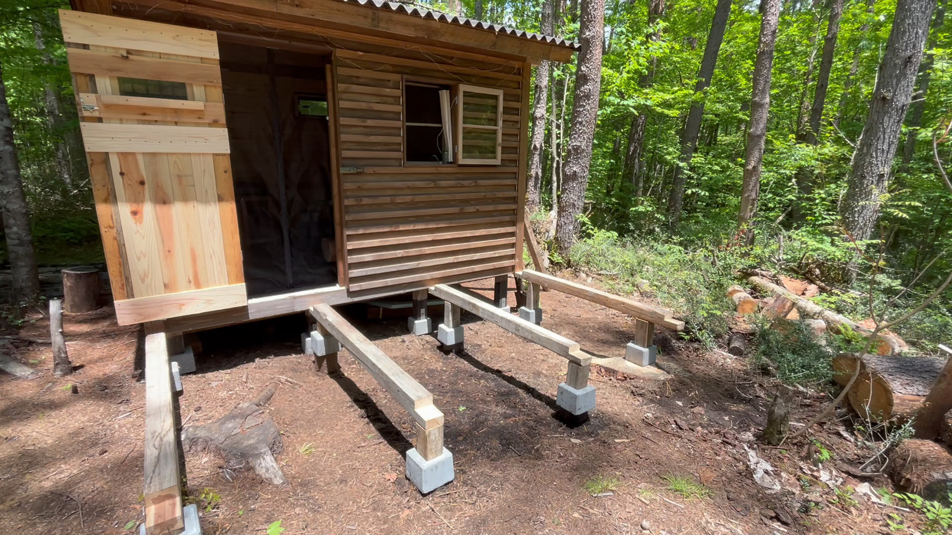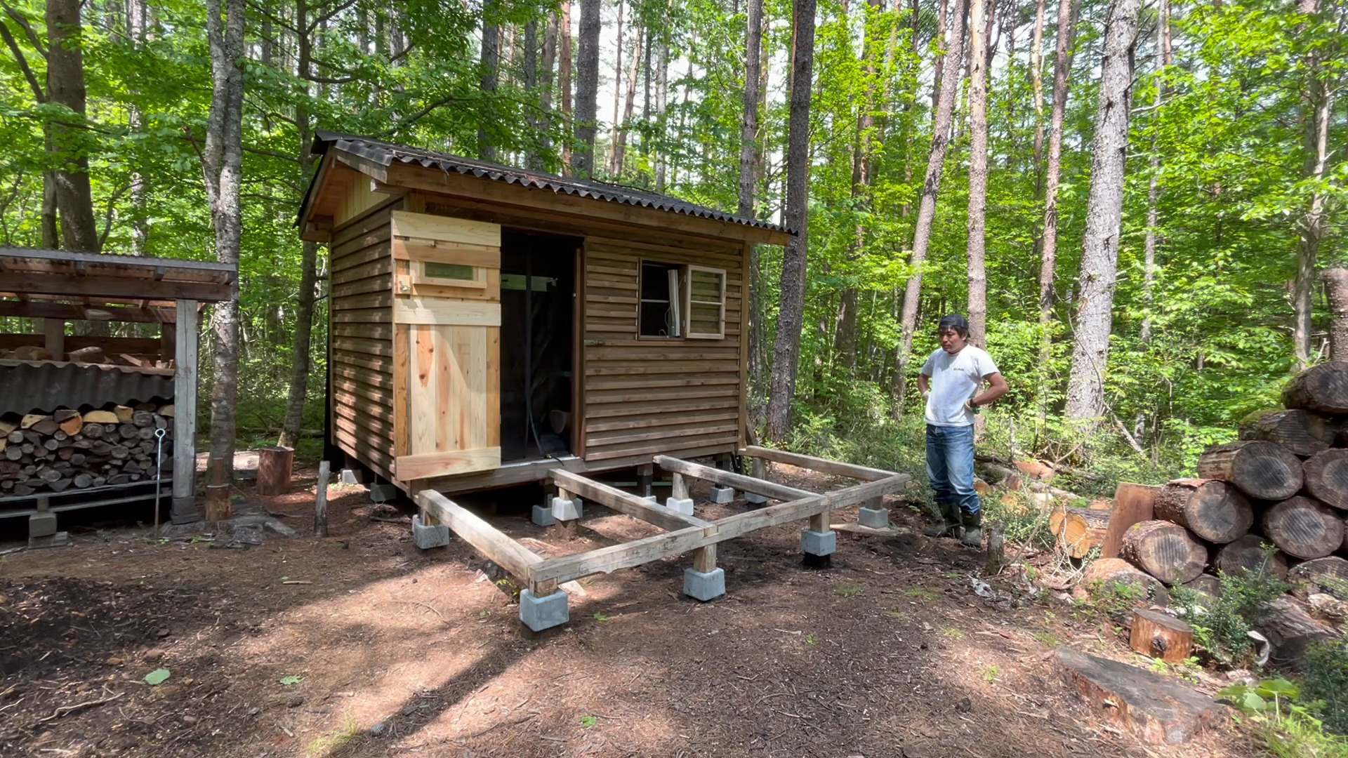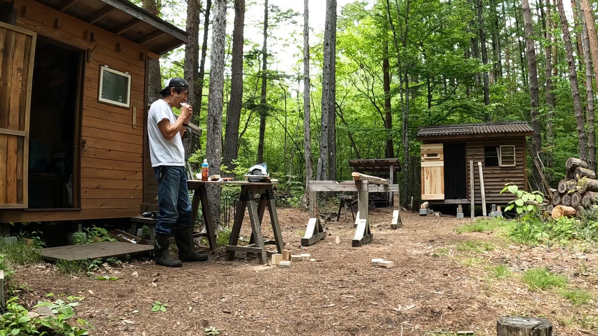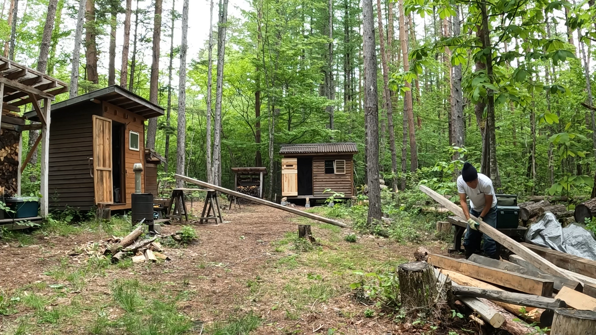 2020年の8月に開拓をスタートして、物置小屋、薪棚、雨水貯水システム、そして小さな小さな山小屋を建てました。