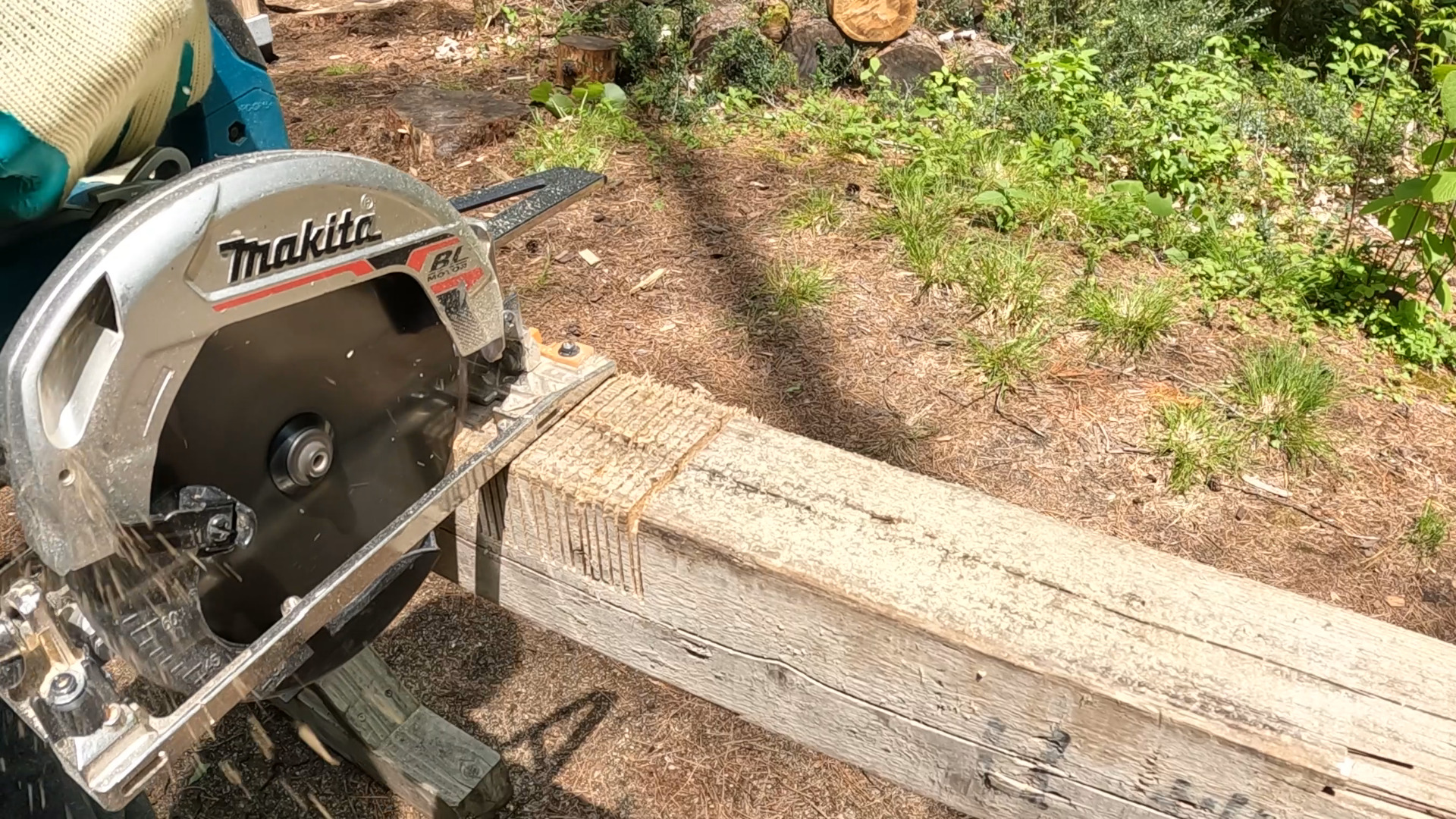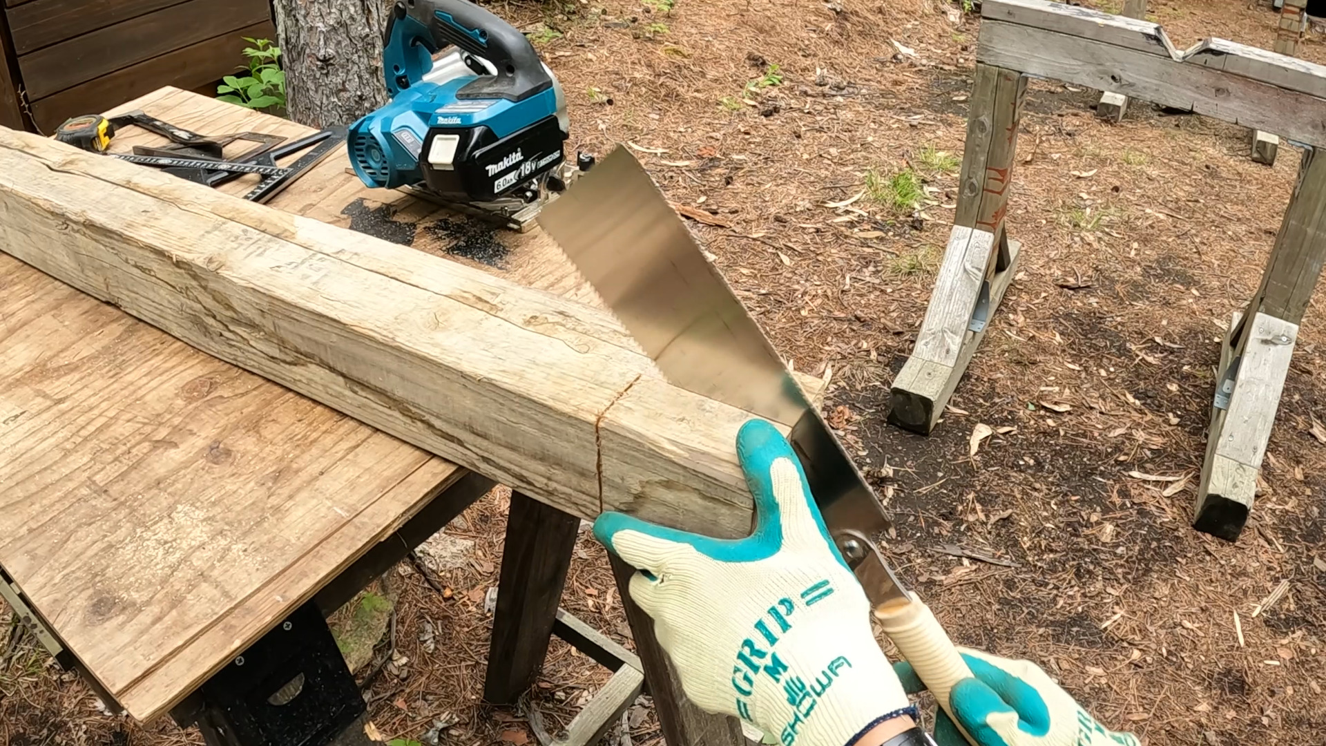 丸鋸で45mmの深さに切れ込みを入れて次に手鋸で縦方向をカットしていきます。