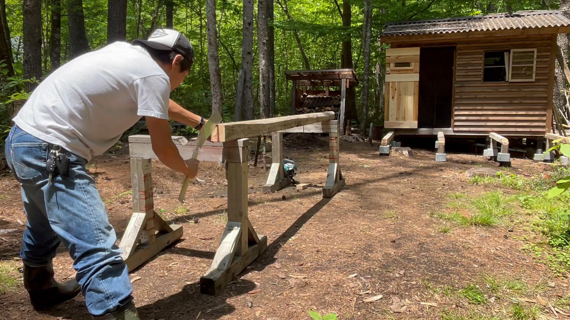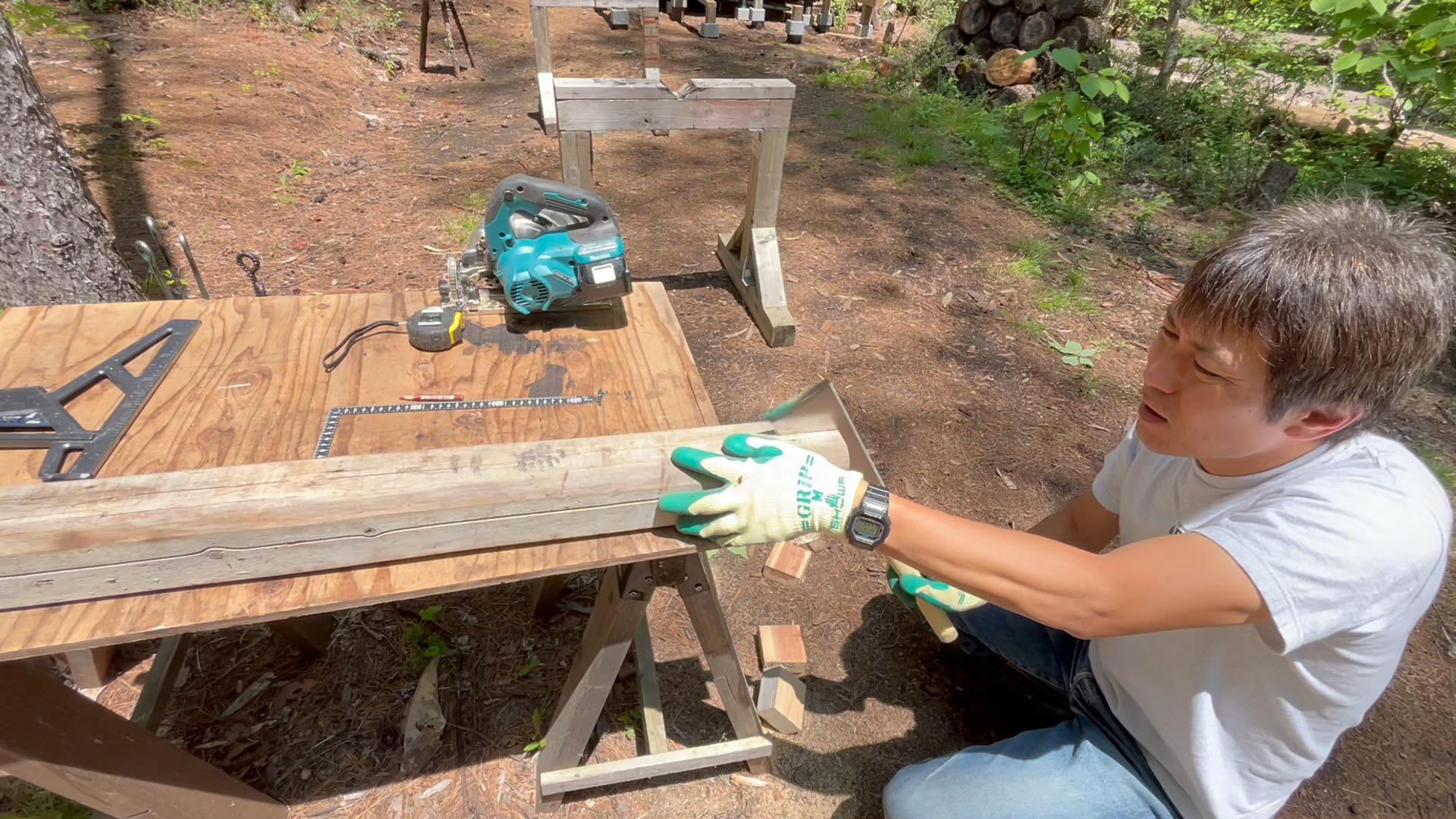 縦の土台を4本並べてその内の2本の切り欠き加工が完了しています。
