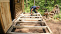 只今自作の山小屋の正面にウッドデッキを作っています。