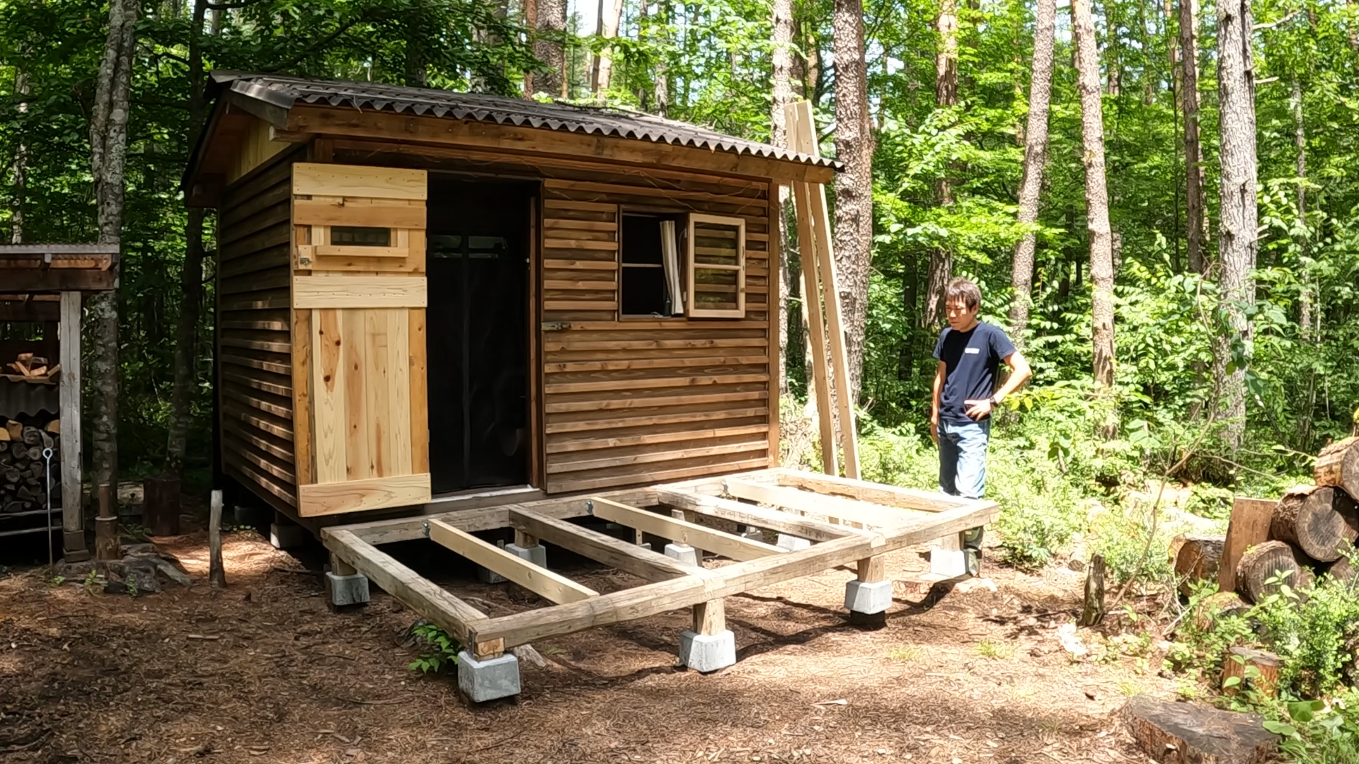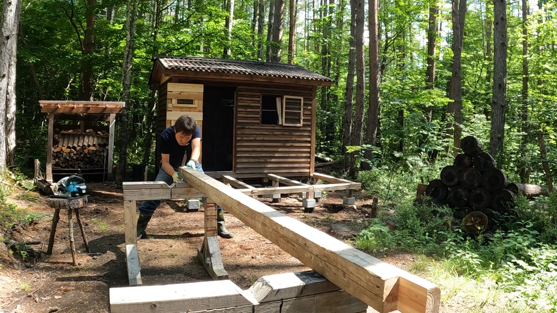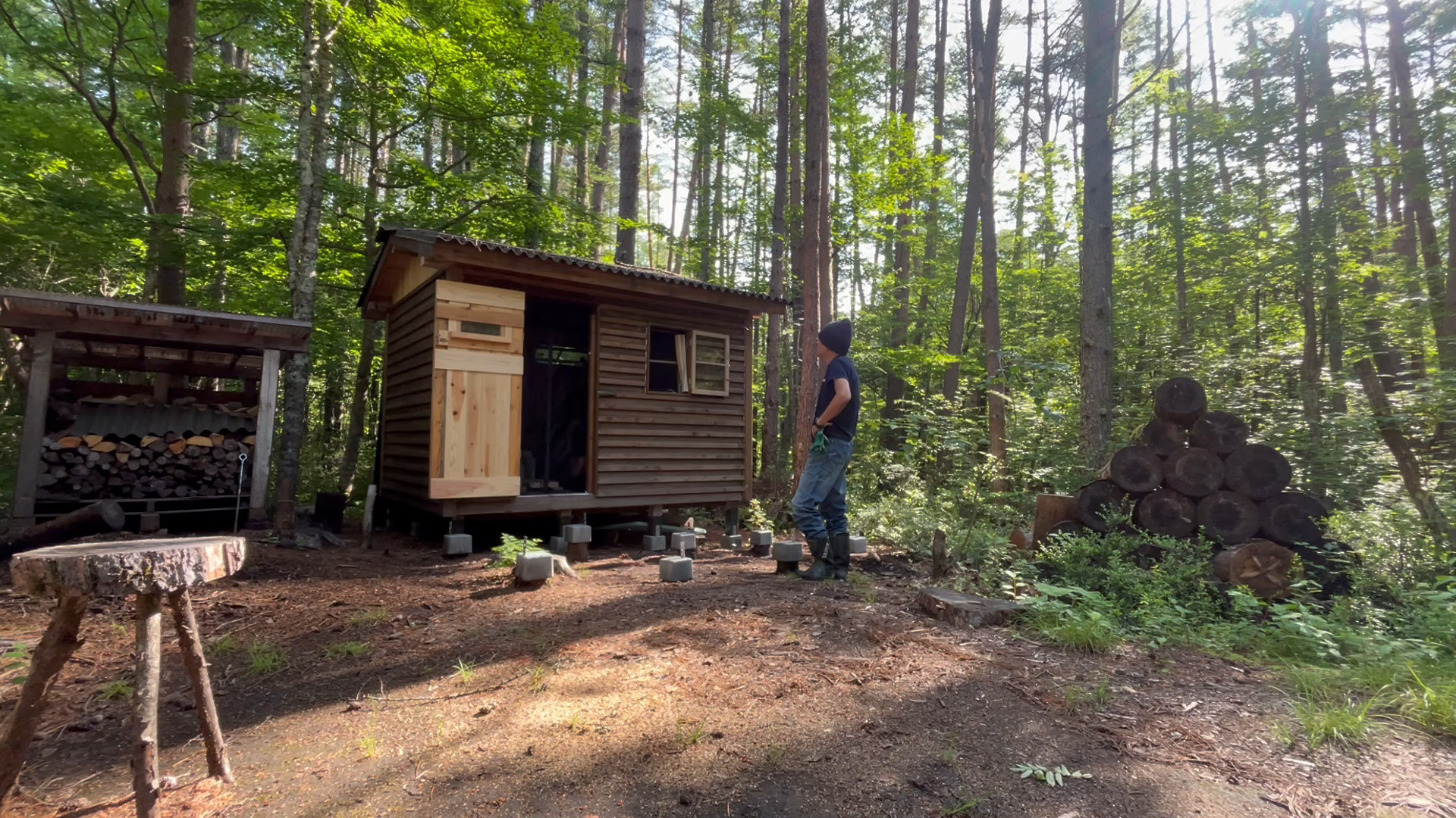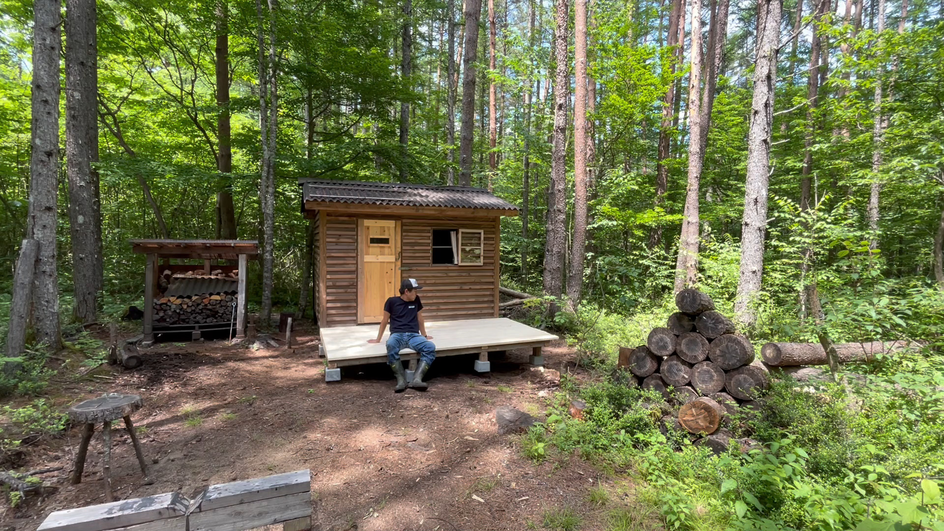 2020年の8月に開拓をスタートして、物置小屋、薪棚、雨水貯水システム、そして小さな小さな山小屋を建てました。