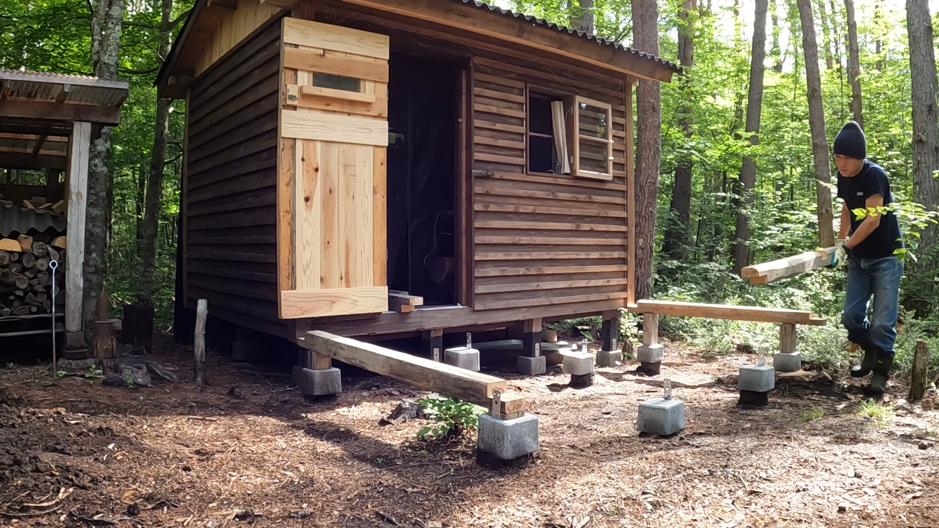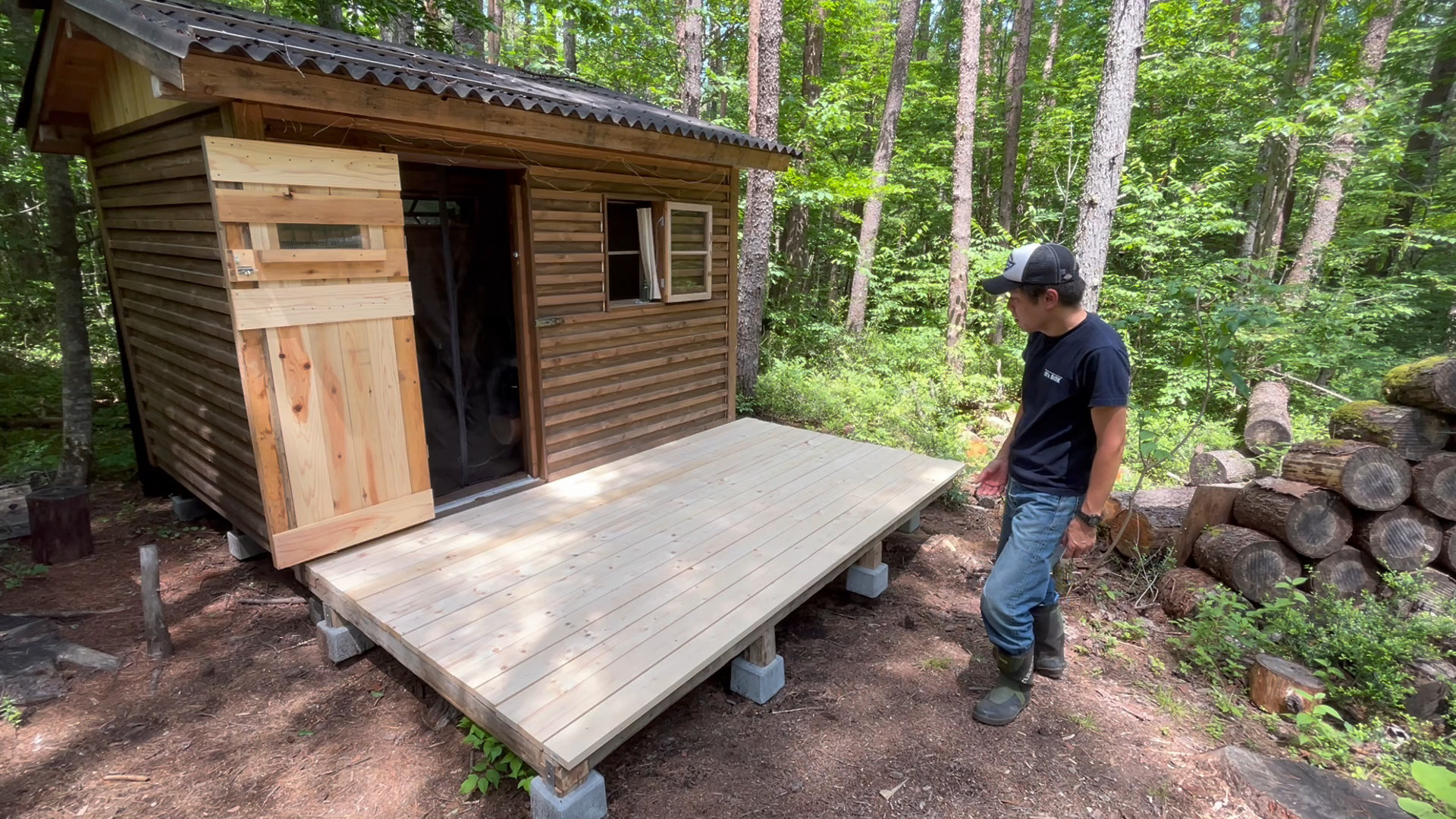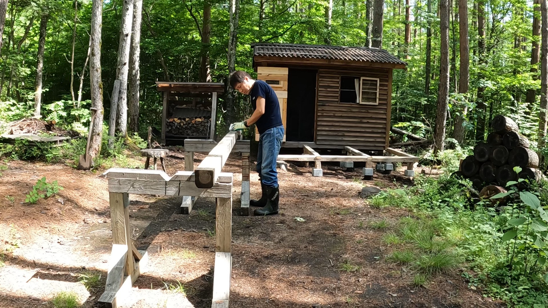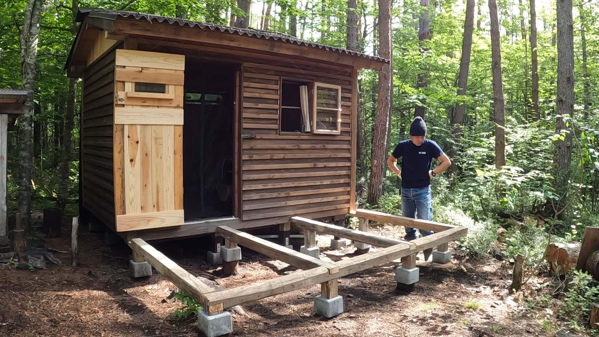 2020年の8月に開拓をスタートして、物置小屋、薪棚、雨水貯水システム、そして小さな小さな山小屋を建てました。