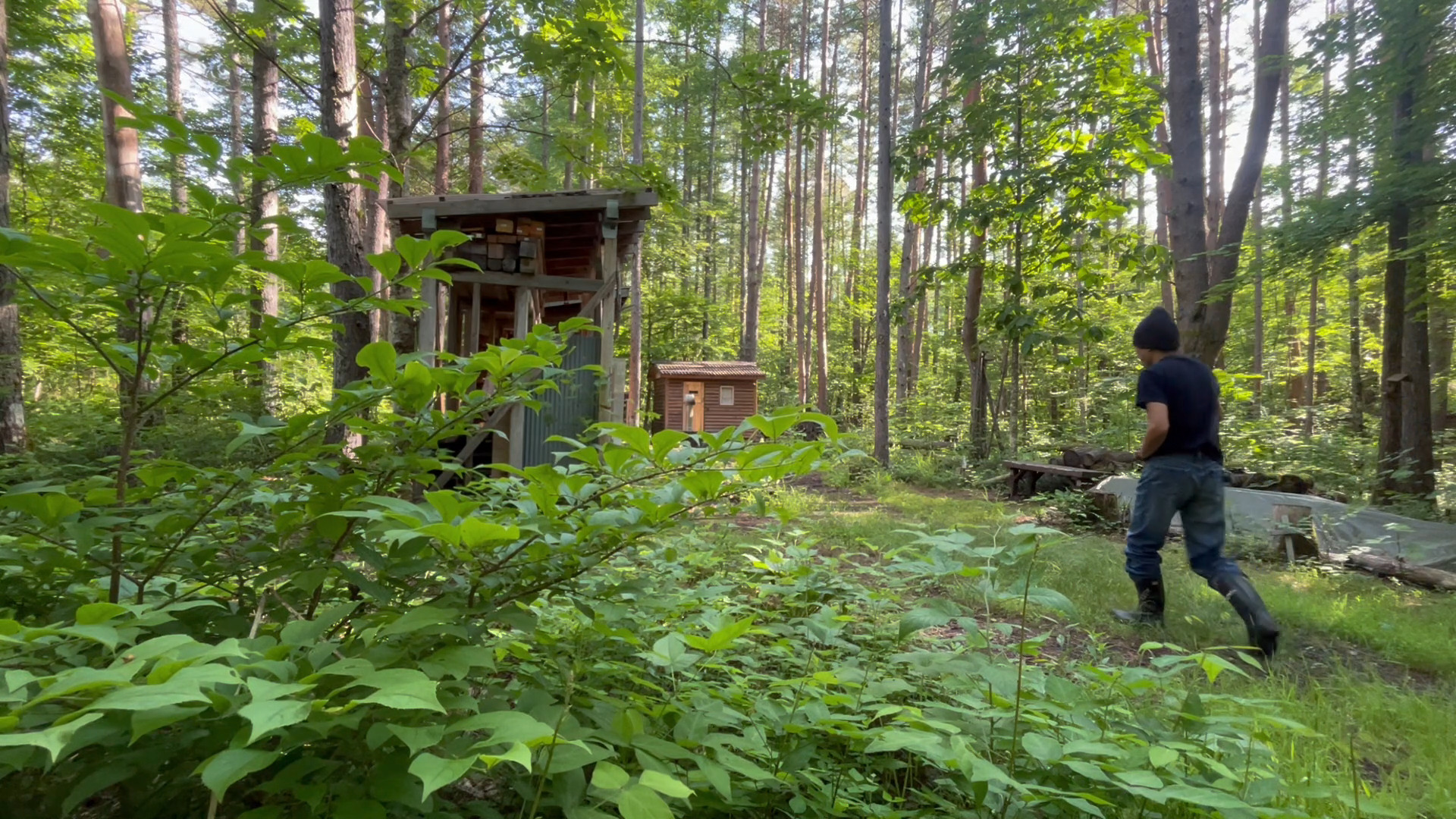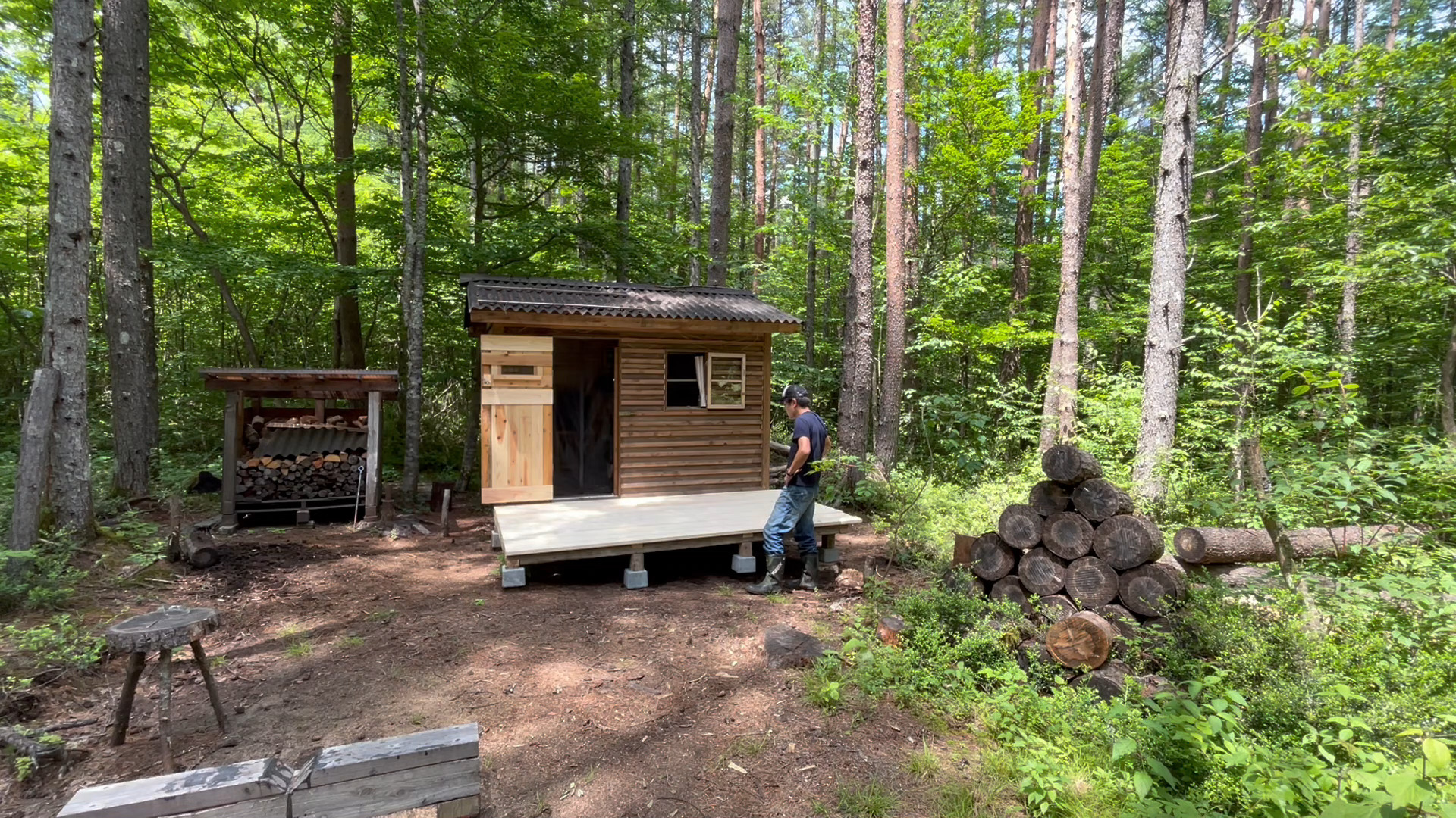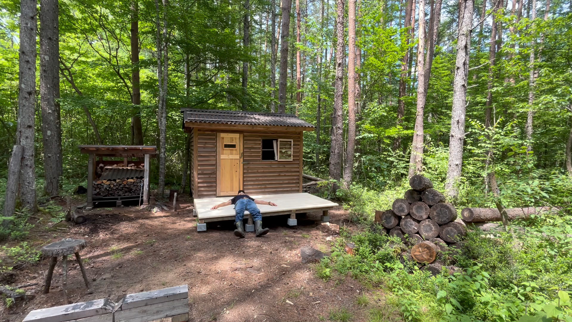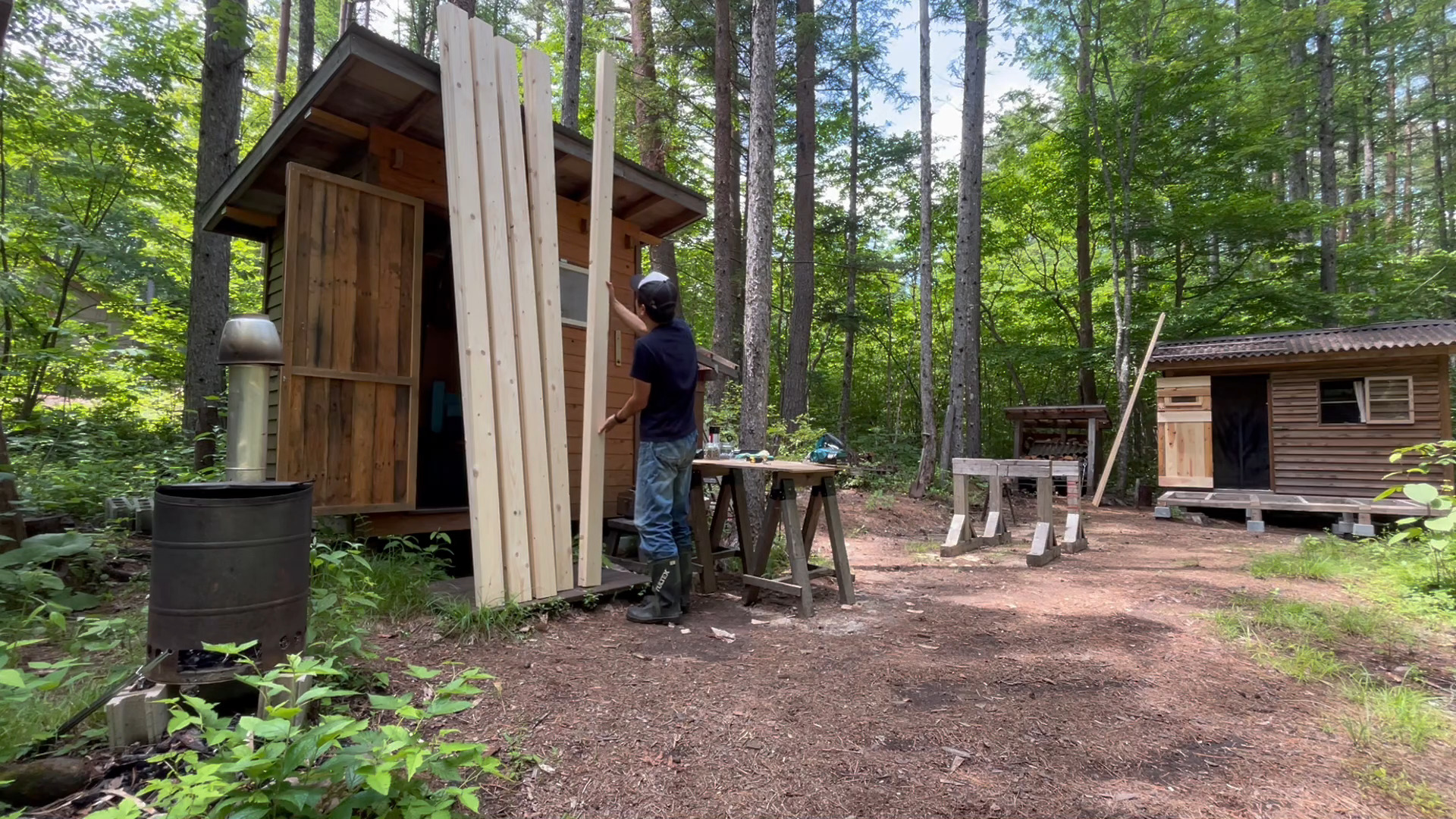 2020年の8月に開拓をスタートして、物置小屋、薪棚、雨水貯水システム、そして小さな小さな山小屋を建てました。