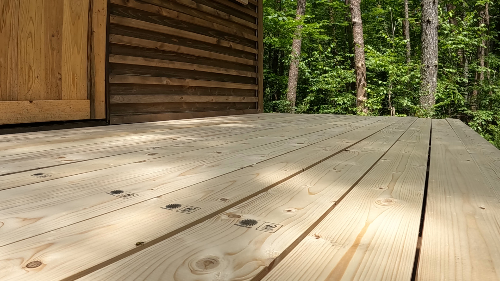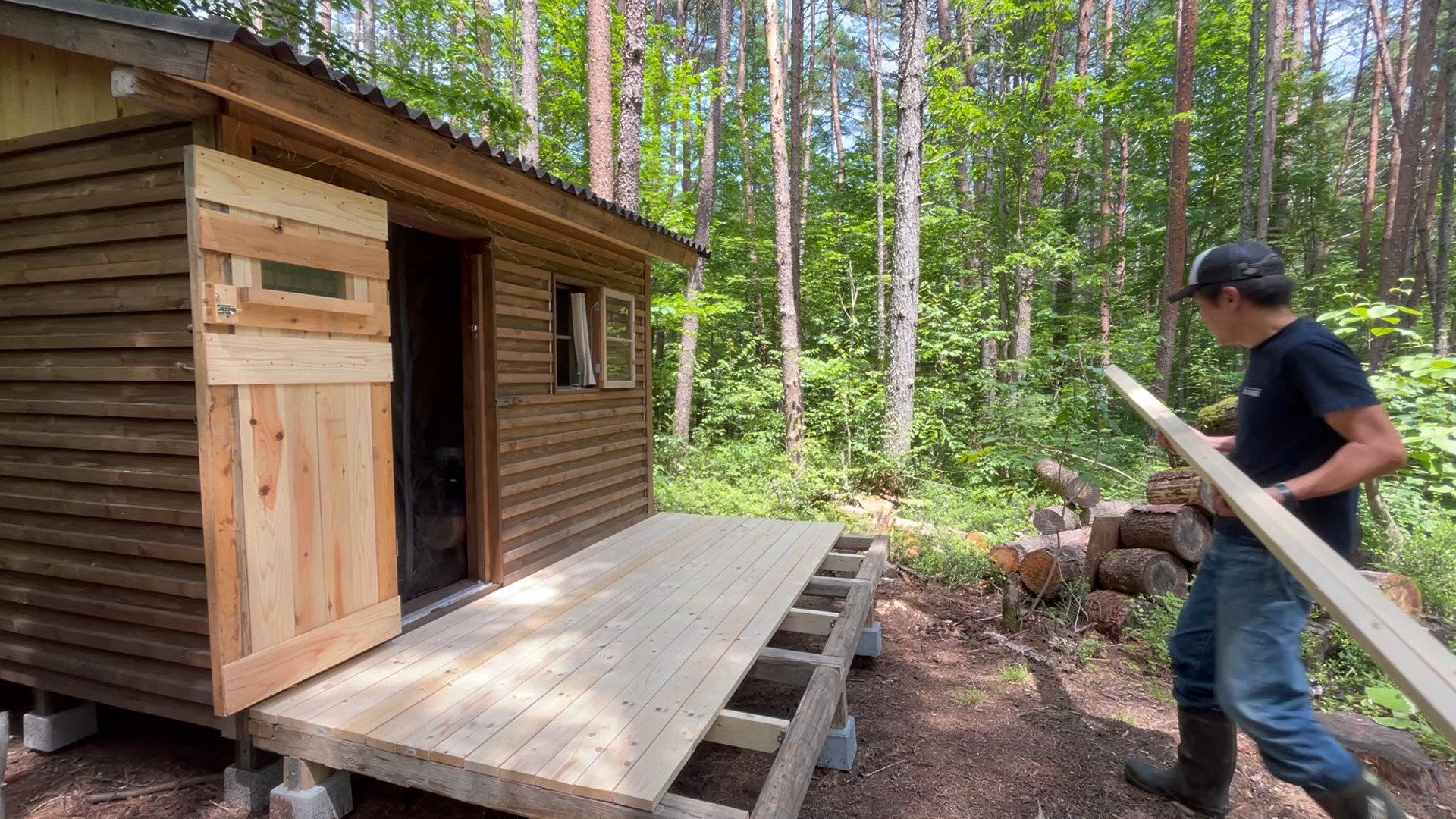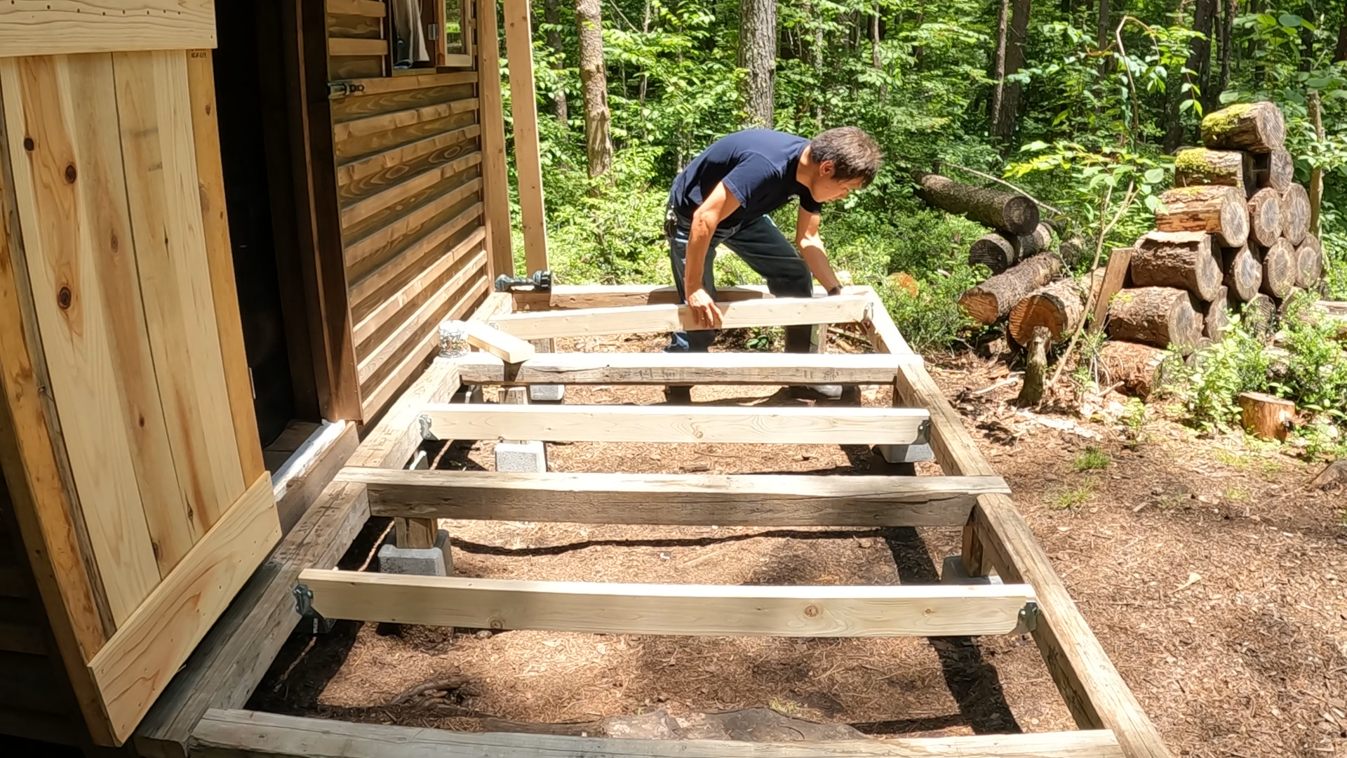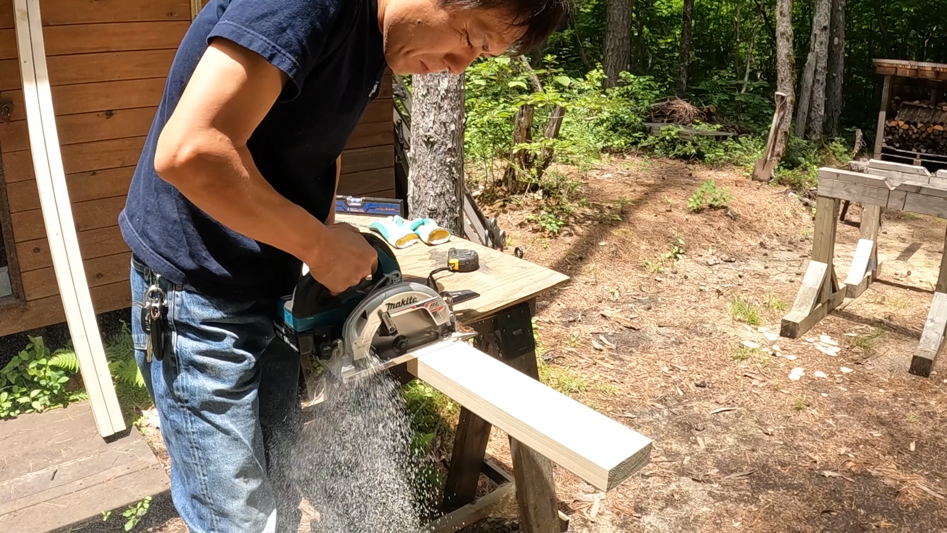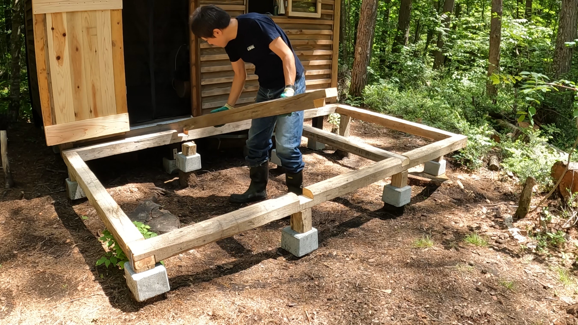 只今自作の山小屋の正面にウッドデッキを作っています。