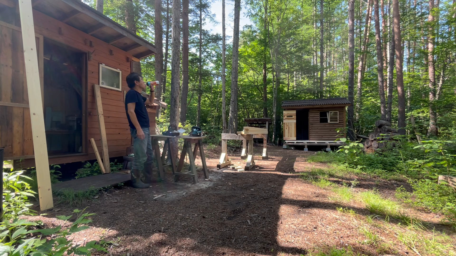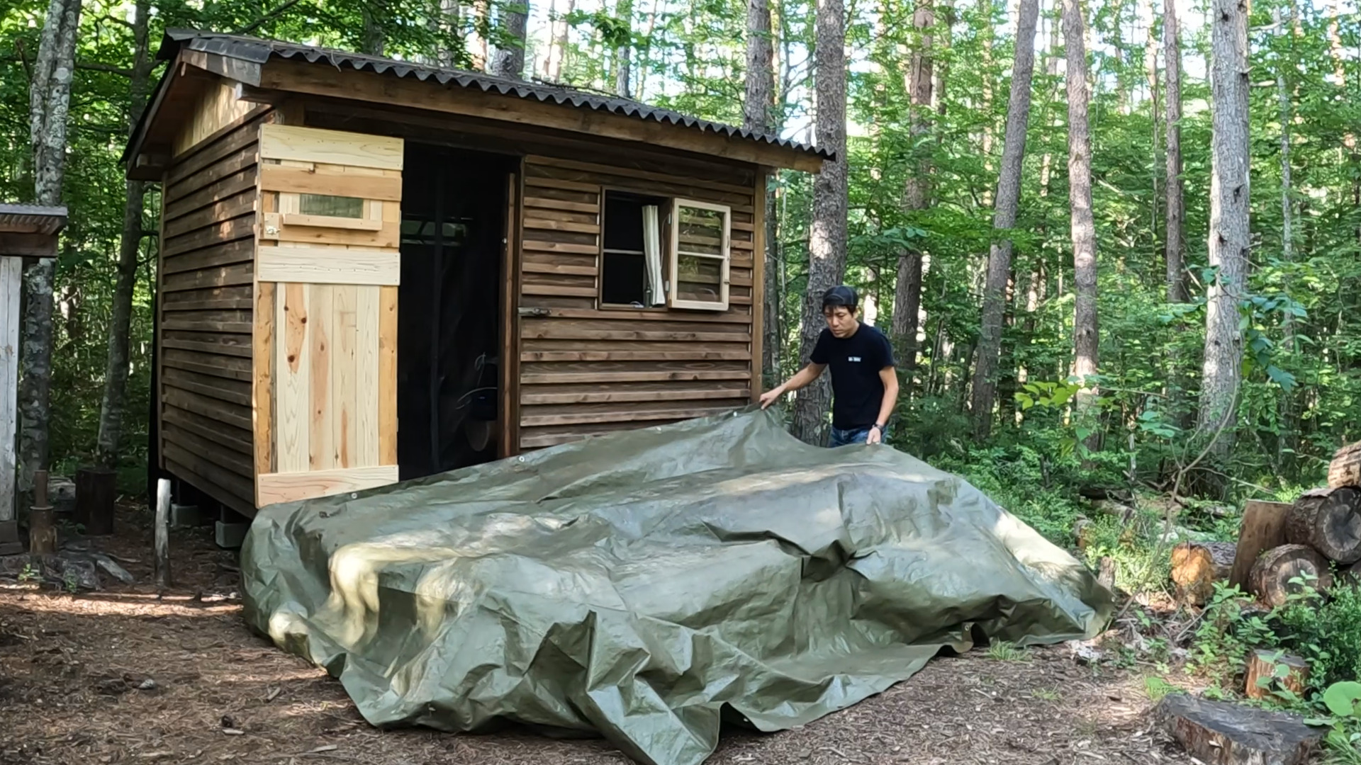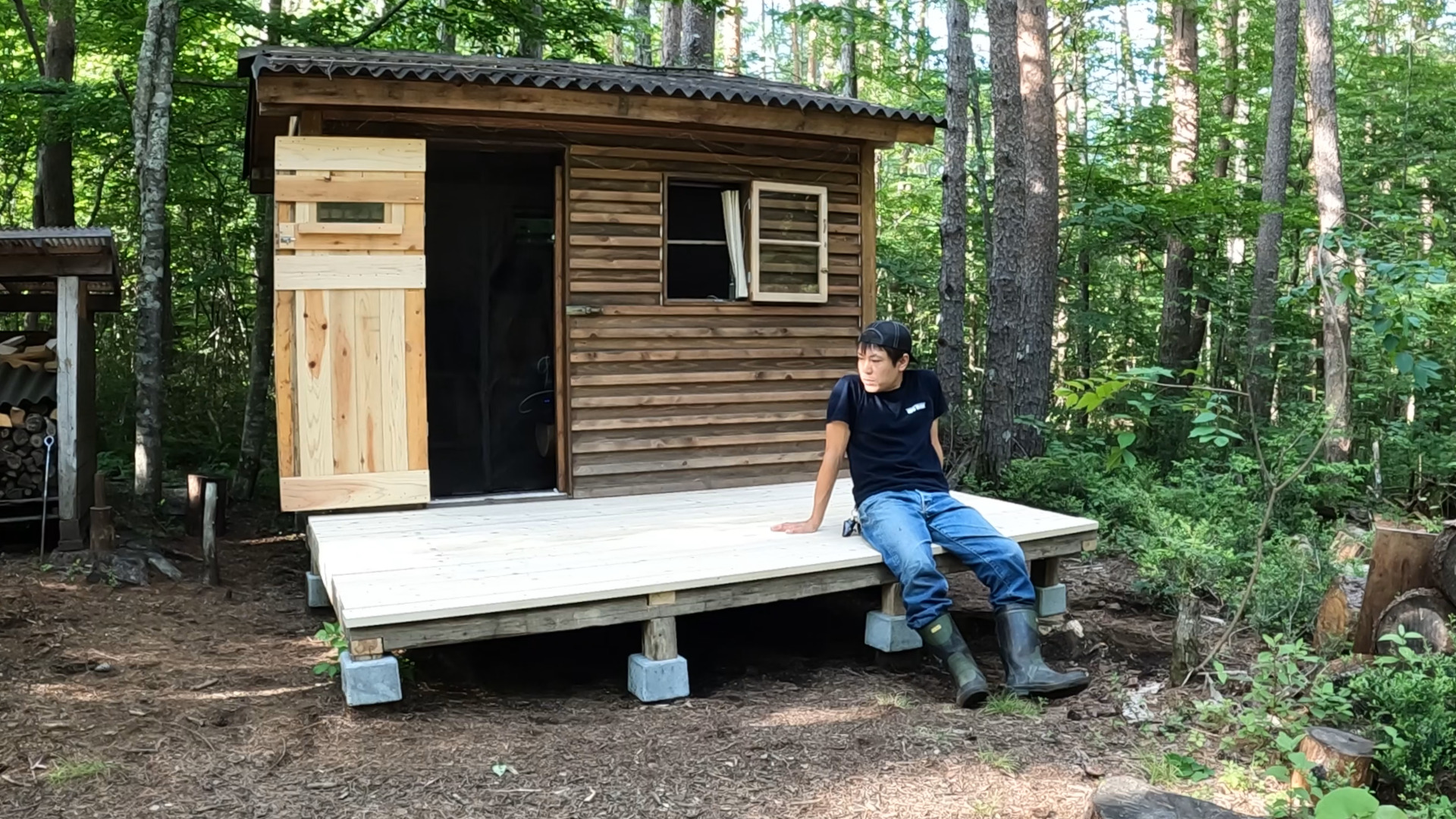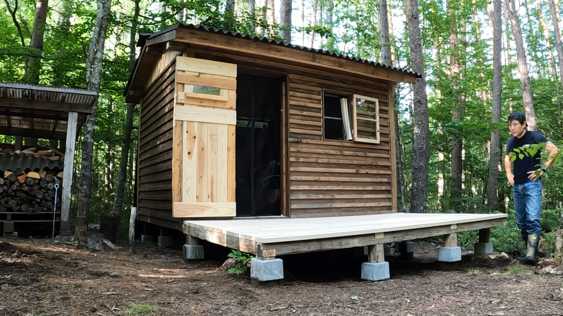 2020年の8月に開拓をスタートして、物置小屋、薪棚、雨水貯水システム、そして小さな小さな山小屋を建てました。