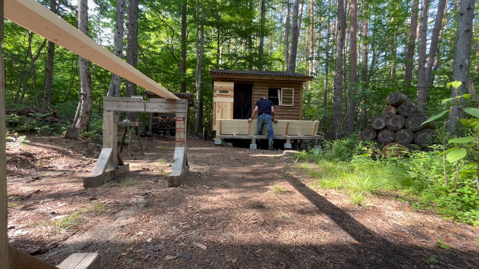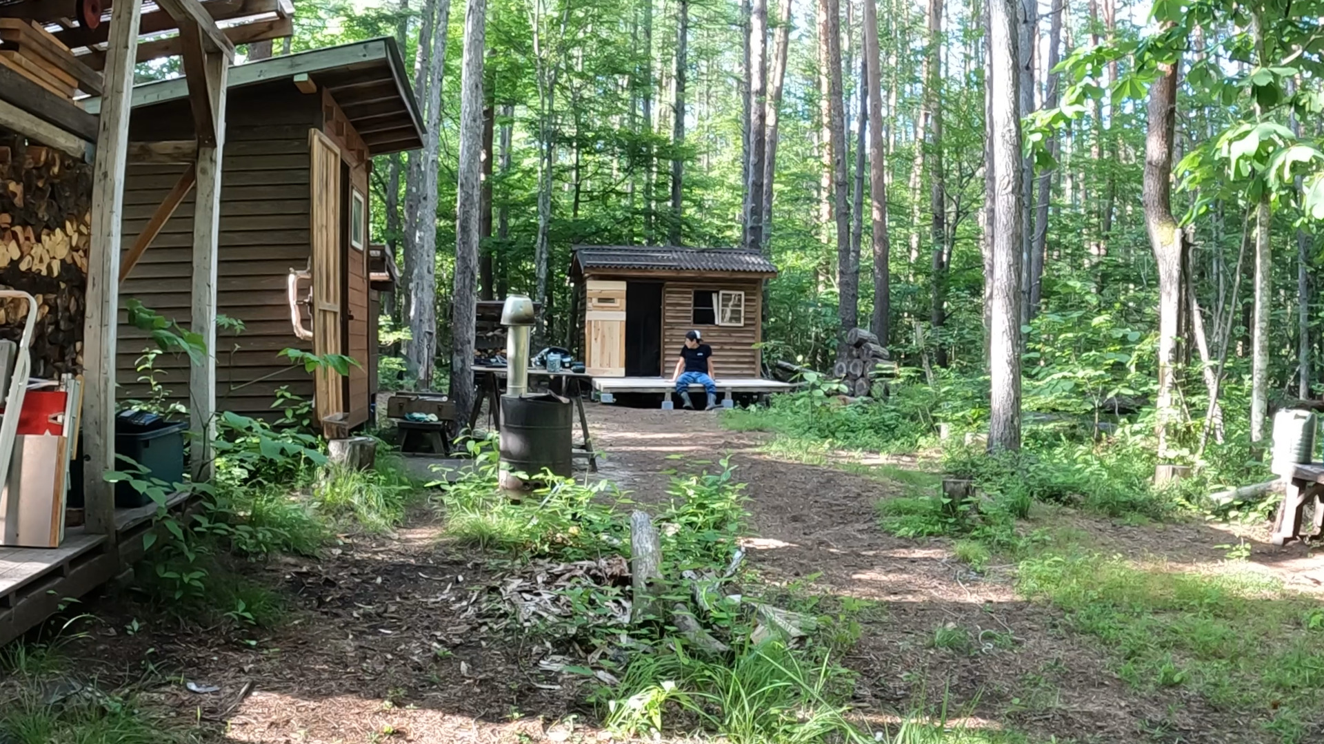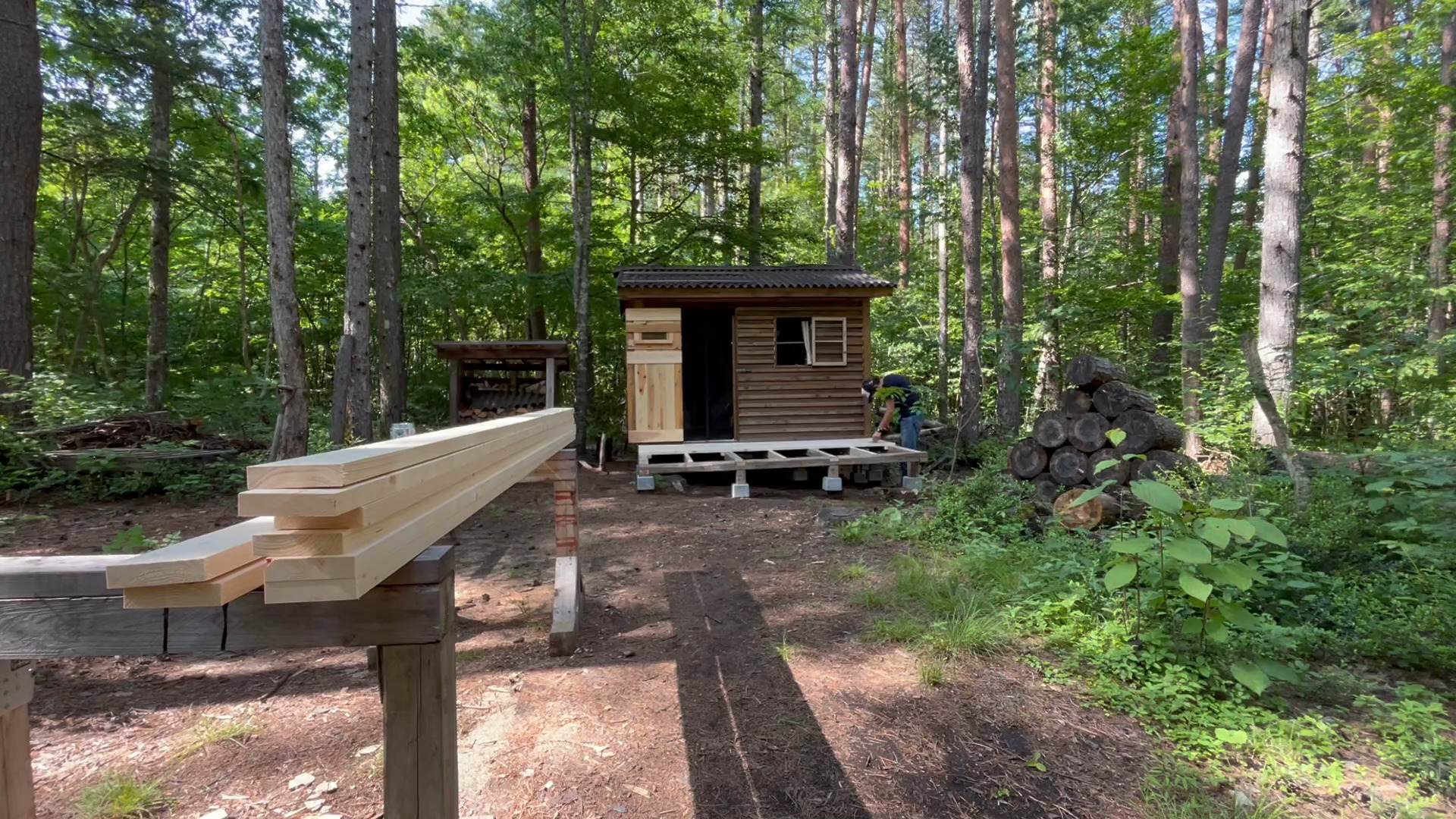 2020年の8月に開拓をスタートして、物置小屋、薪棚、雨水貯水システム、そして小さな小さな山小屋を建てました。