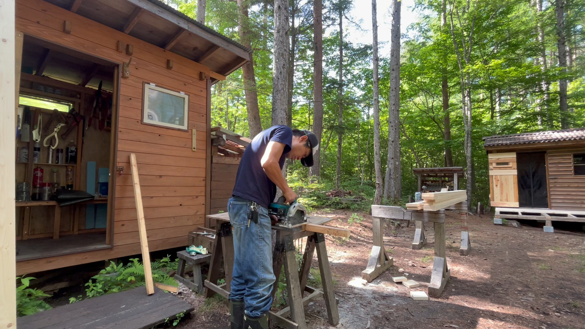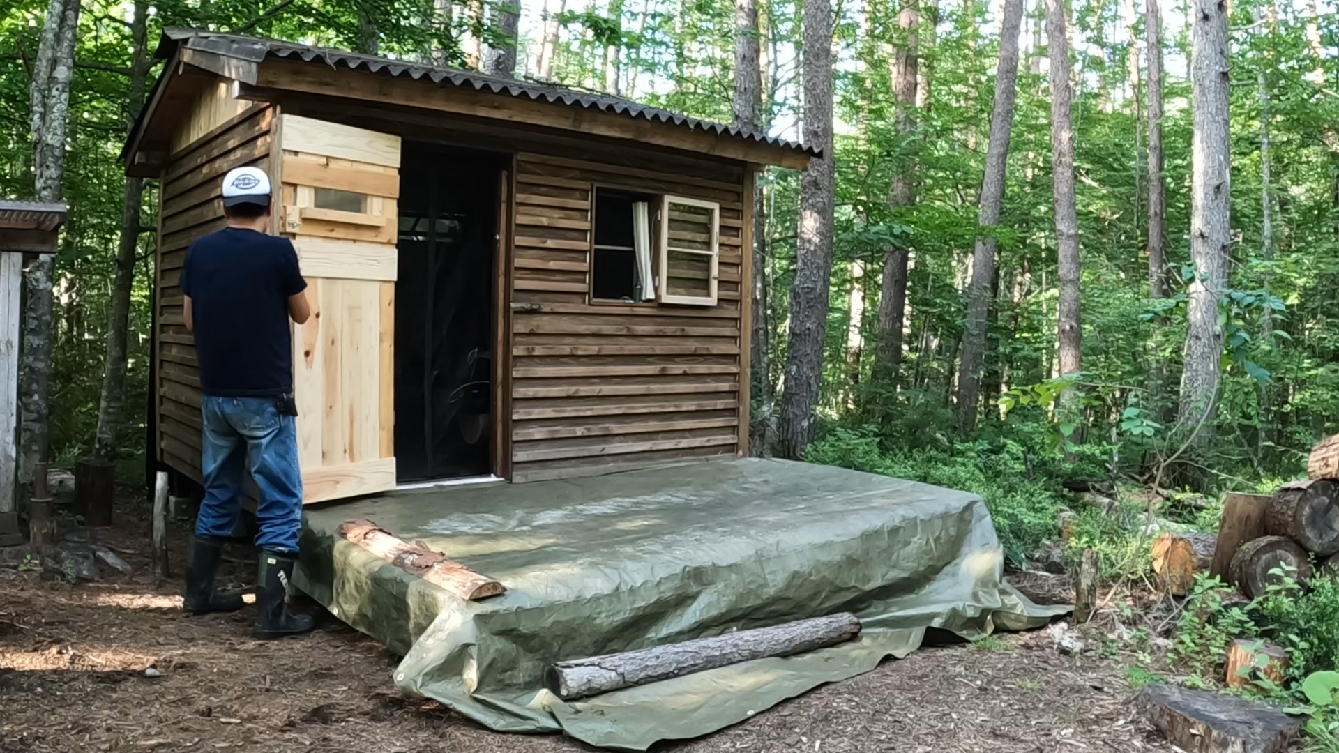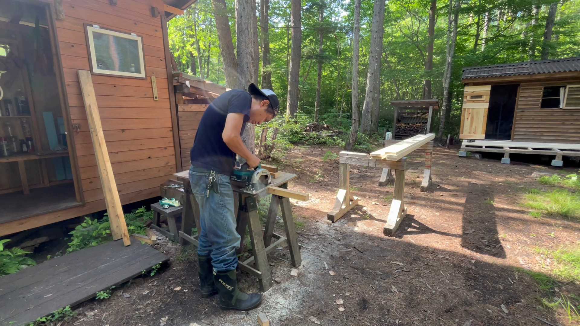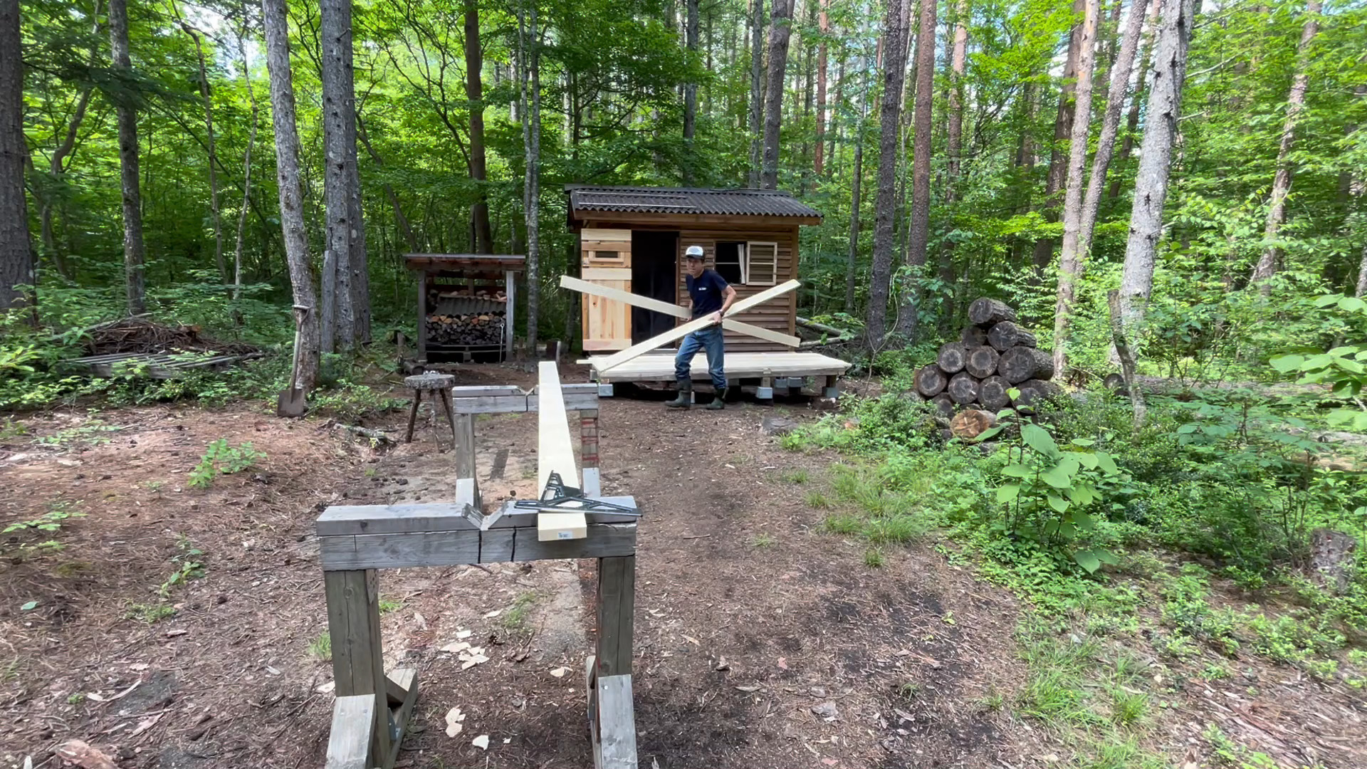 2020年の8月に開拓をスタートして、物置小屋、薪棚、雨水貯水システム、そして小さな小さな山小屋を建てました。