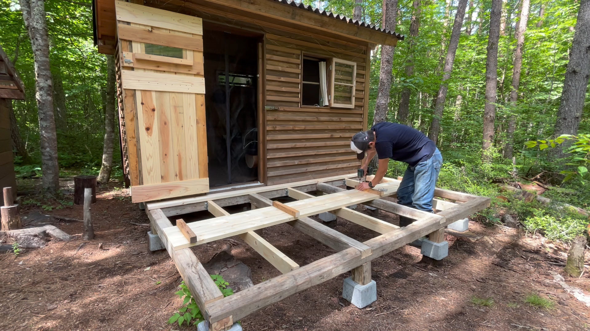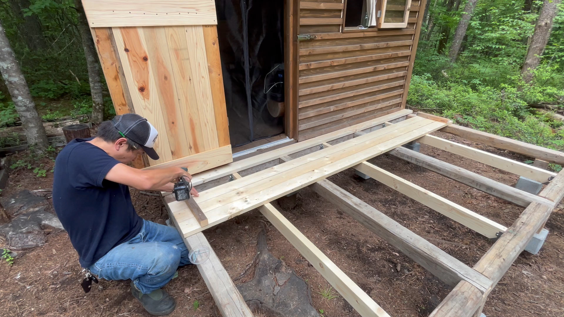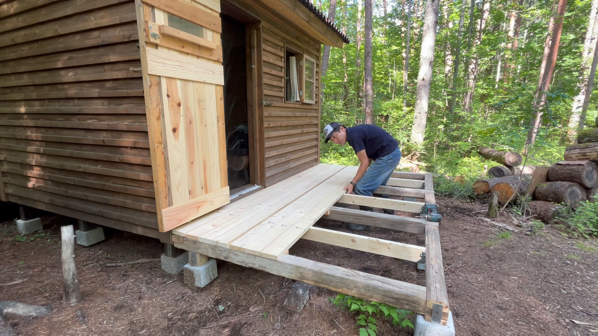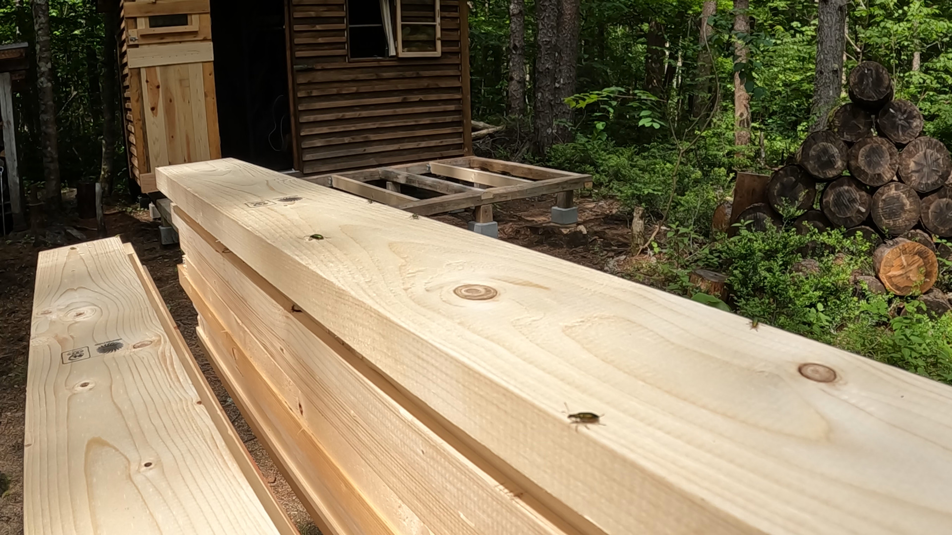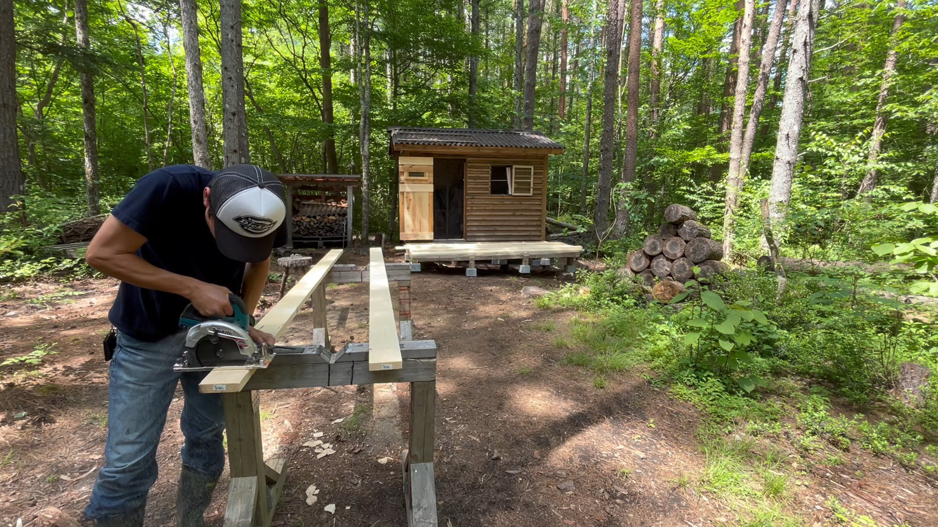 只今自作の山小屋の正面にウッドデッキを作っています。