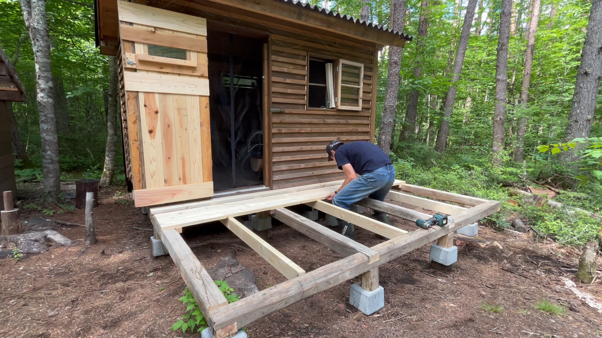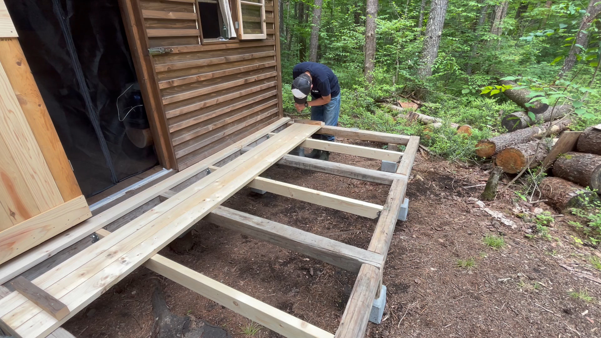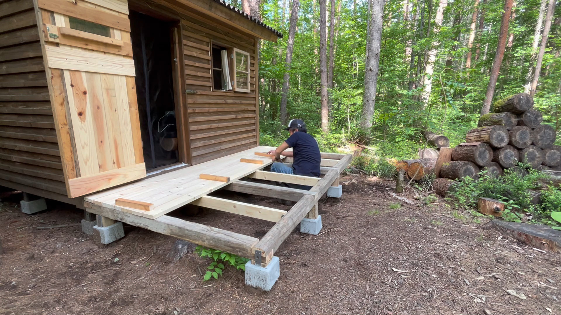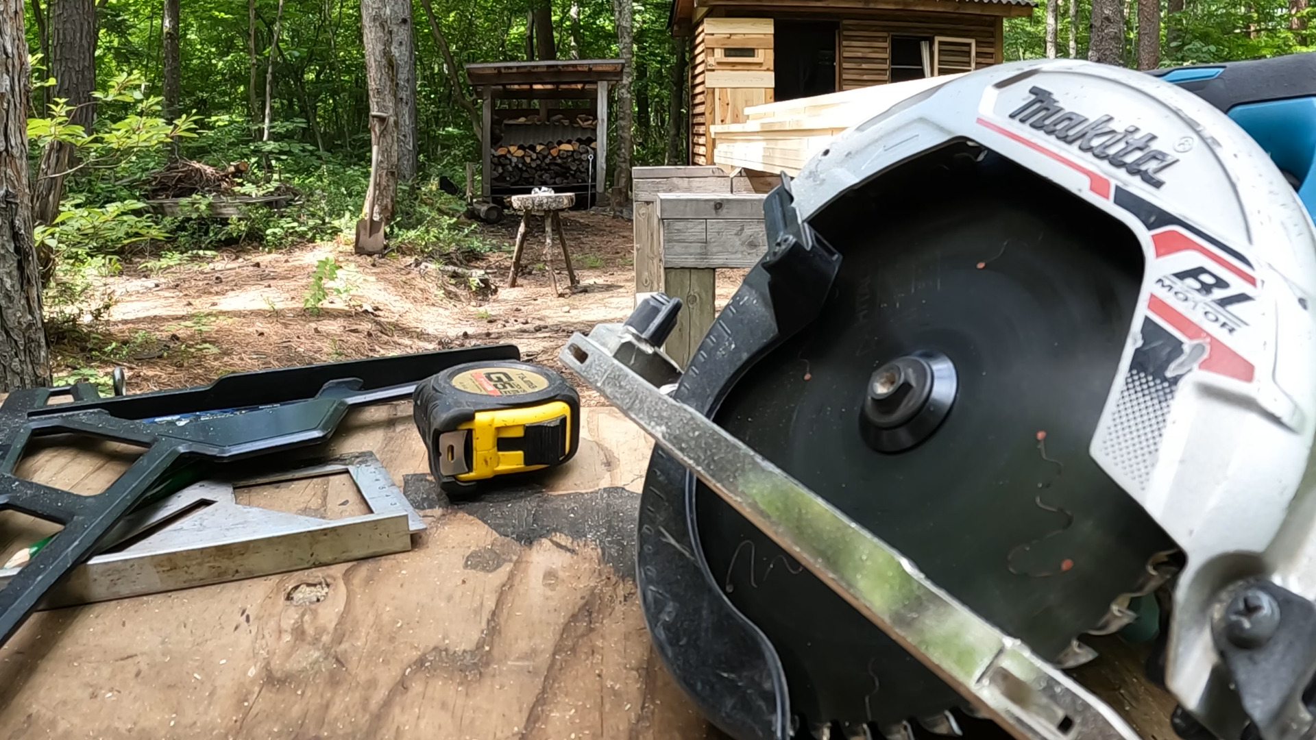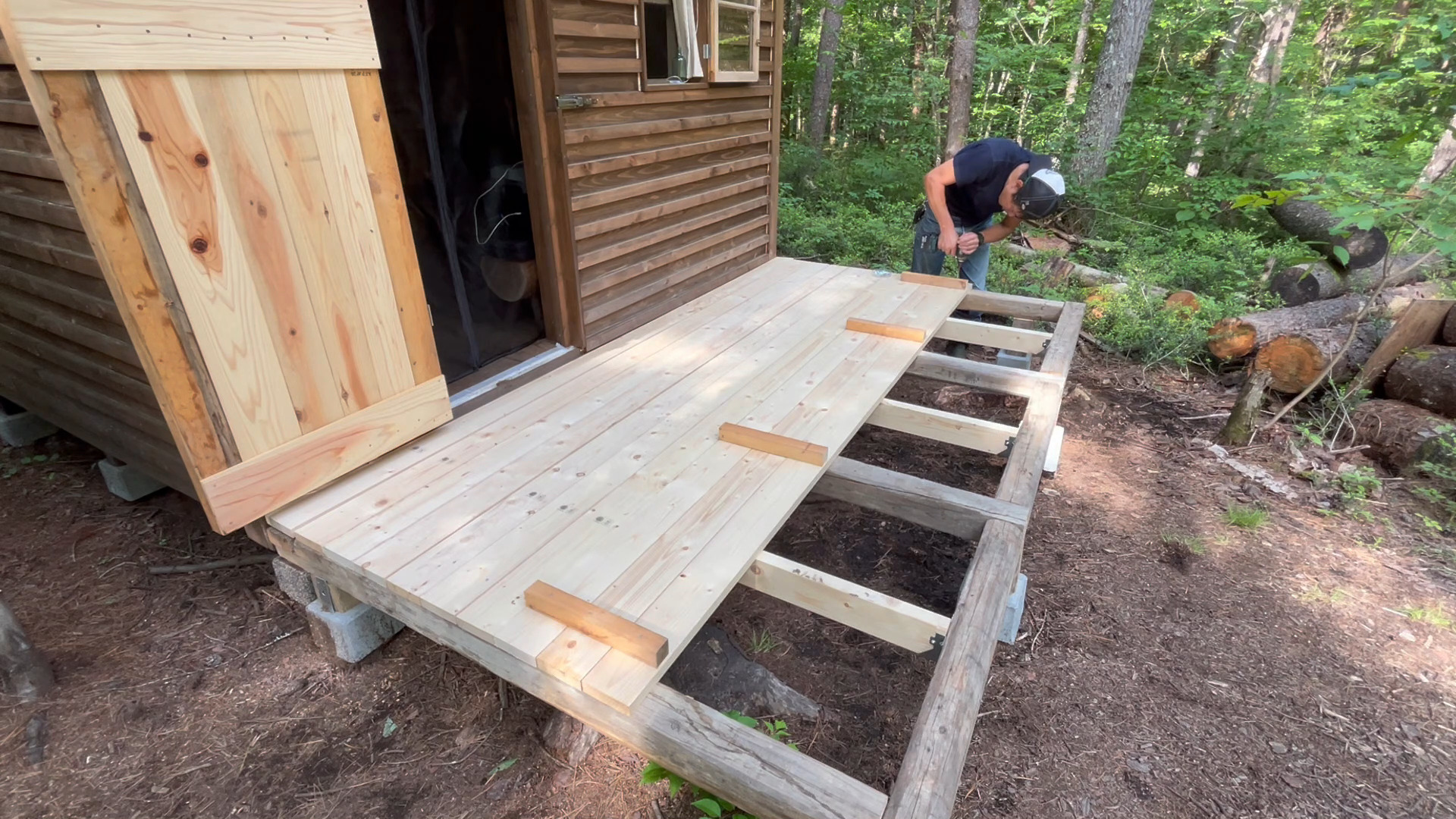 只今自作の山小屋の正面にウッドデッキを作っています。