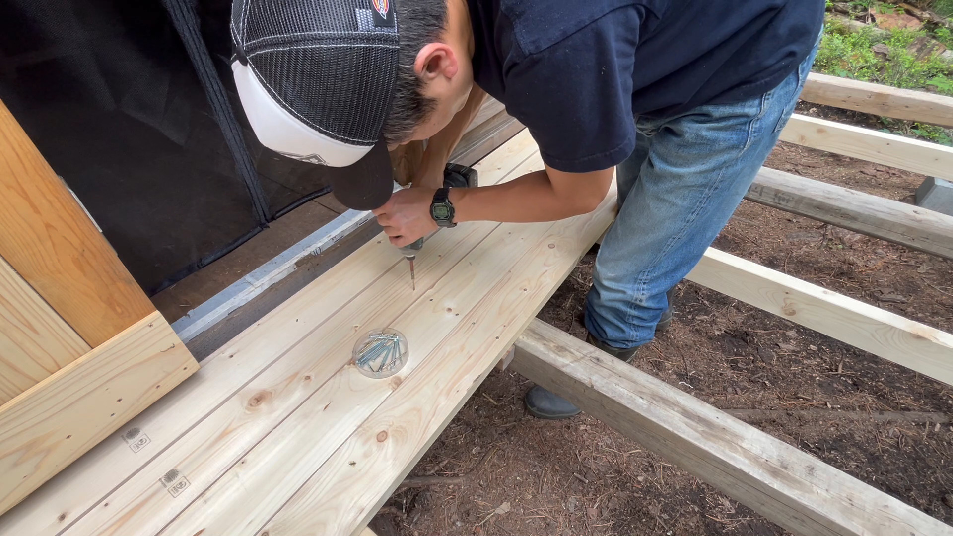 通常は土台に床板を直接ビスで止めて行くと思いますが今回はこんな感じで角材を使って板を固定していきます。