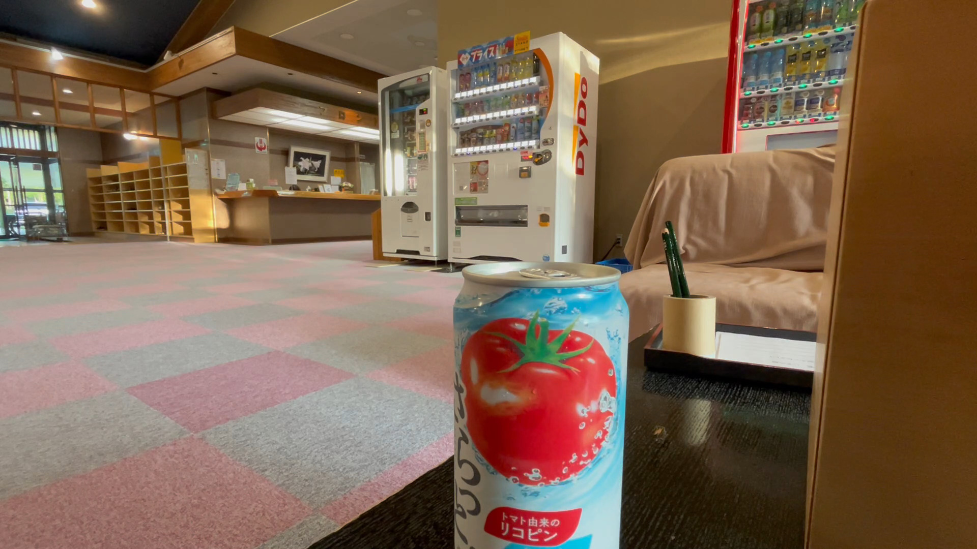 温泉で熱った体に冷たいトマトジュースが染み渡ります。