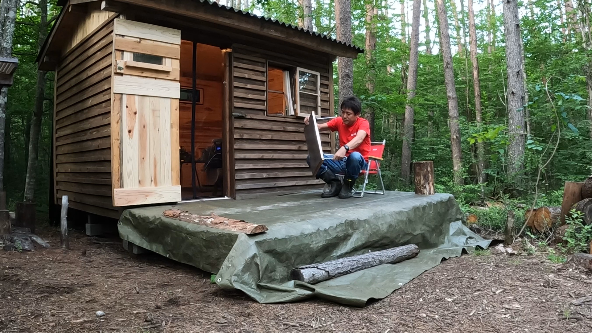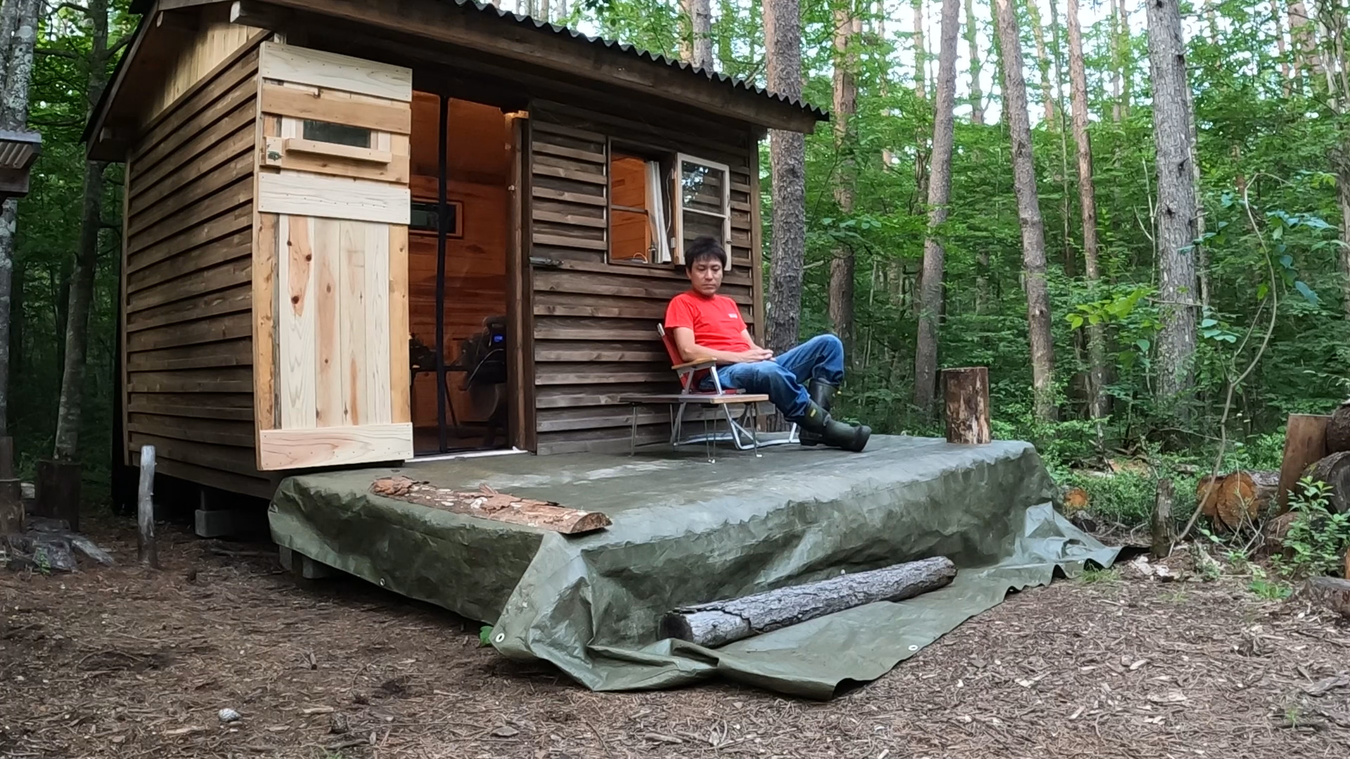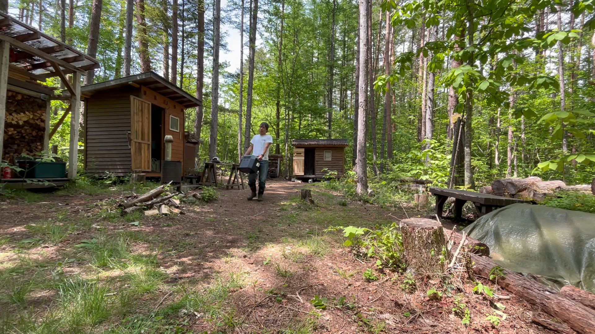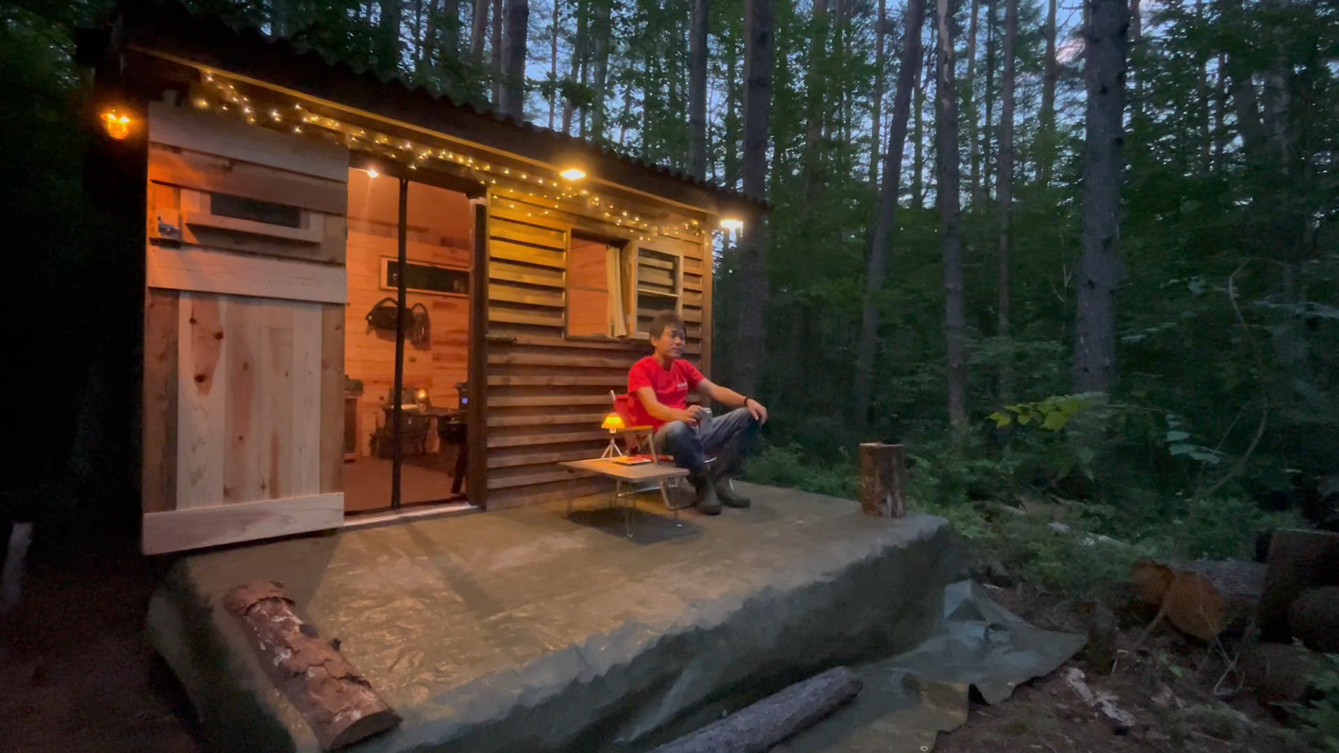 2020年の8月に開拓をスタートして、物置小屋、薪棚、雨水貯水システム、そして小さな小さな山小屋を建てました。