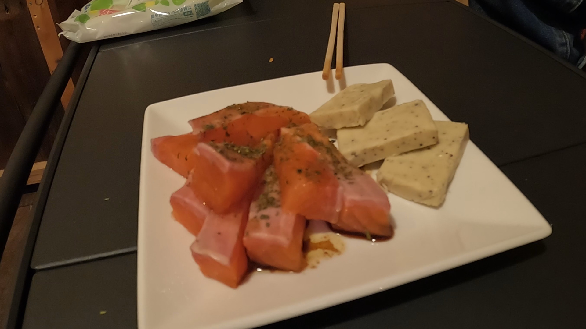オリーブオイル、醤油、塩胡椒で簡単にソースを作り近所の商店で買った信州サーモンにかけてカルパッチョを作りました。