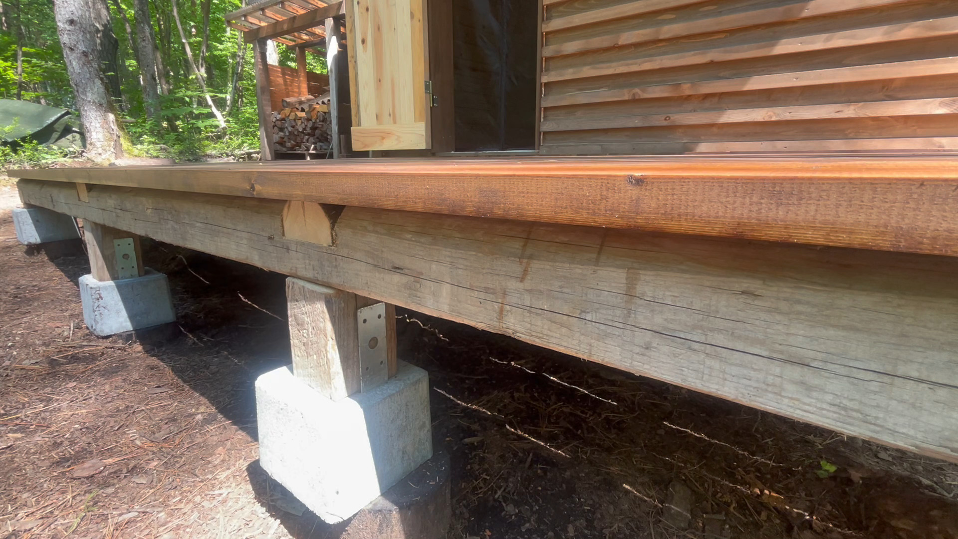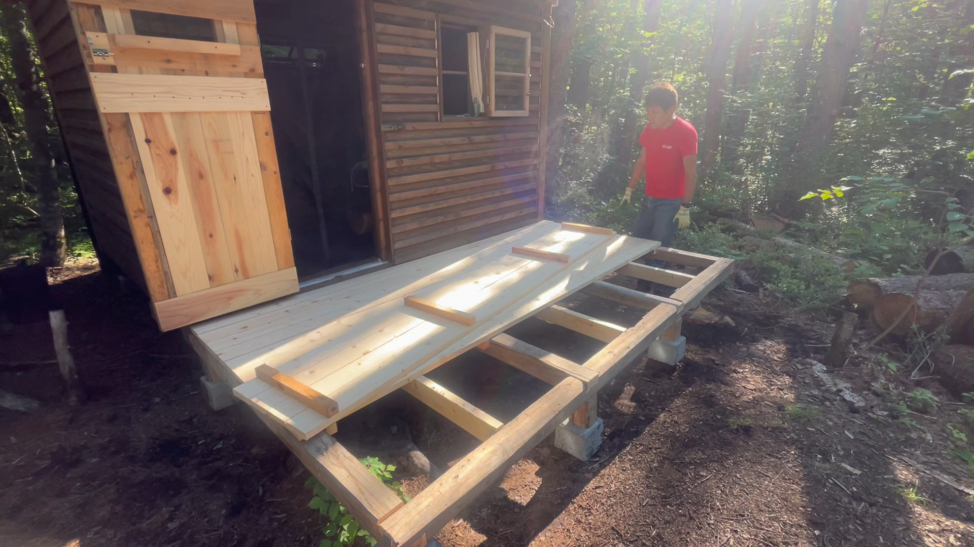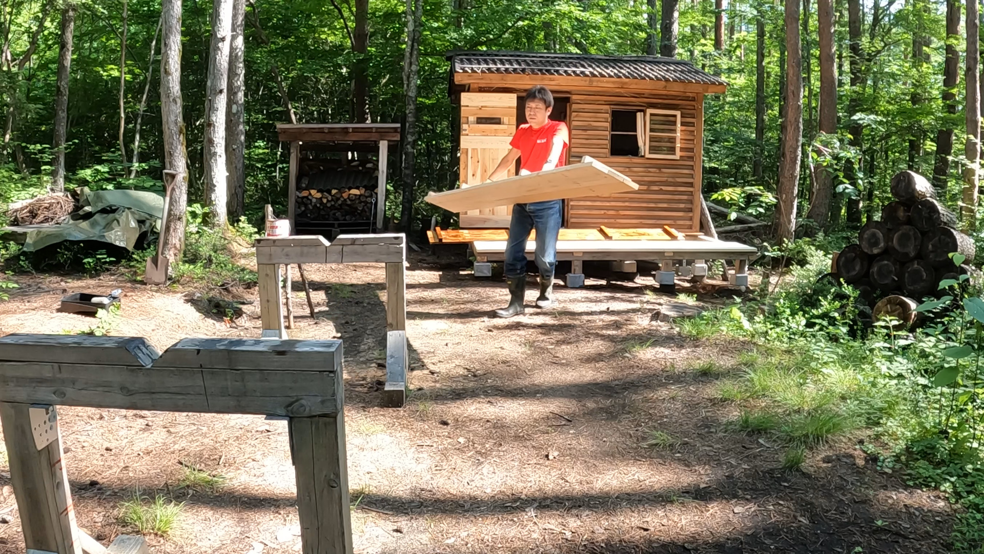 只今自作の山小屋の正面にウッドデッキを作っています。