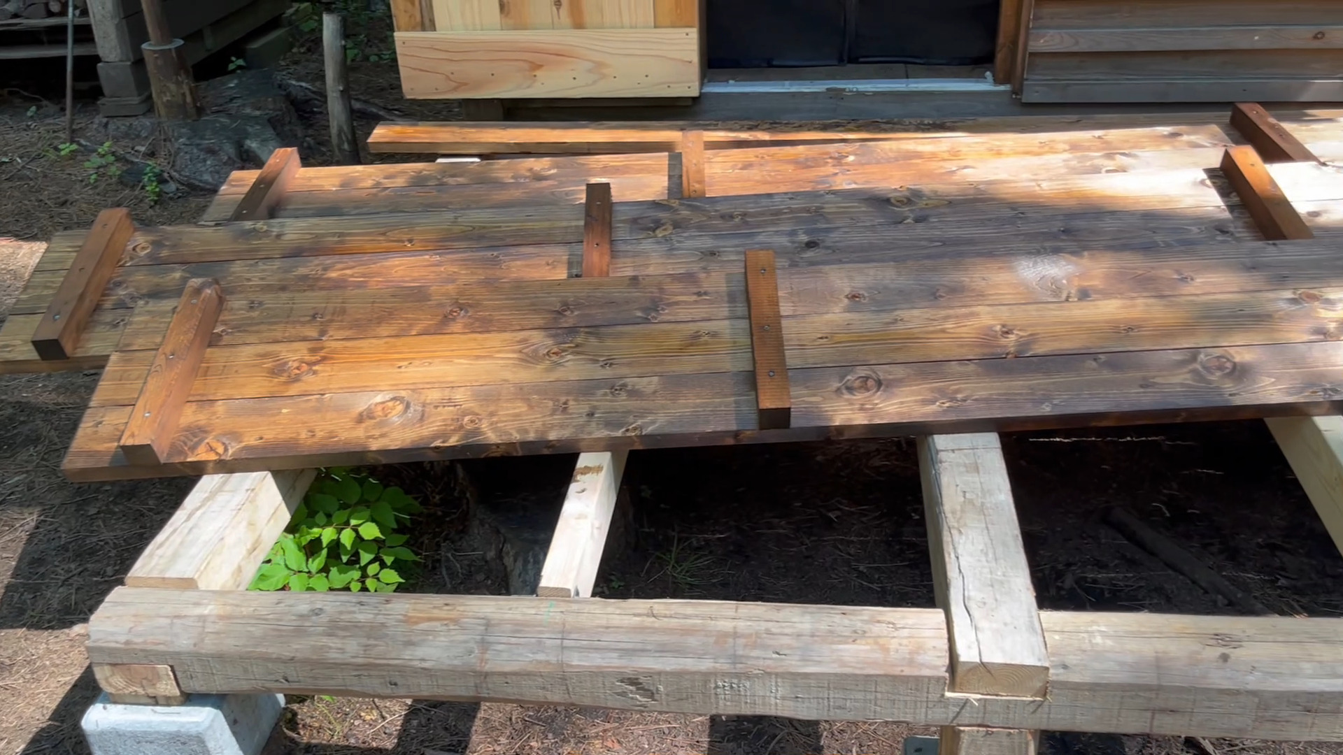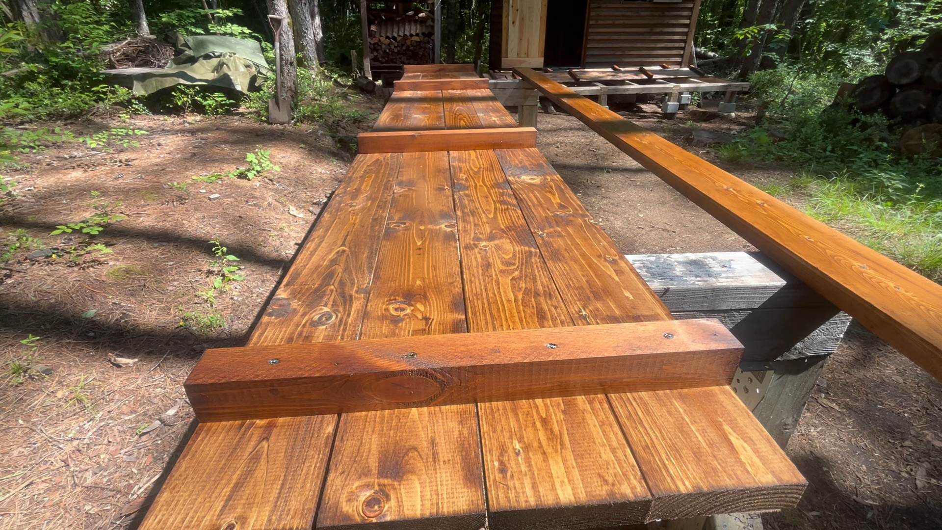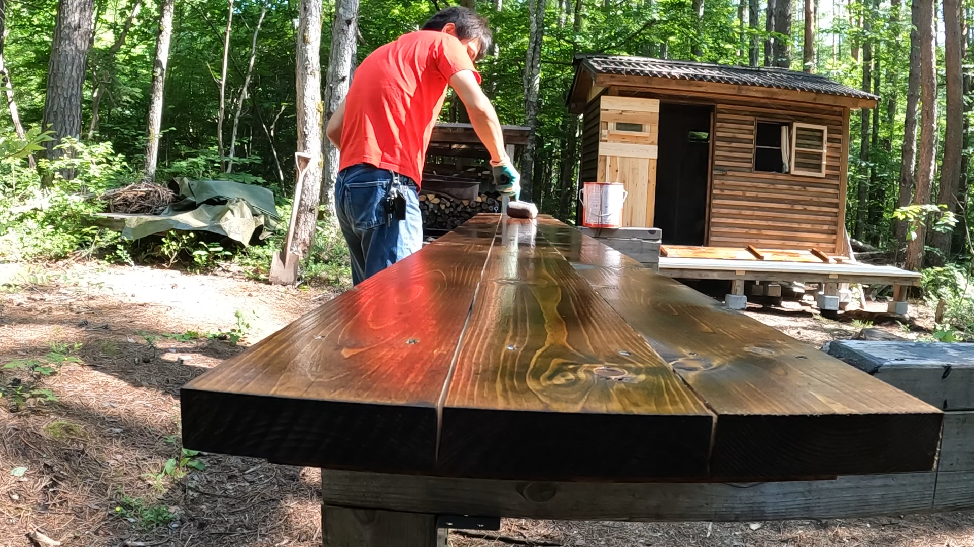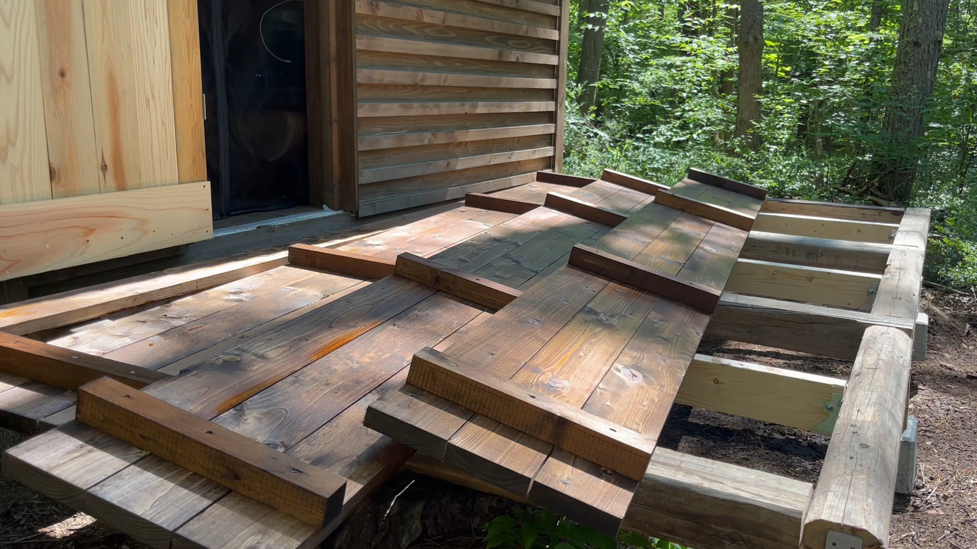 只今自作の山小屋の正面にウッドデッキを作っています。