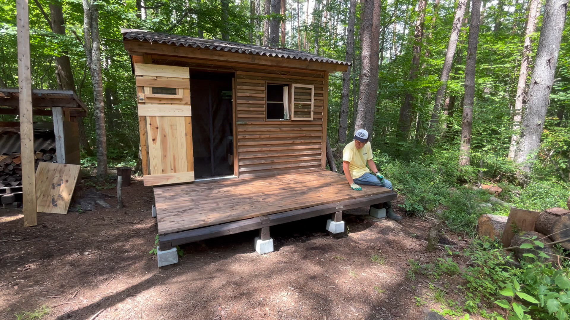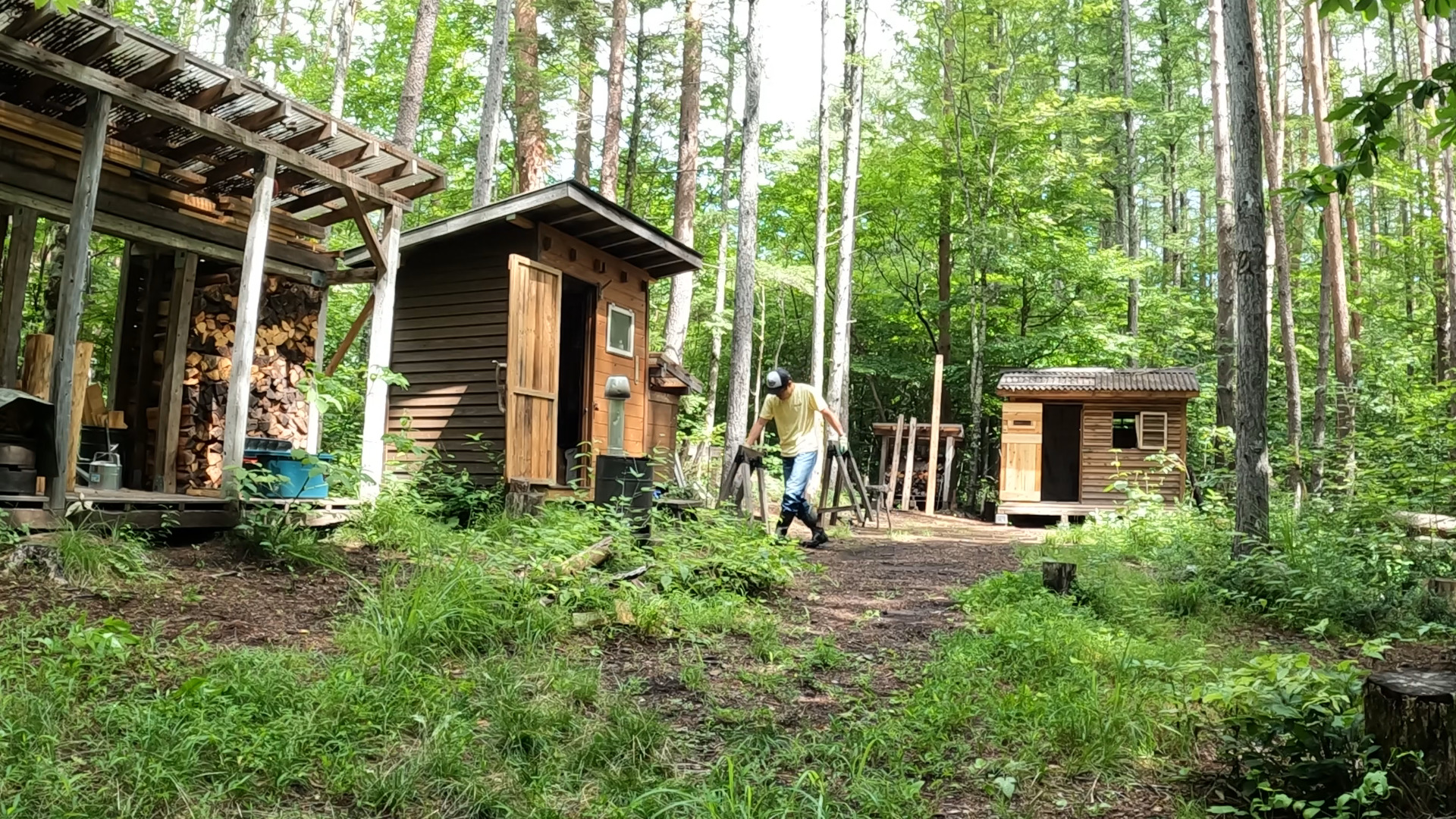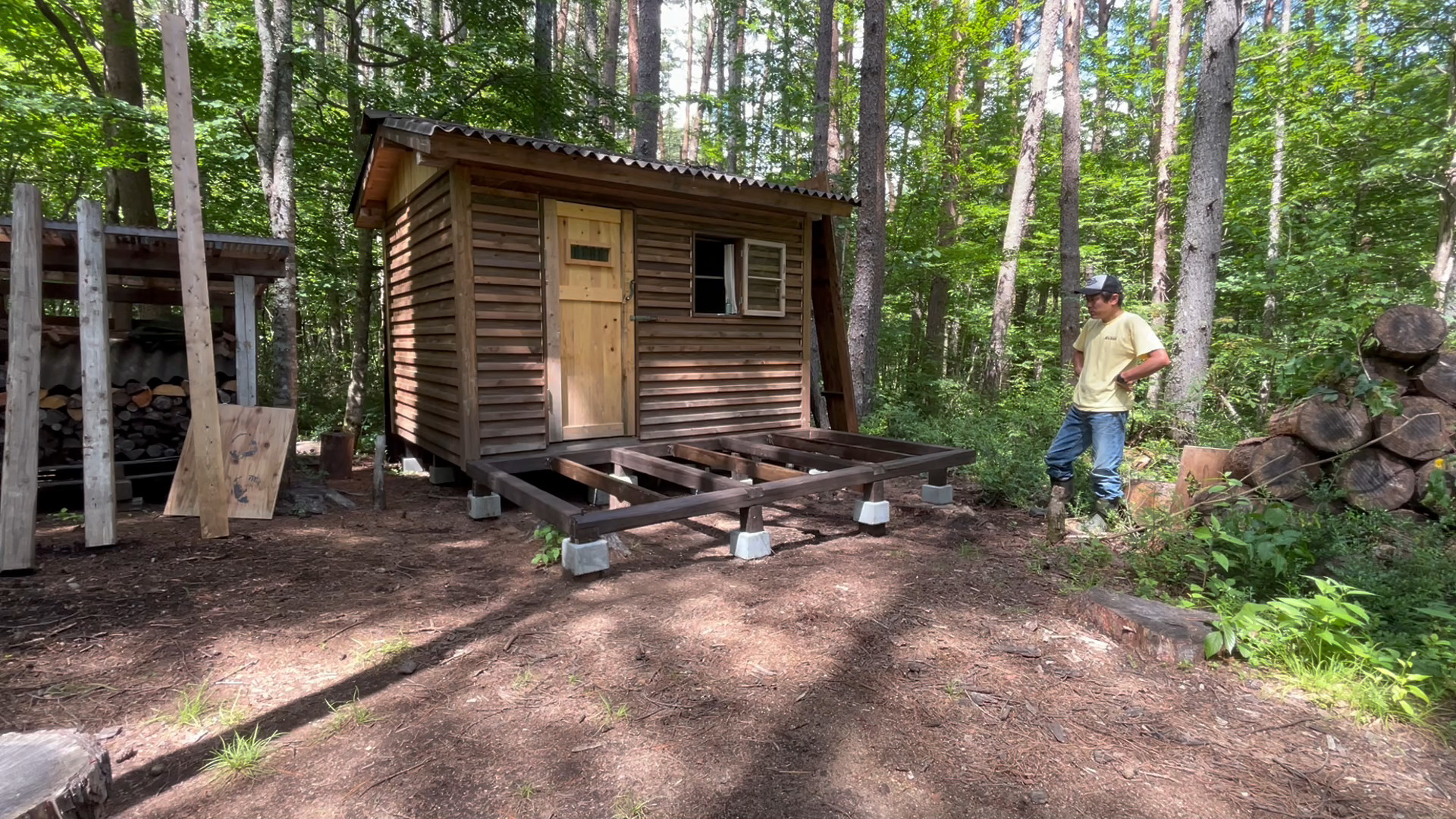 2020年の8月に開拓をスタートして、物置小屋、薪棚、雨水貯水システム、そして寝泊まり出来る小さな小さな山小屋を建てました。