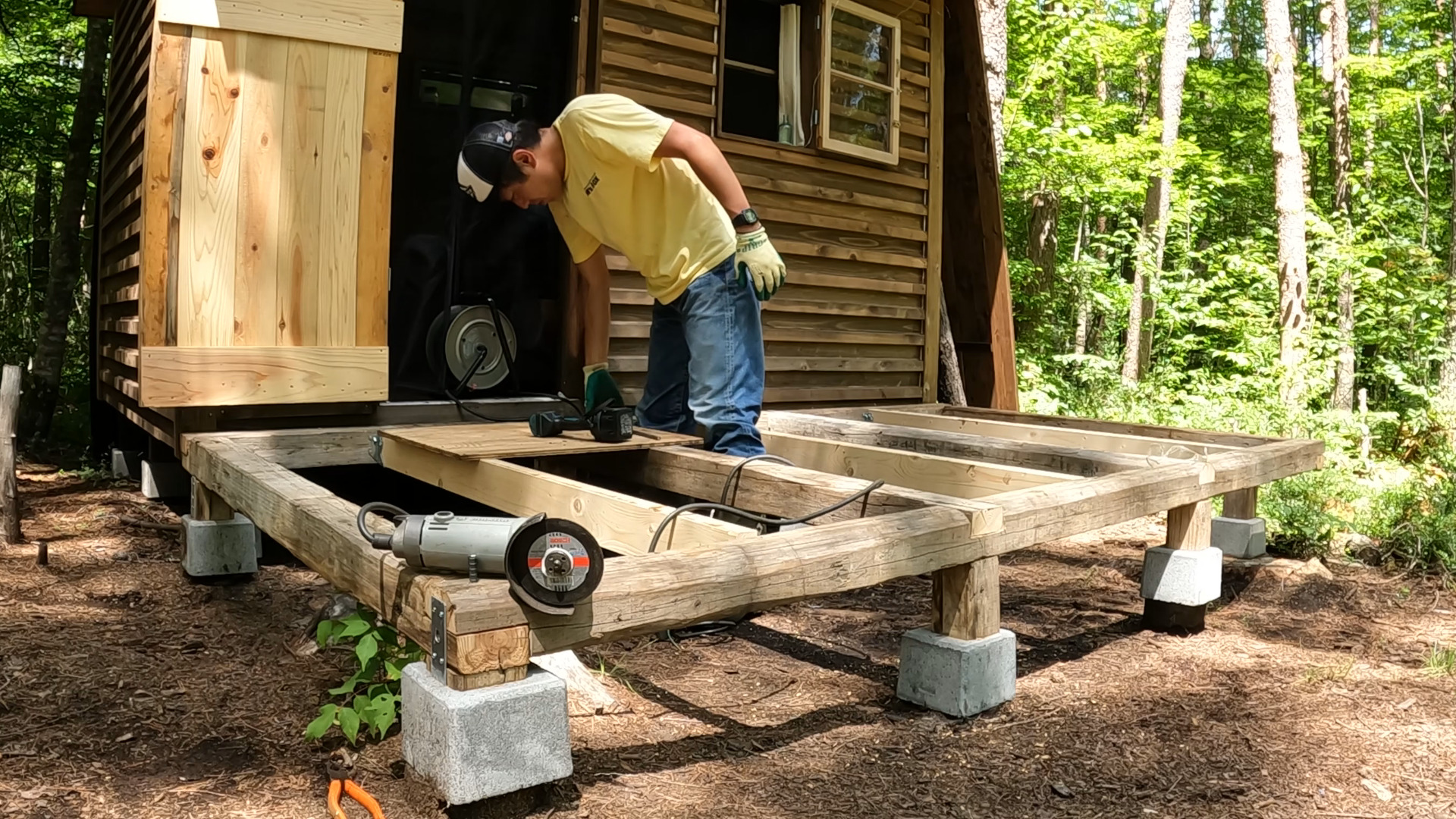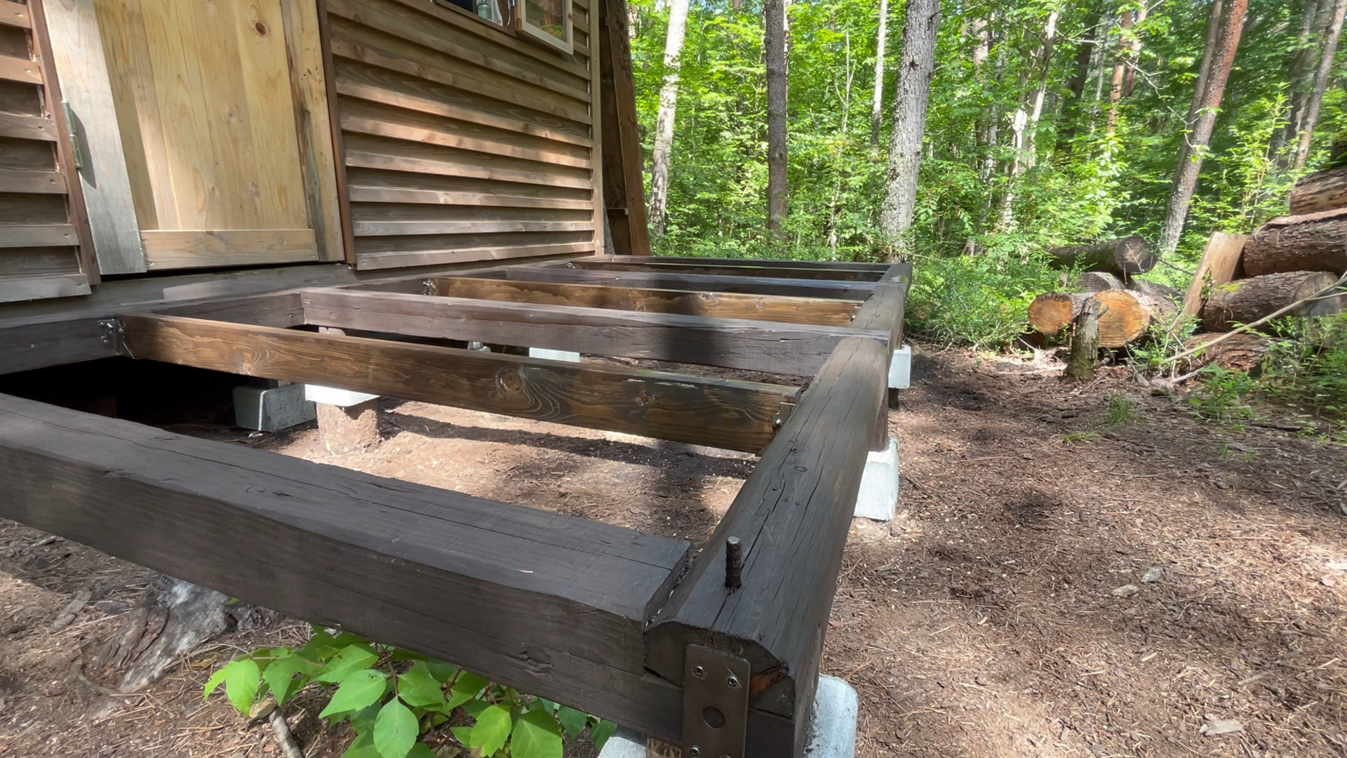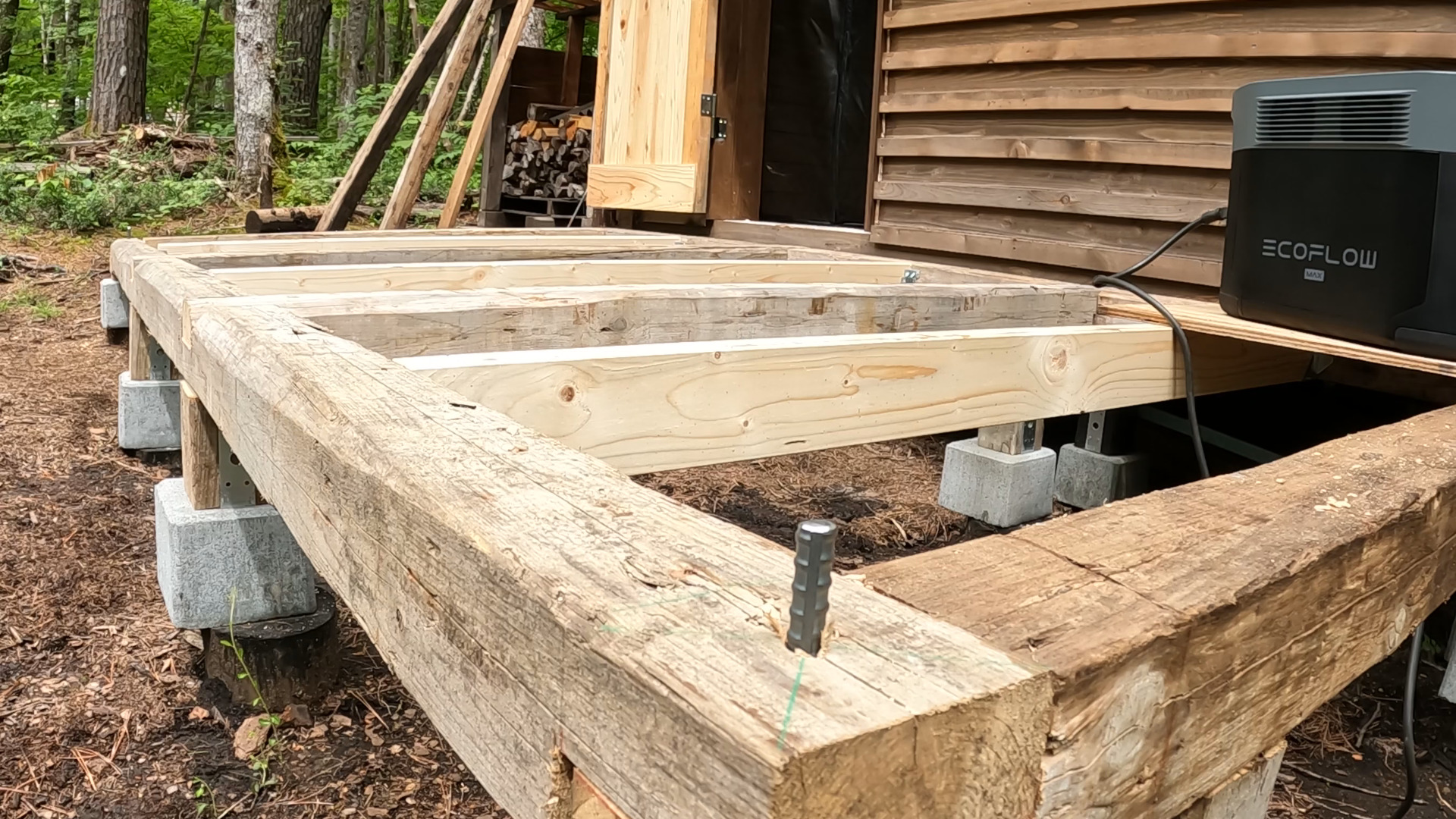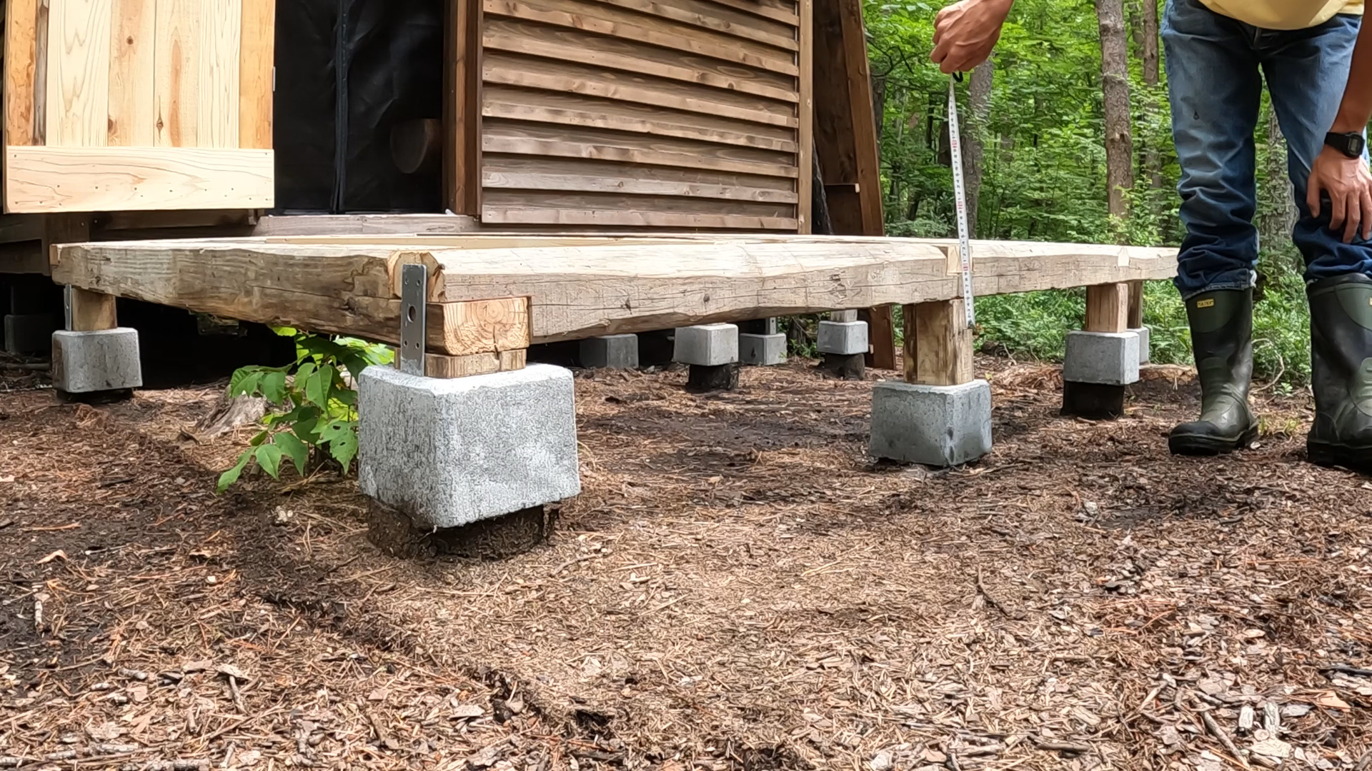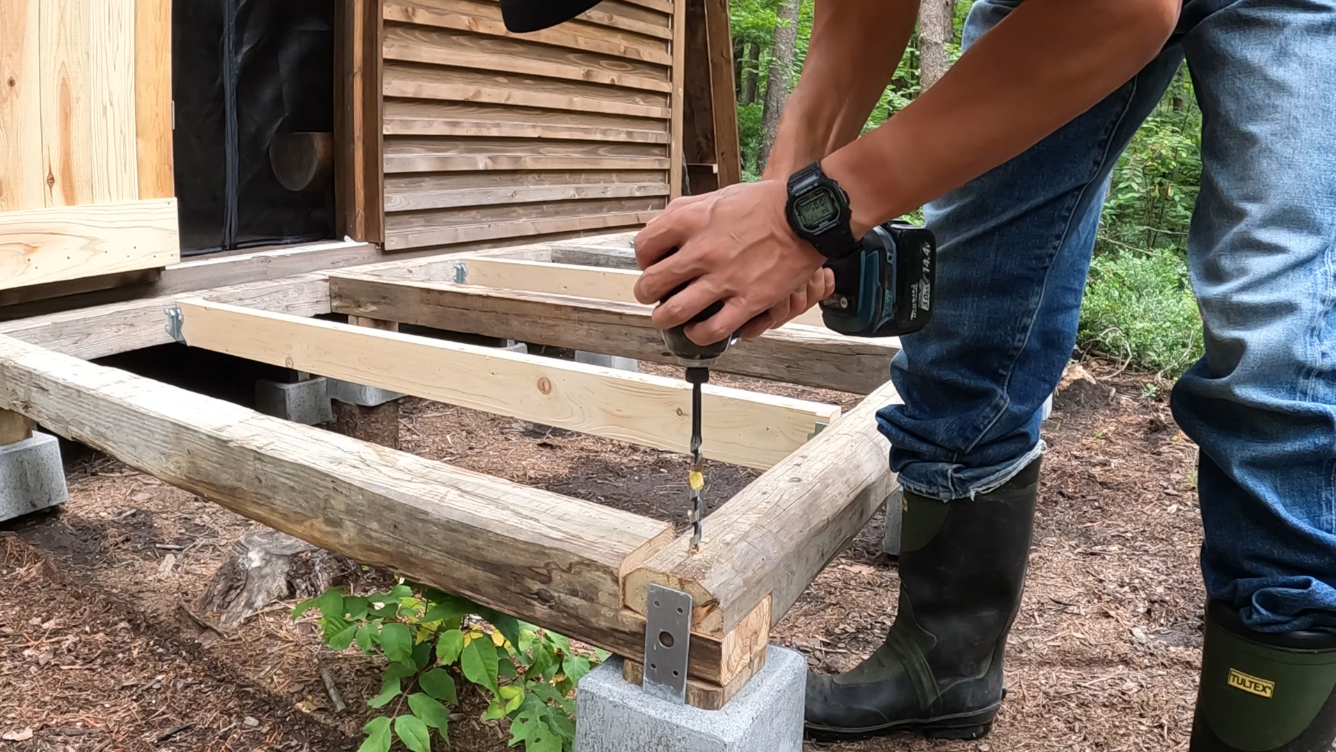 今、小屋の正面にウッドデッキを作っています。