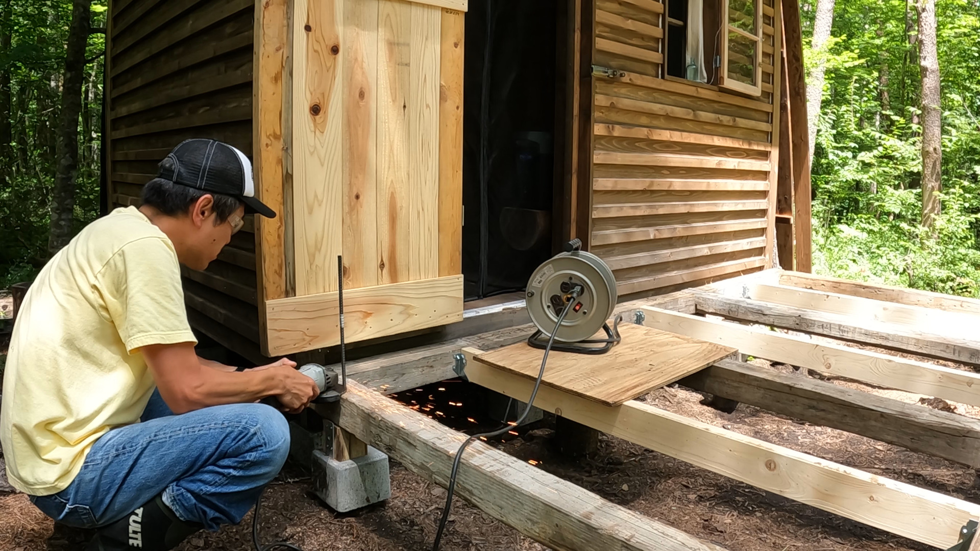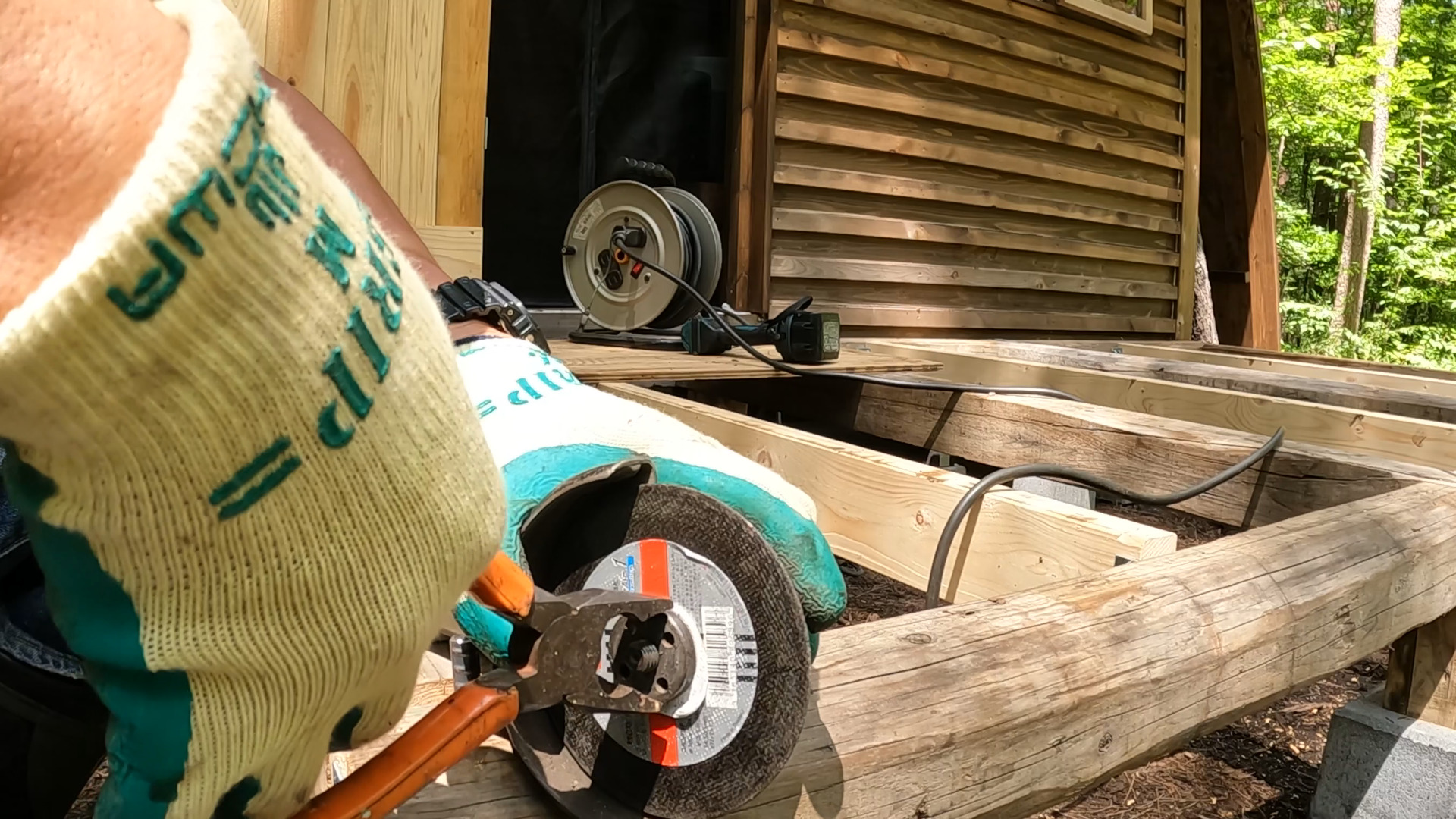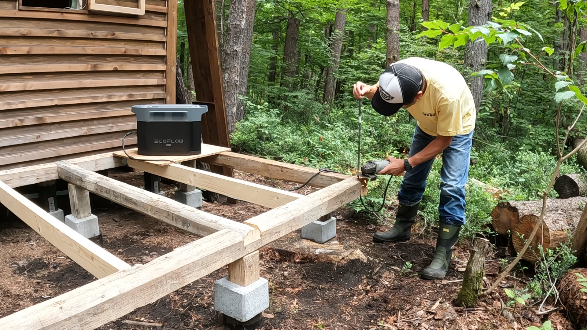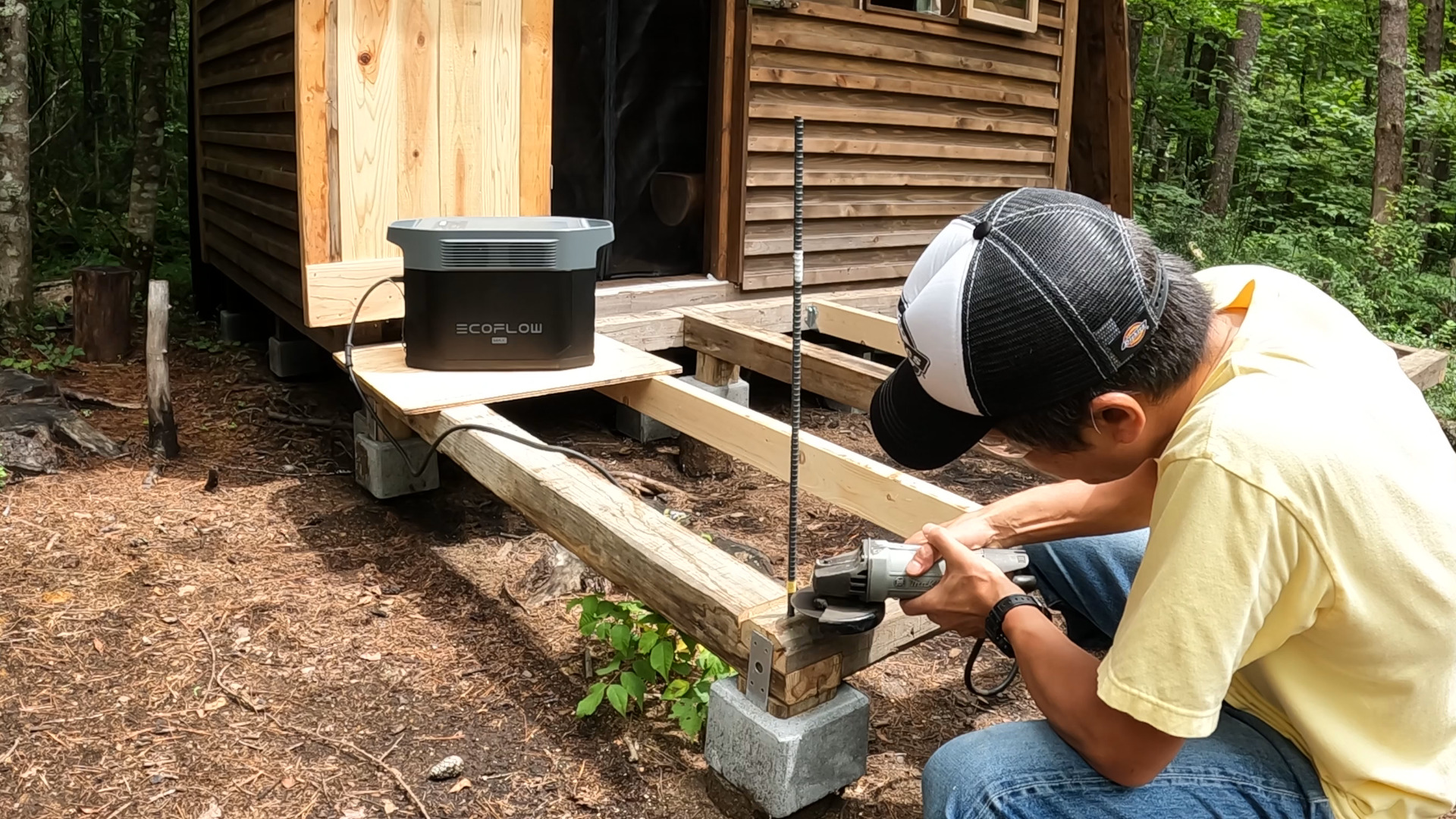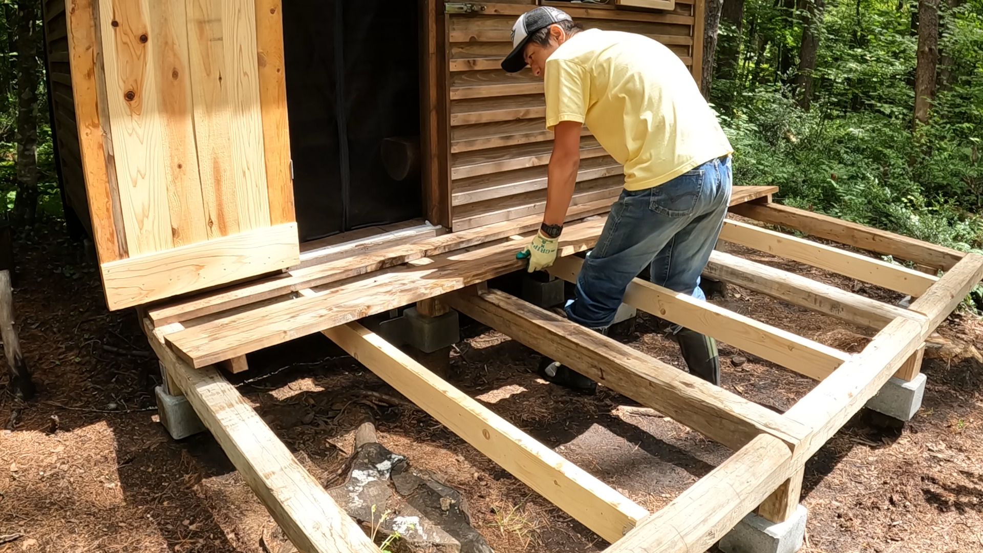 今、小屋の正面にウッドデッキを作っています。
