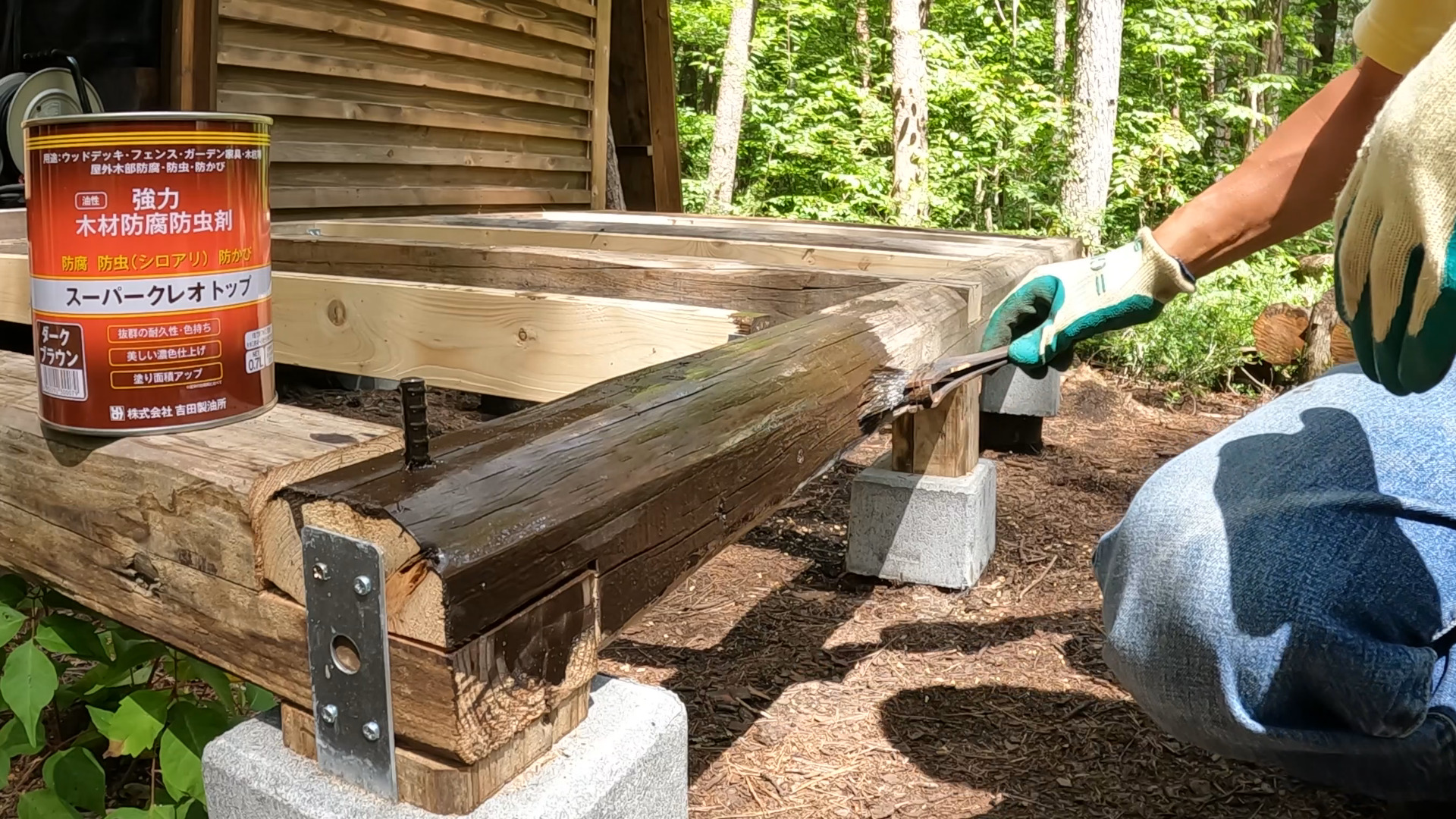 と言う事で土台に防腐剤を塗る事にしました。