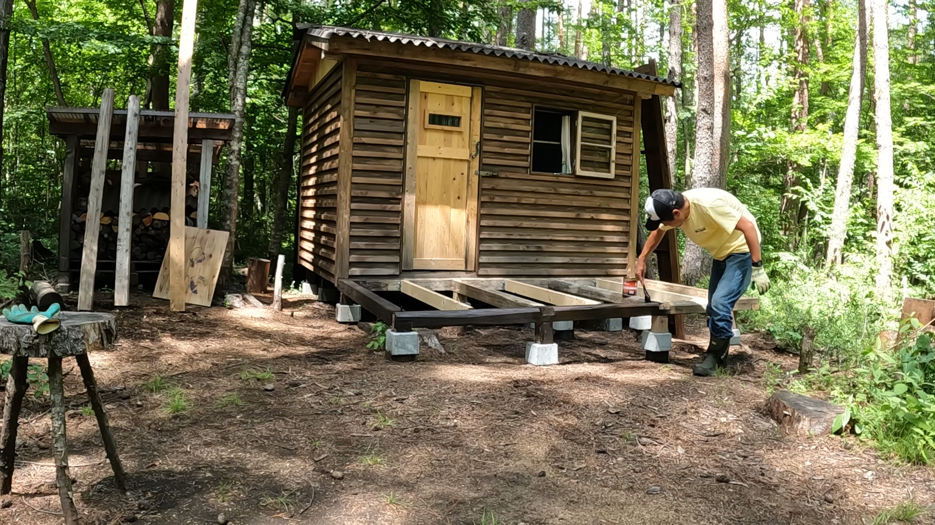 只今自作の山小屋の正面にウッドデッキを作っています。