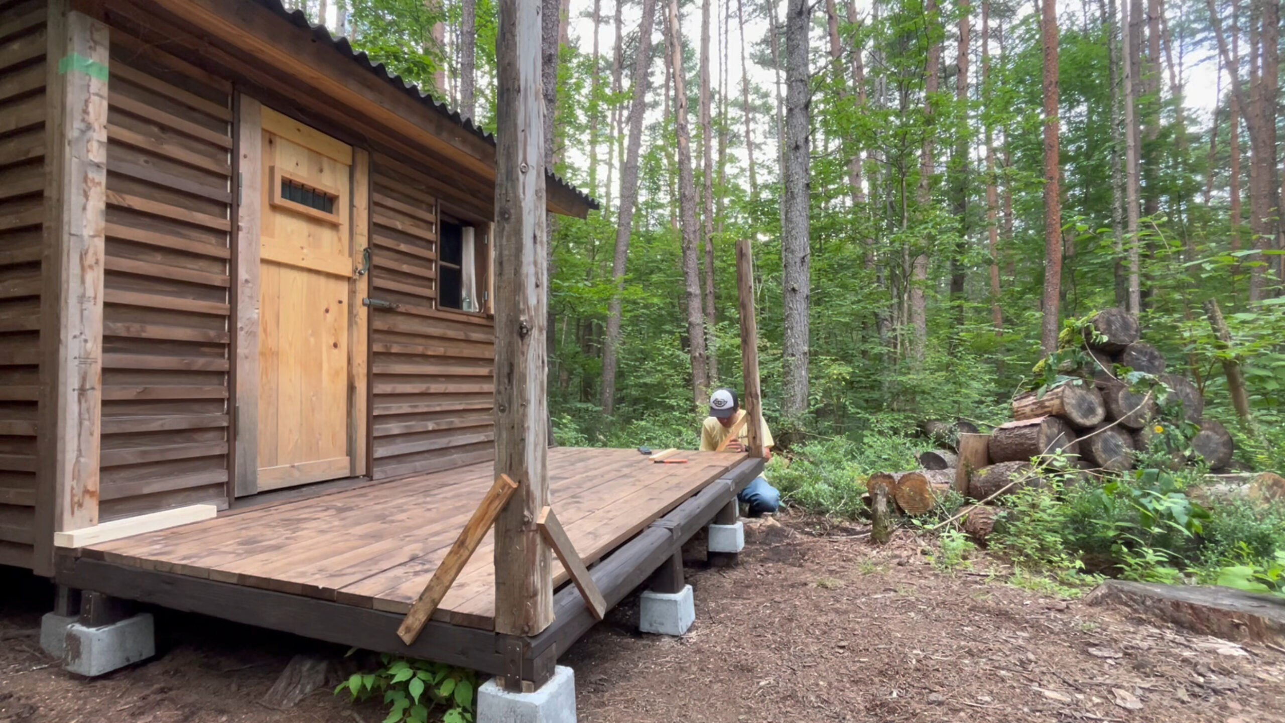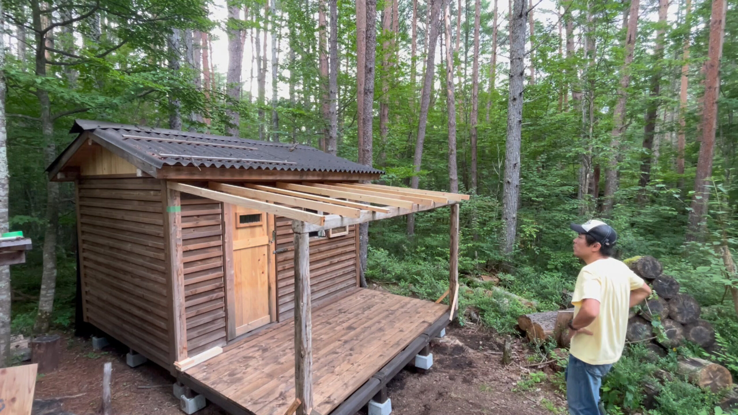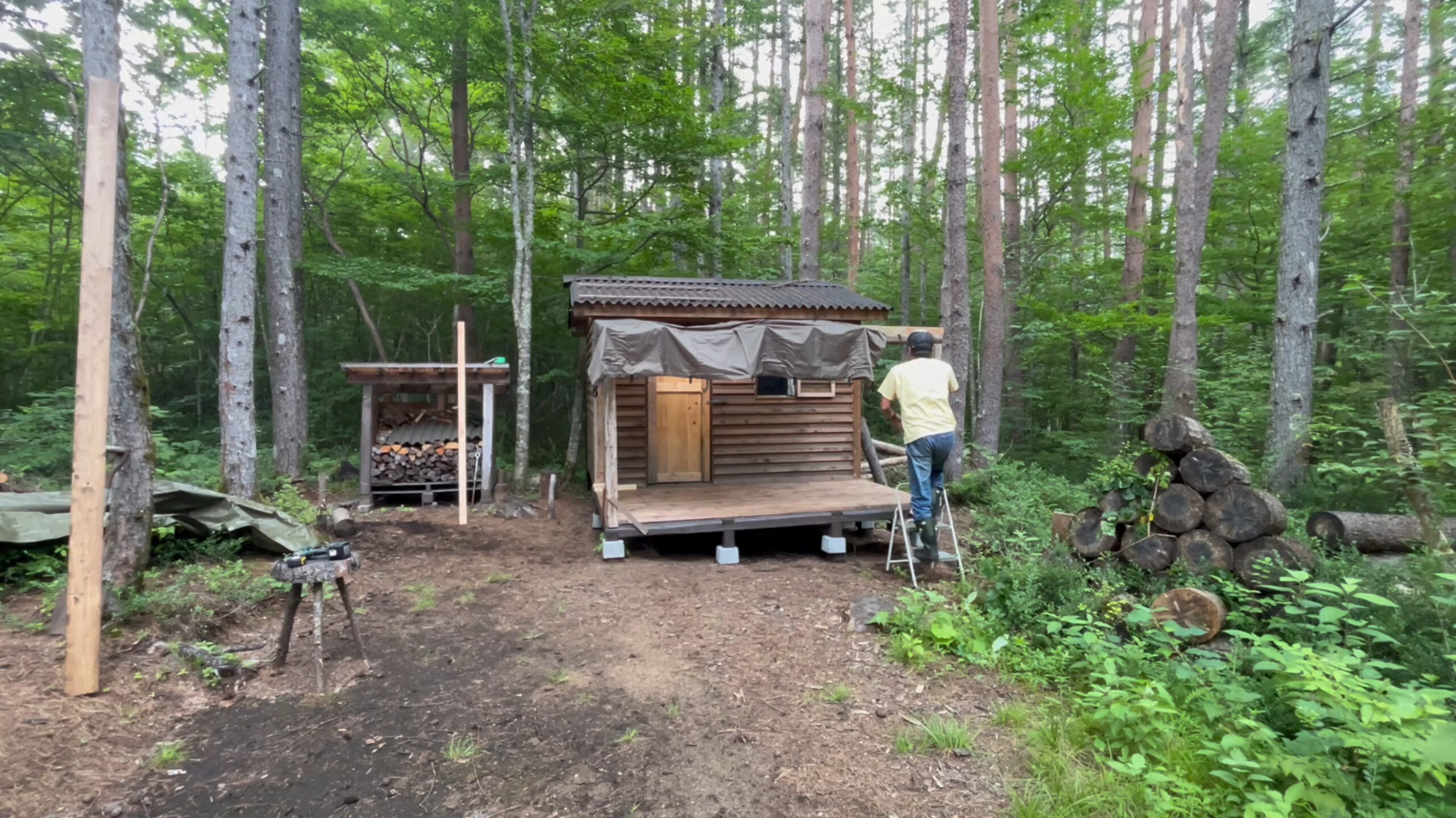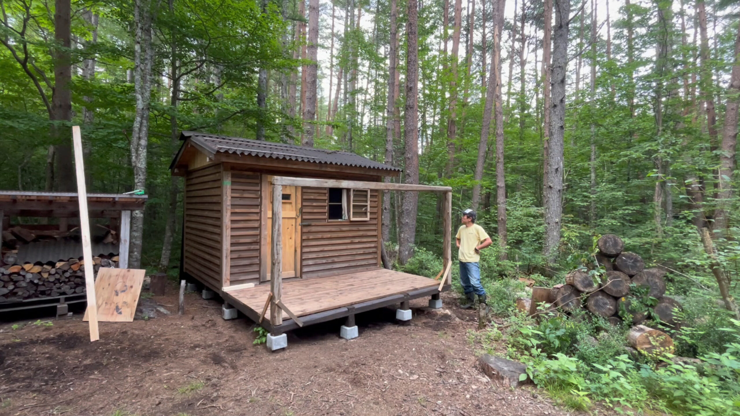 2020年の8月に開拓をスタートして、物置小屋、薪棚、雨水貯水システム、そして寝泊まり出来る小さな小さな山小屋を建てました。