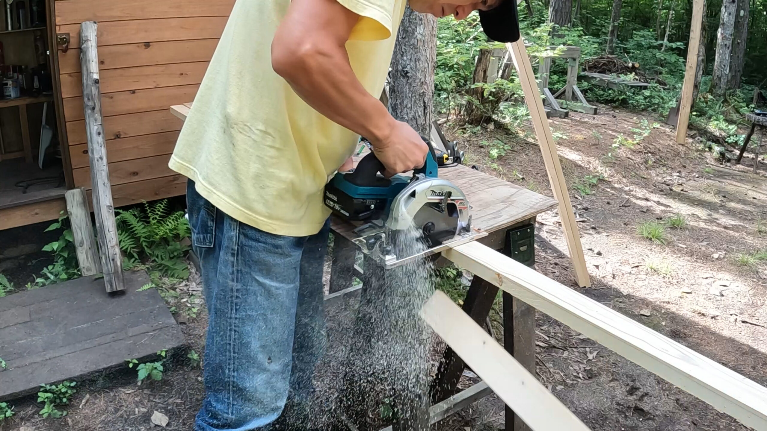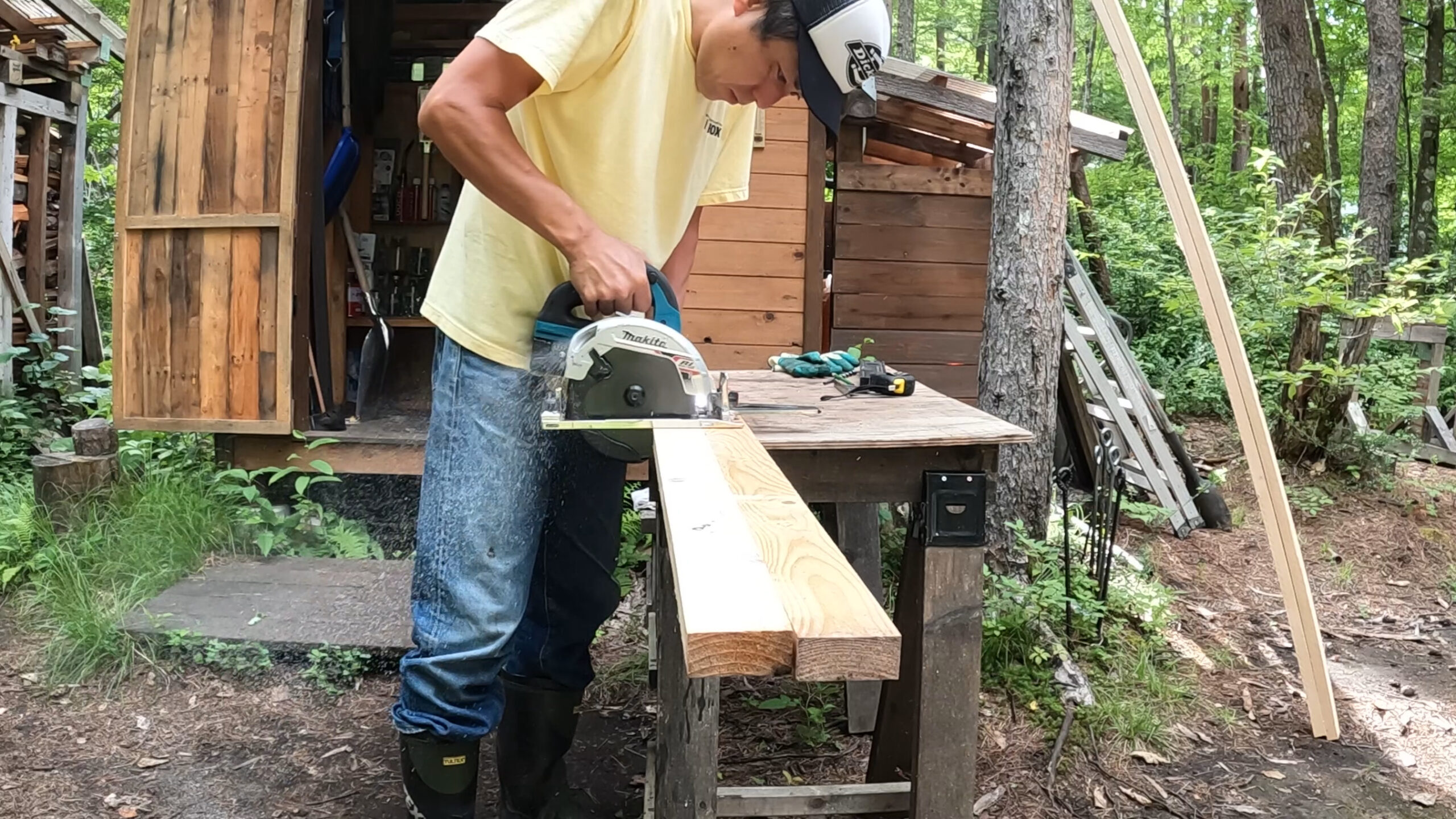 只今自作の山小屋の正面にウッドデッキを作っています。