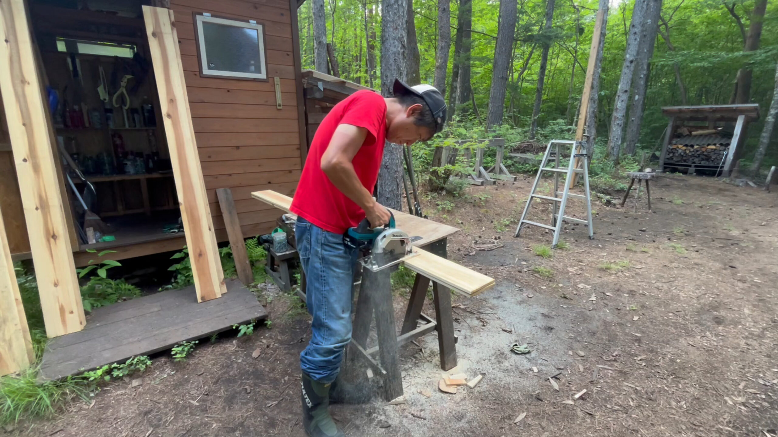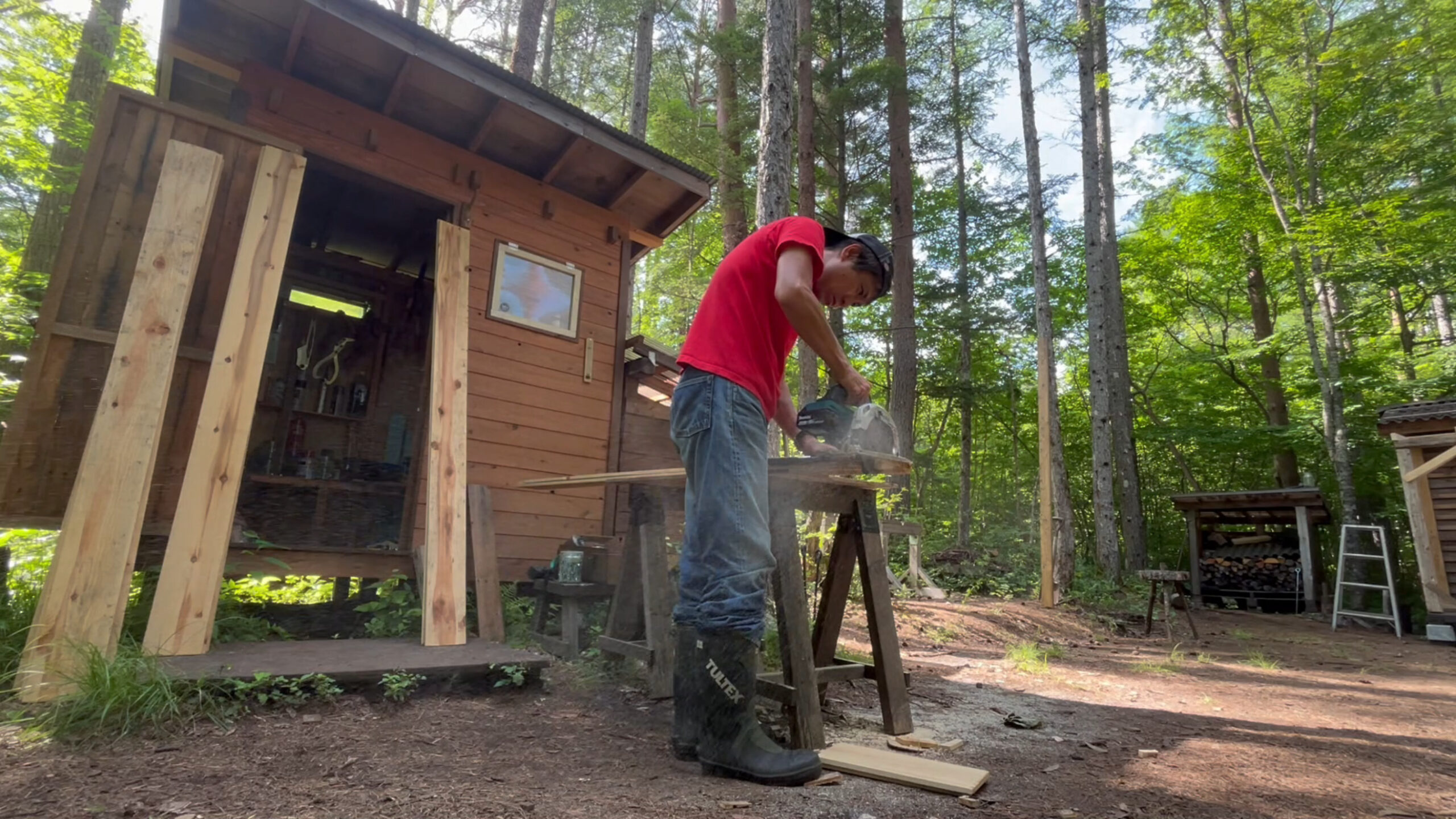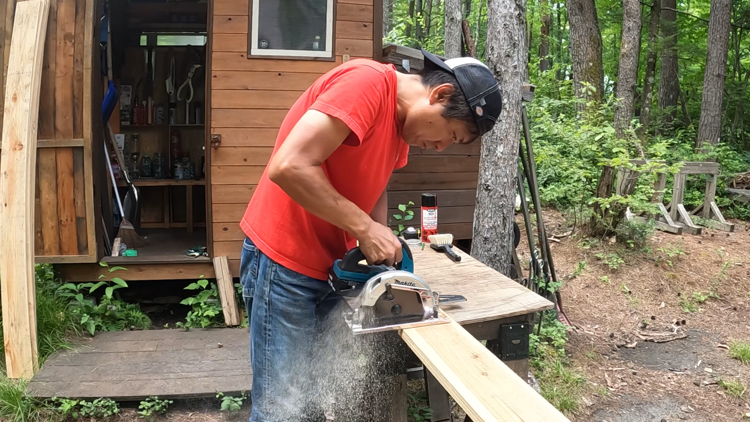只今自作の山小屋の正面にウッドデッキを作っています。