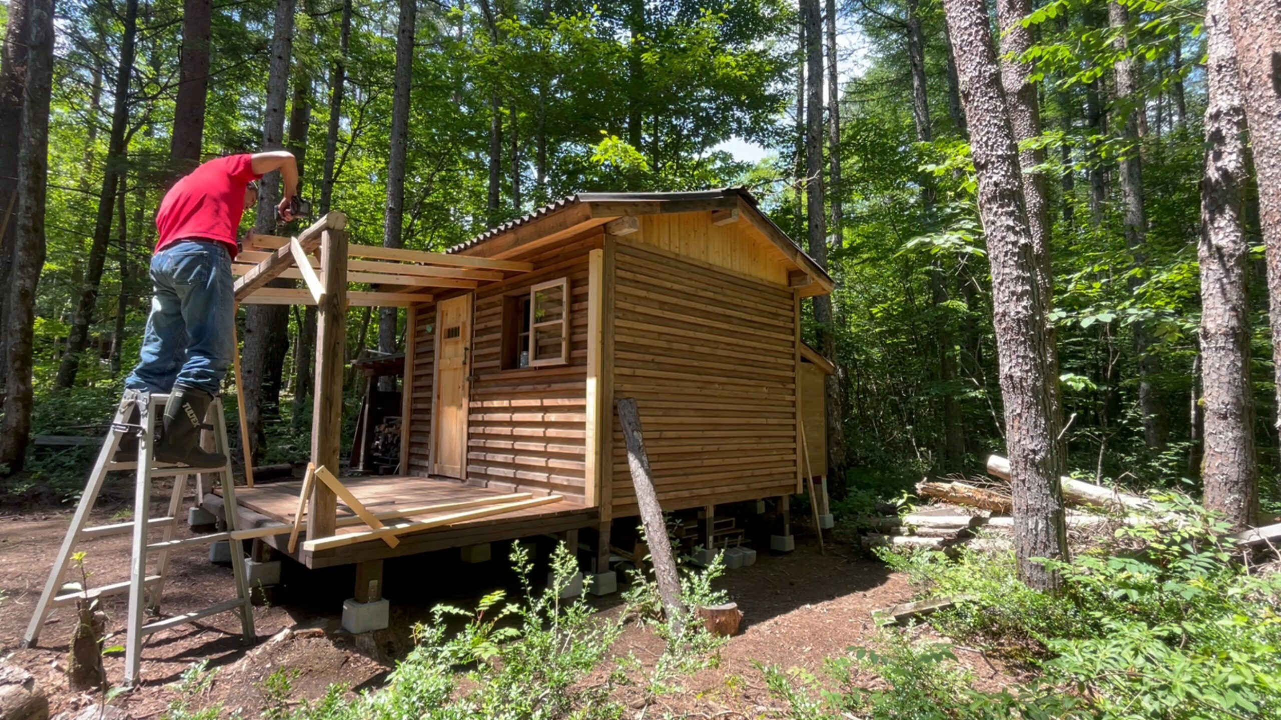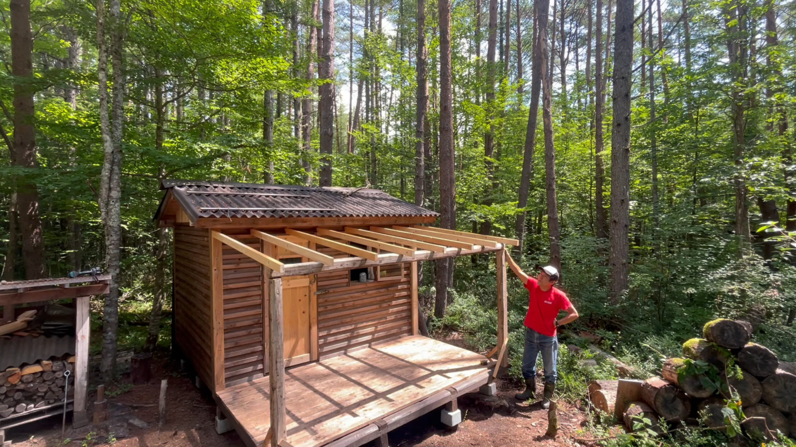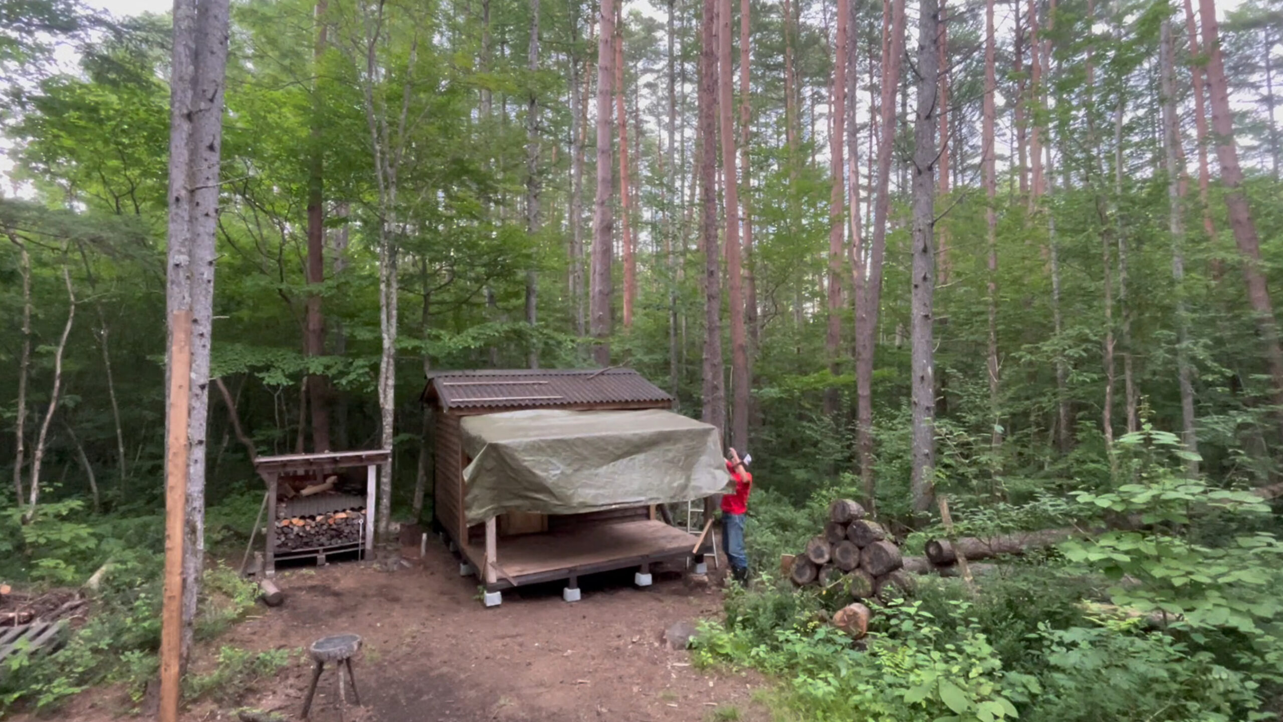 2020年の8月に開拓をスタートして、物置小屋、薪棚、雨水貯水システム、そして寝泊まり出来る小さな小さな山小屋を建てました。