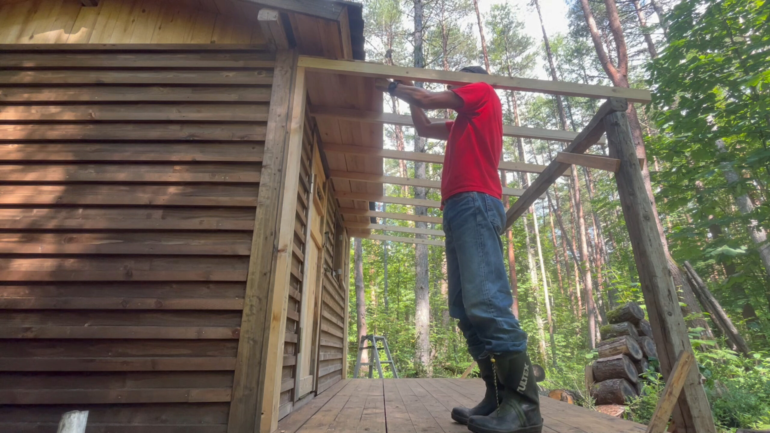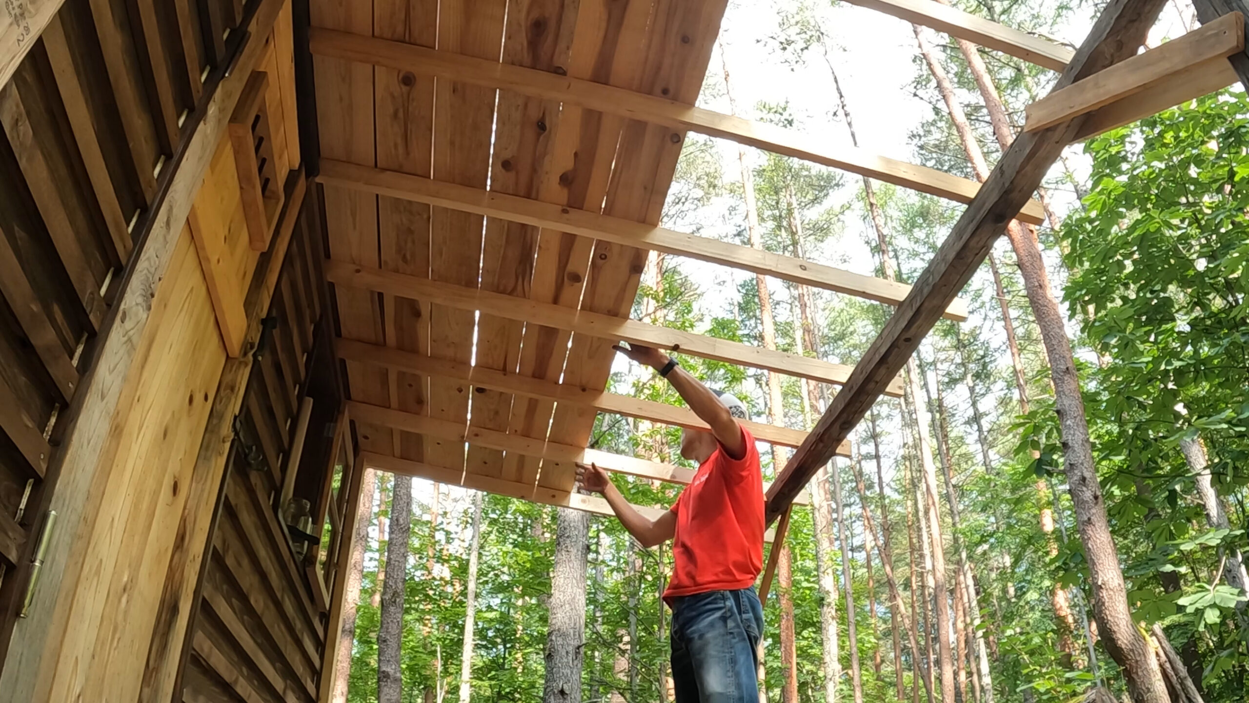 自作小屋の正面に製作中のウッドデッキ、前回垂木を施工しました。