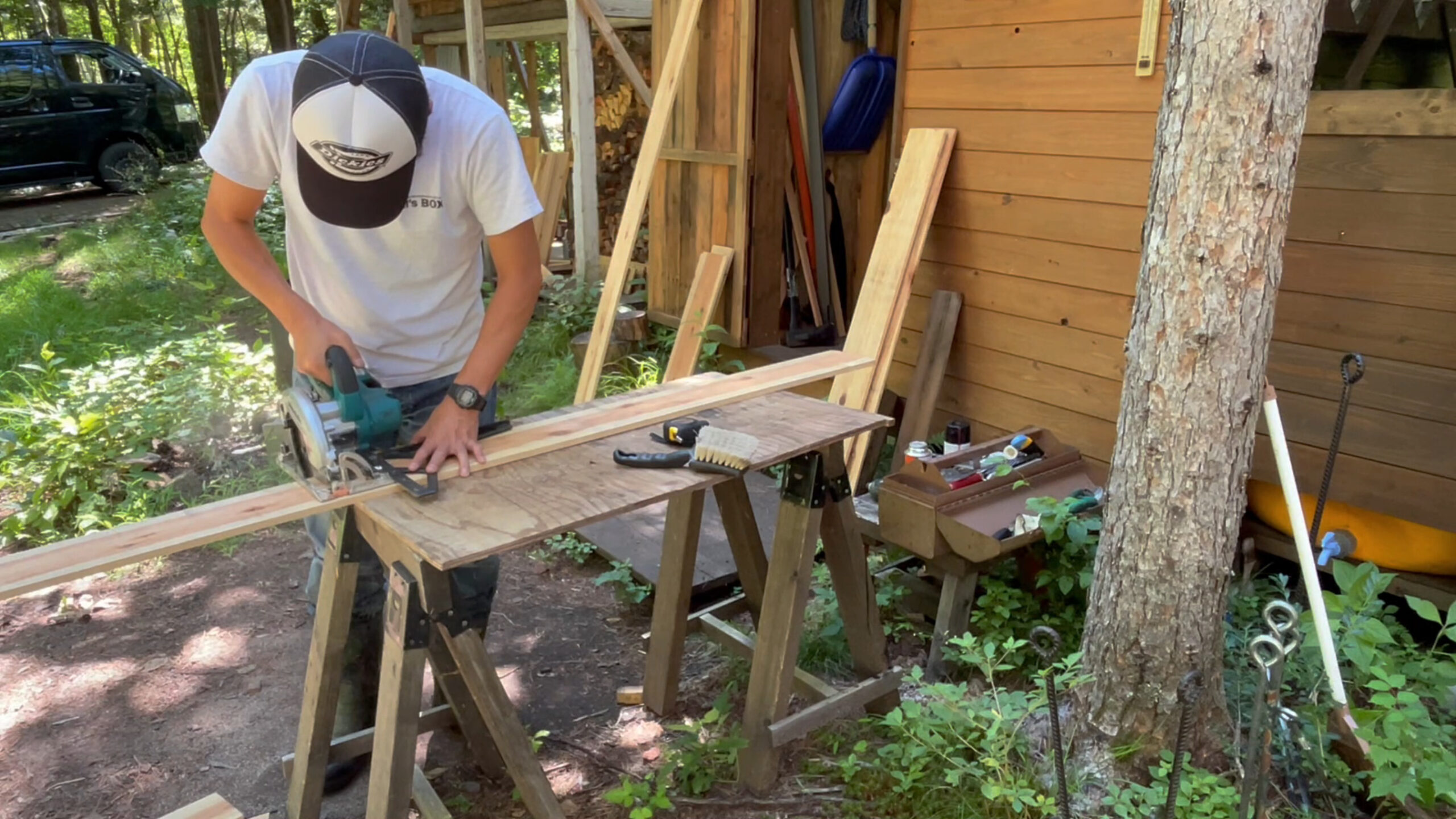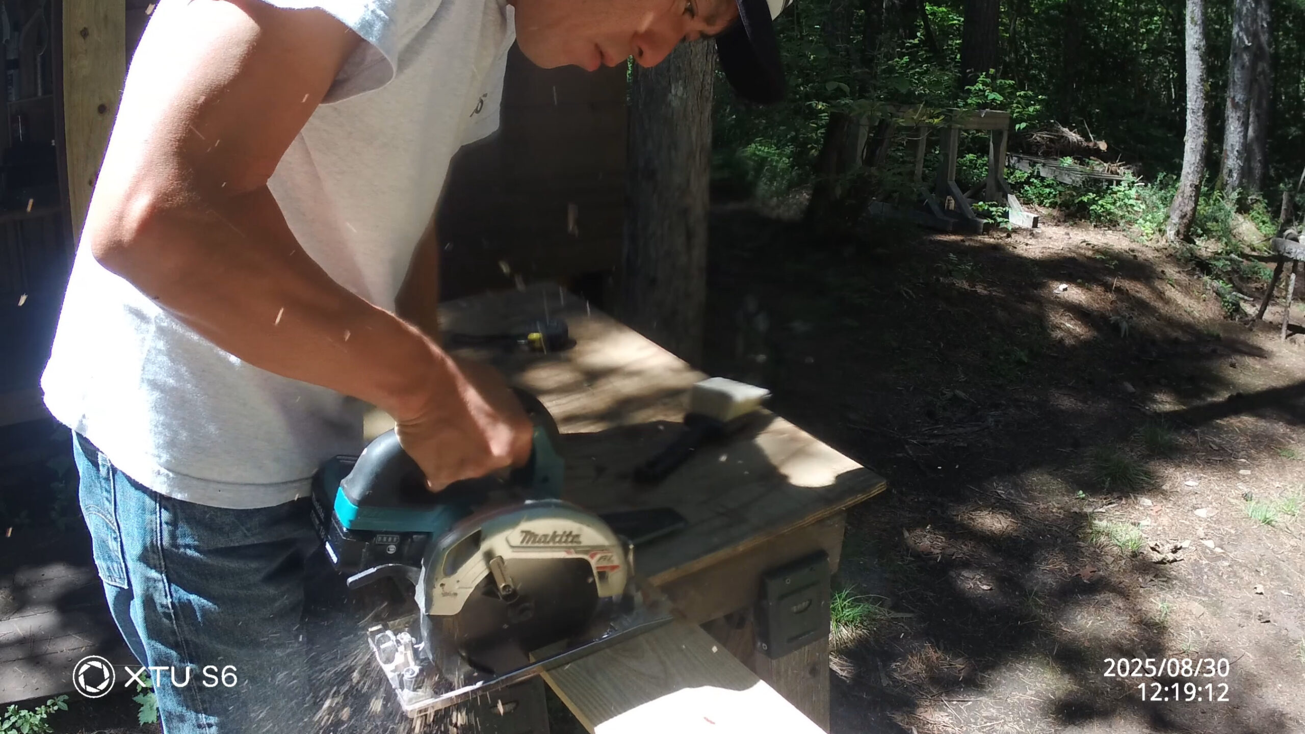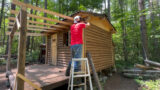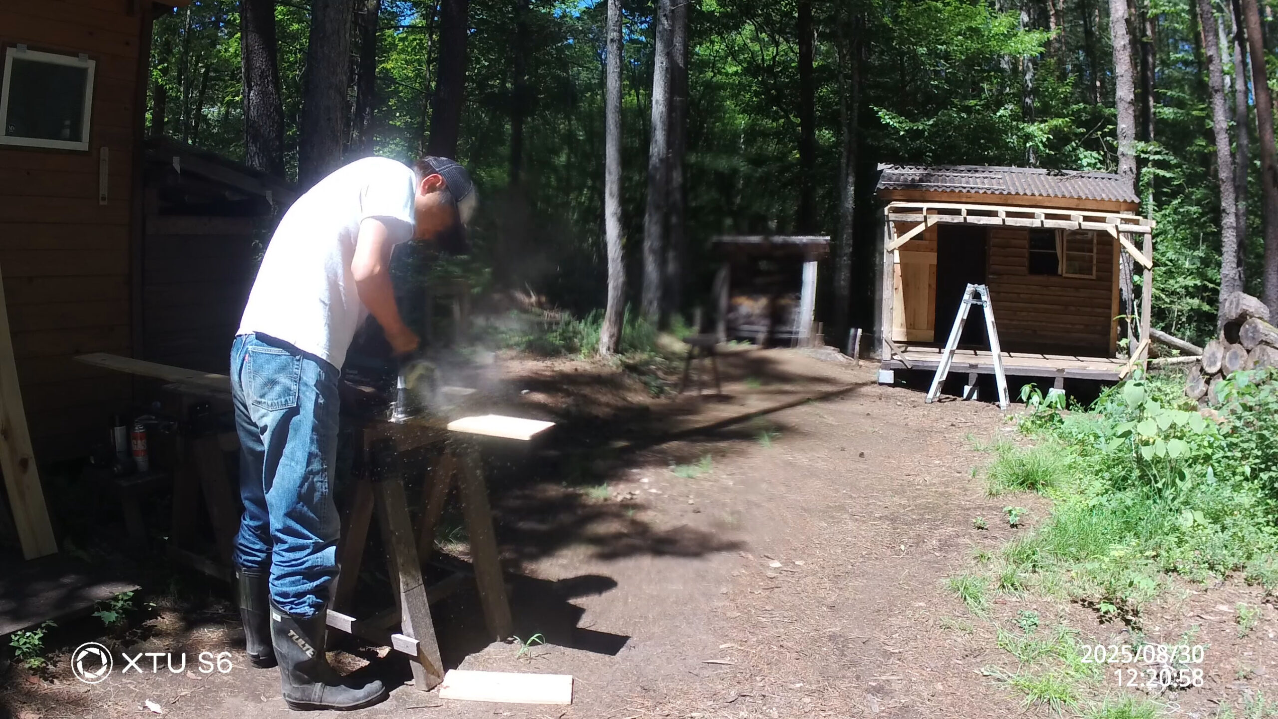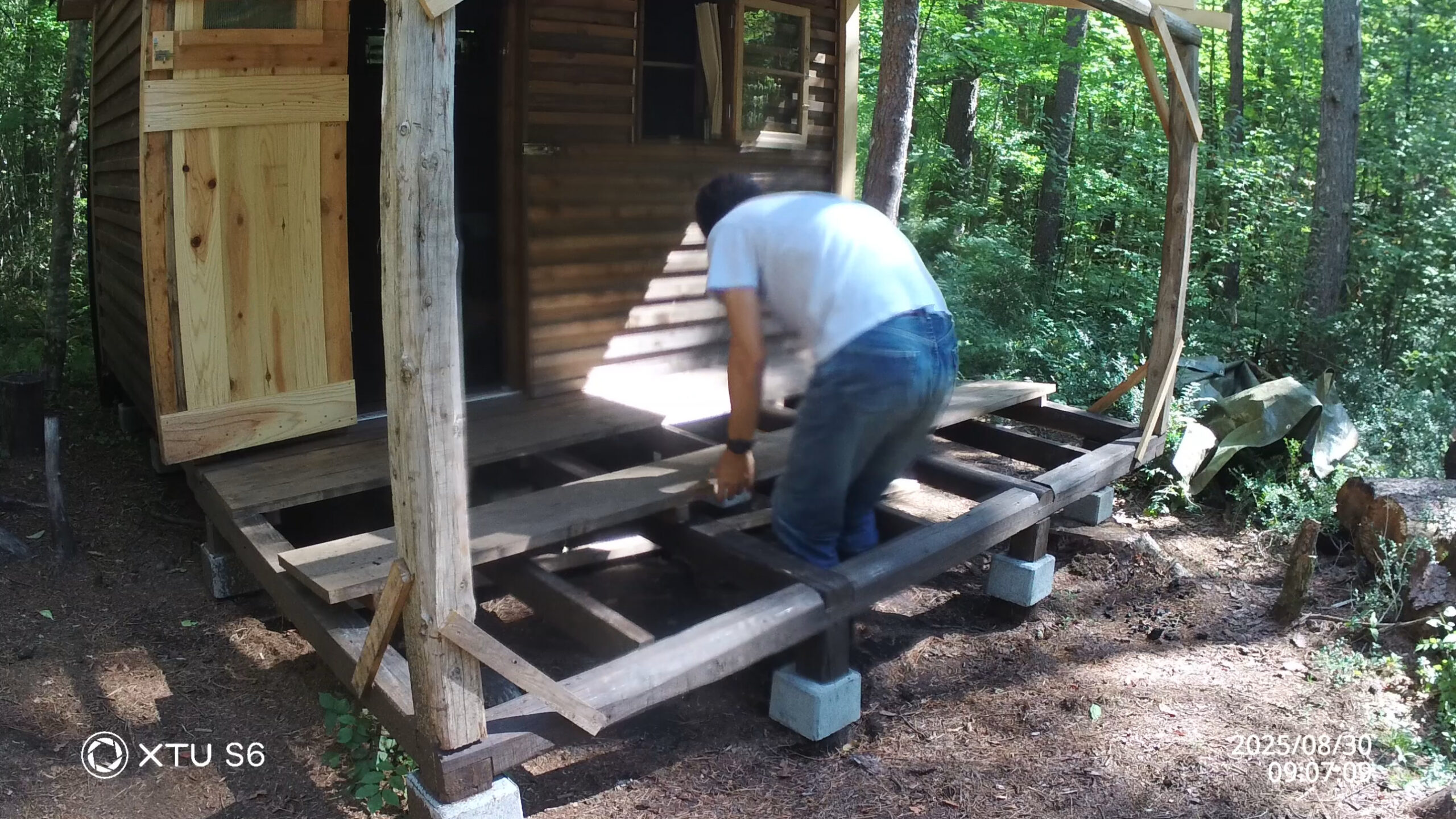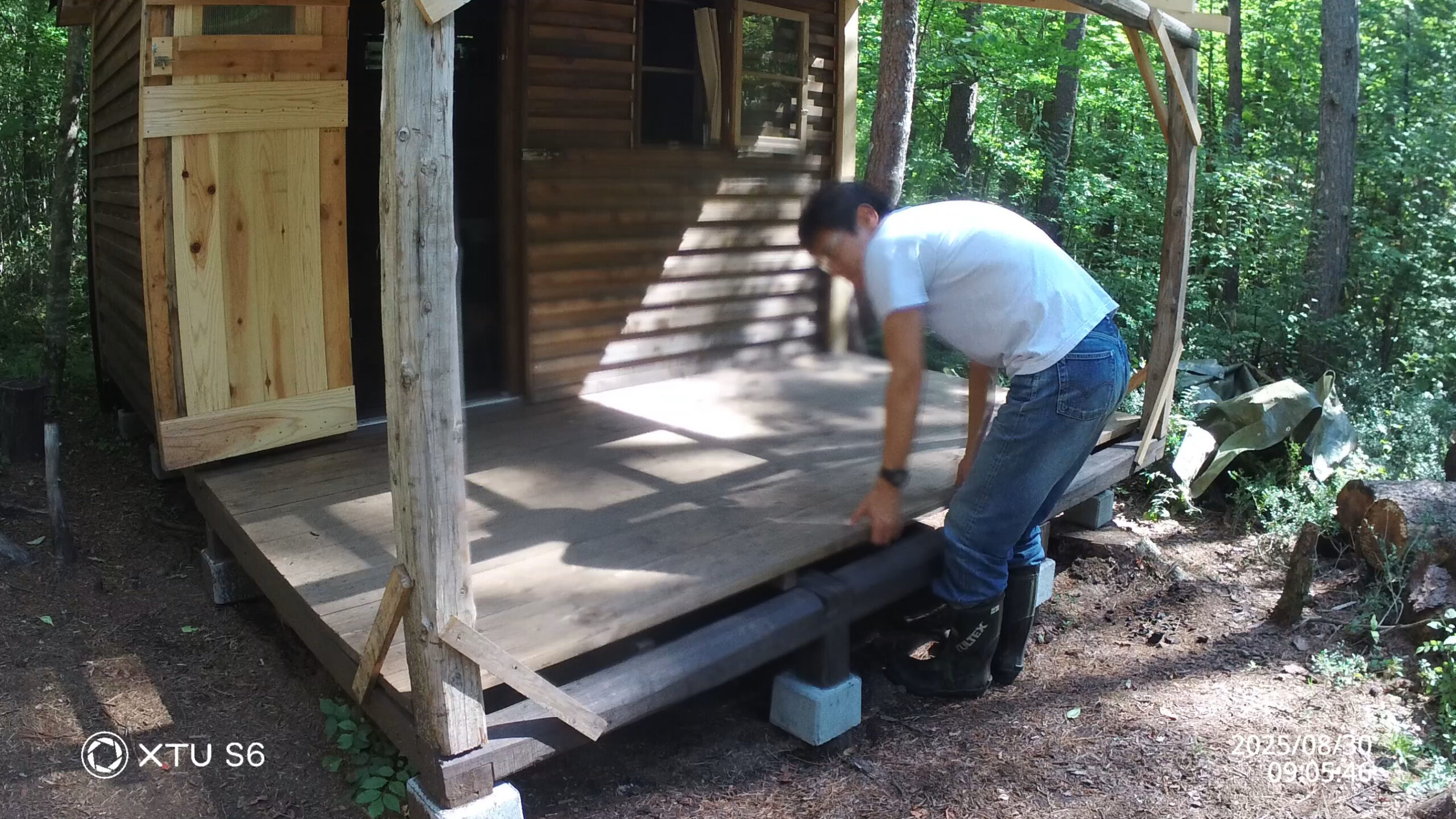 只今自作の山小屋の正面にウッドデッキを作っています。