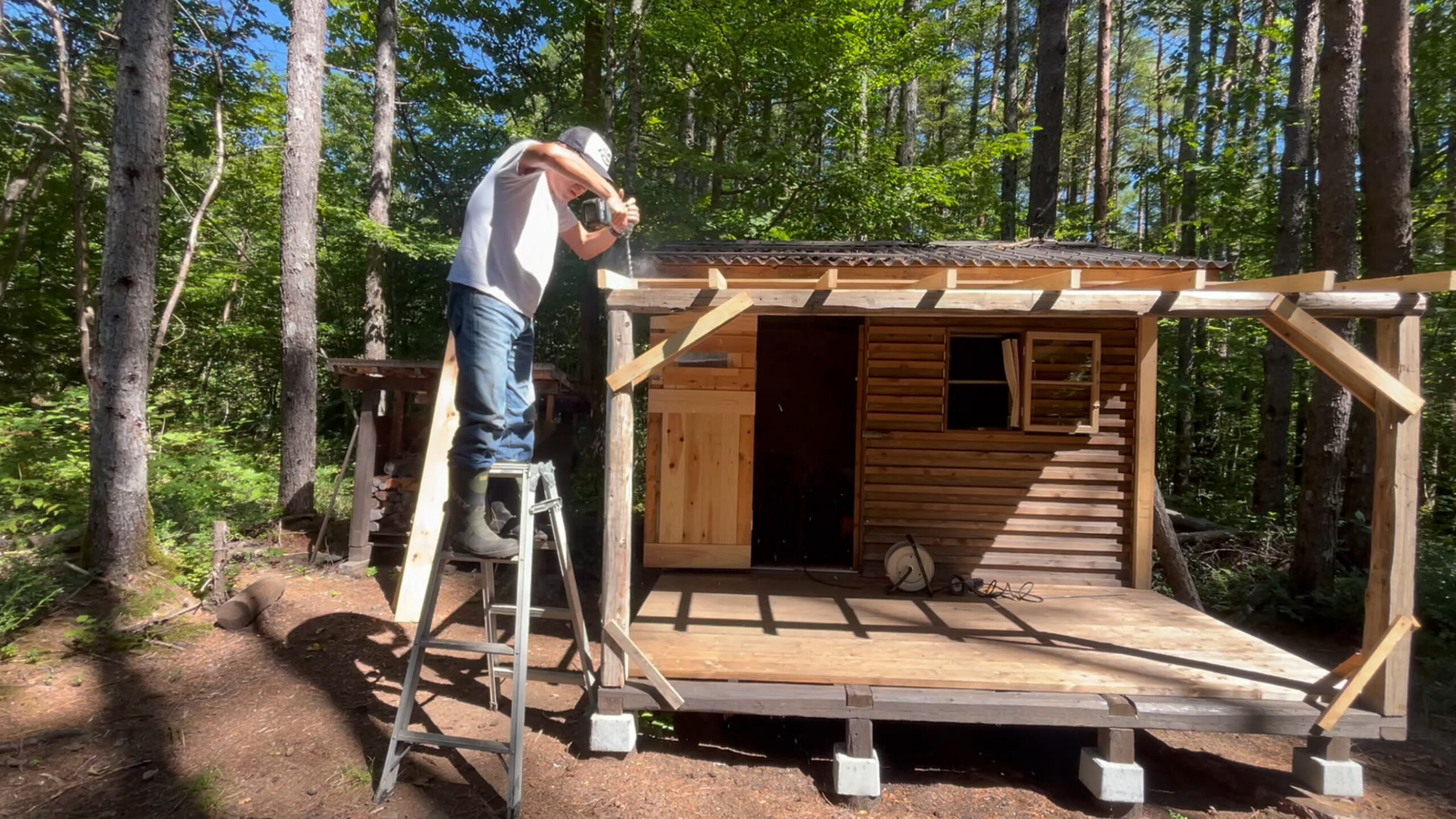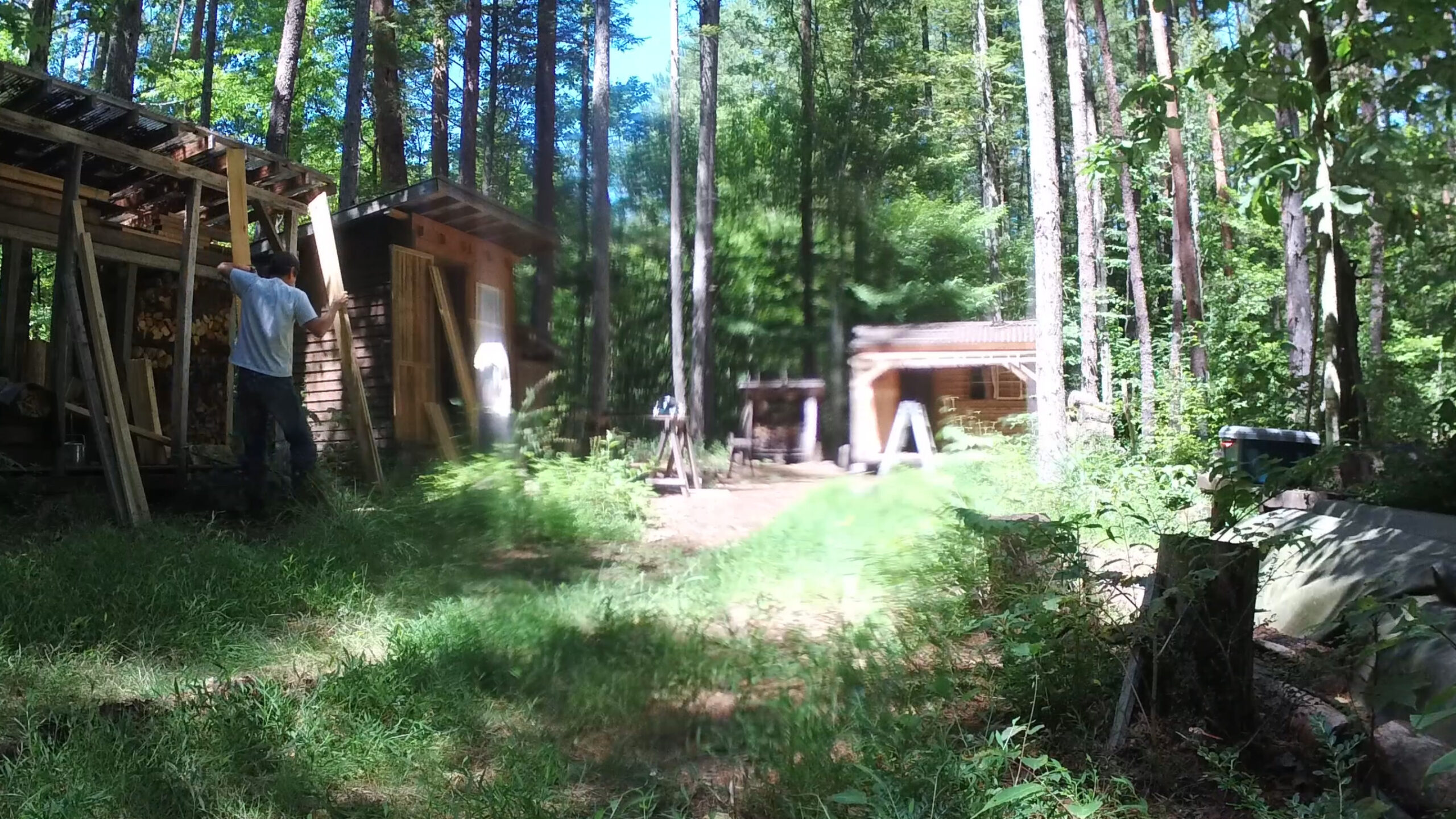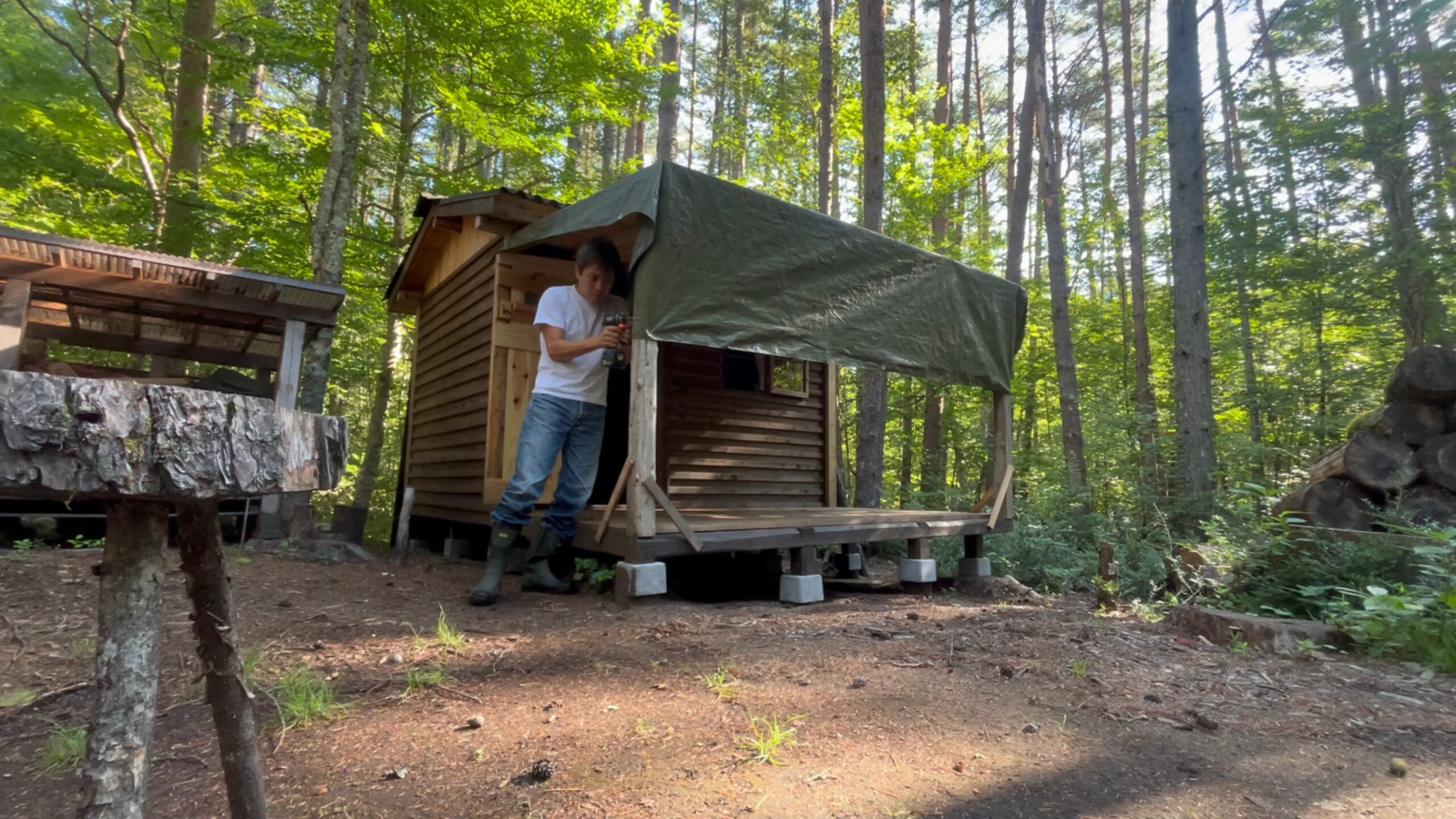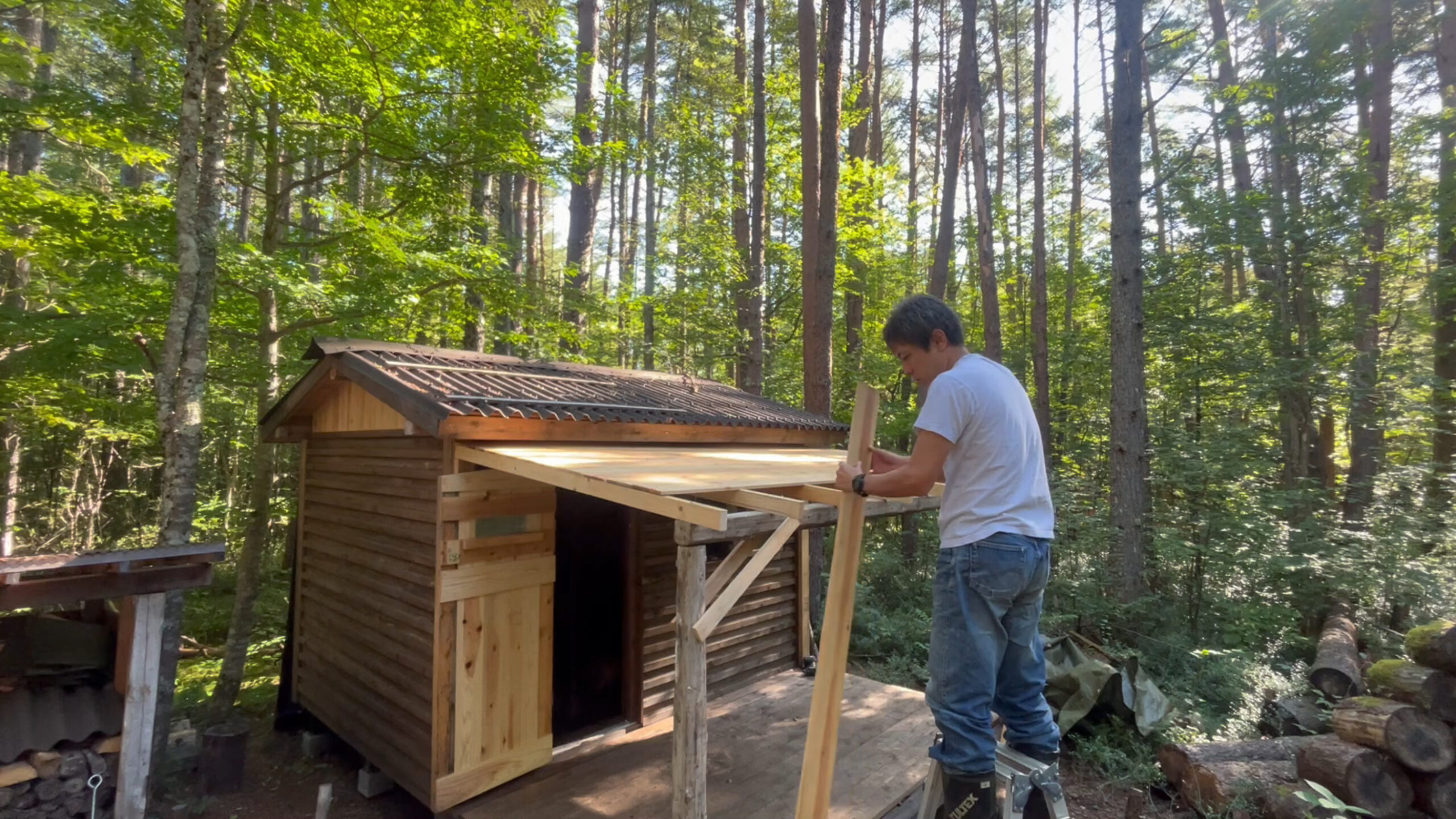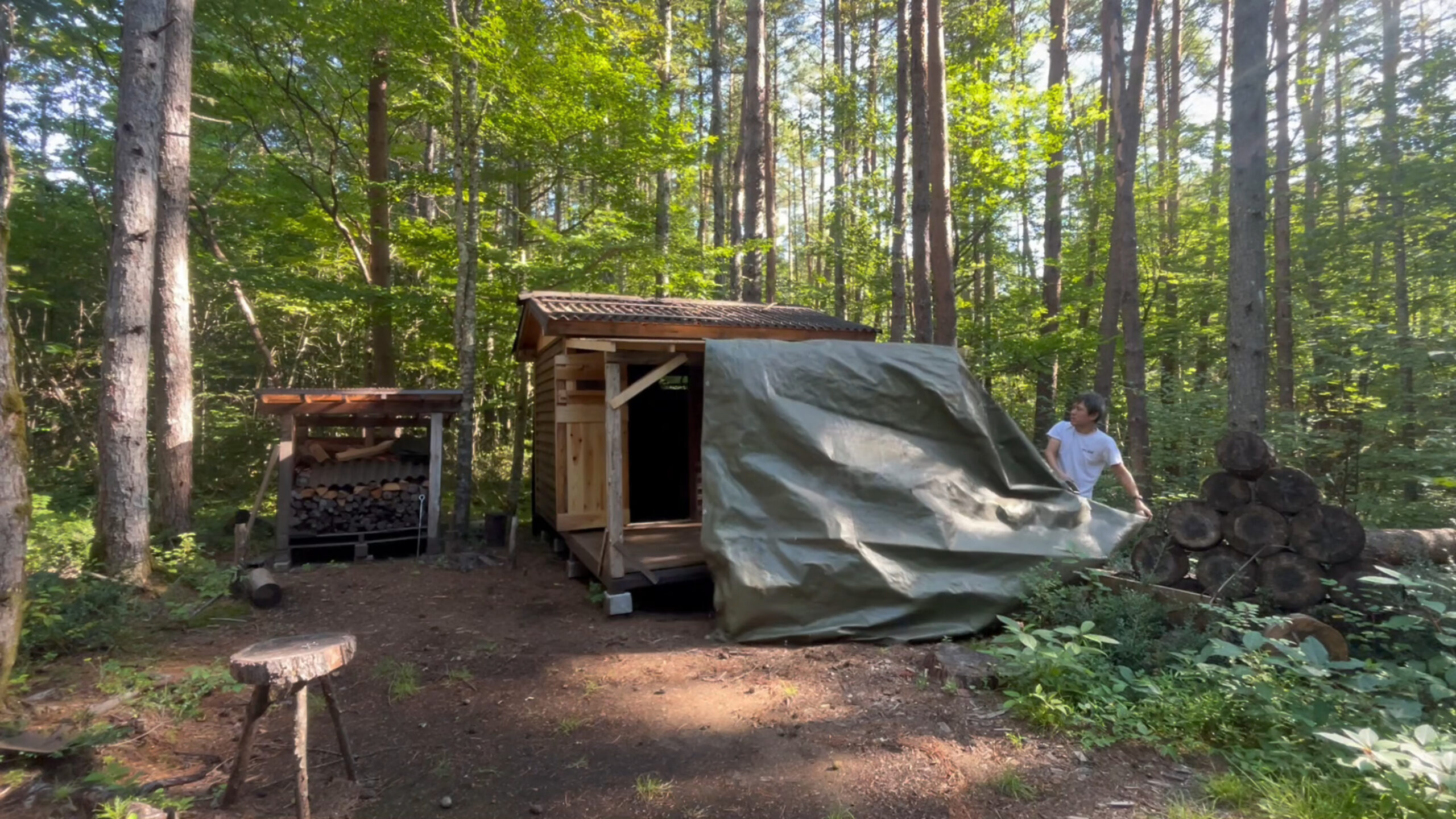2020年の8月に開拓をスタートして、物置小屋、薪棚、雨水貯水システム、そして寝泊まり出来る小さな小さな山小屋を建てました。