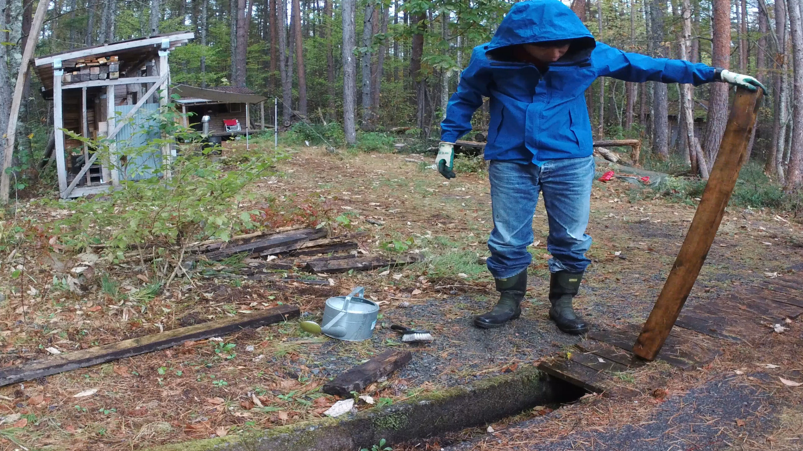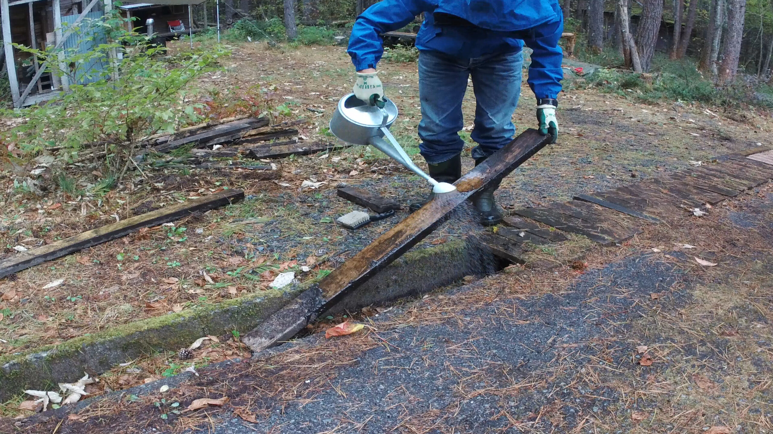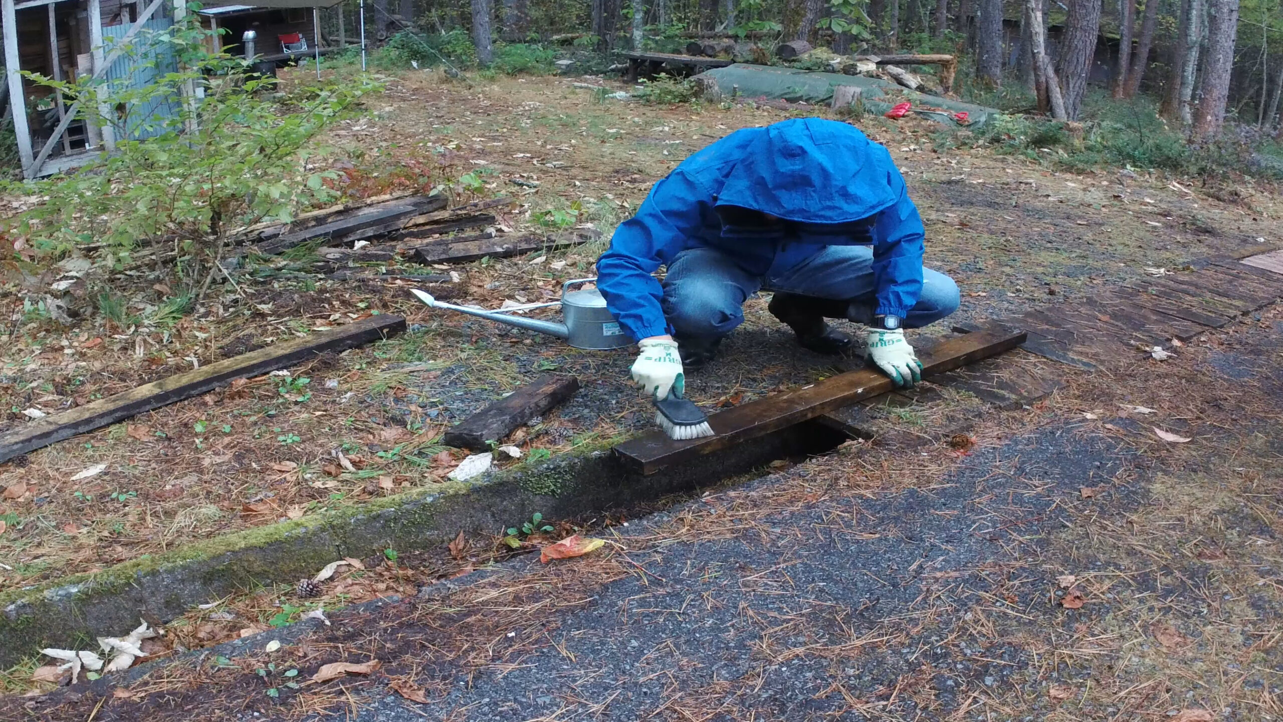 先ずは車を乗り入れる場所にぬかるみ対策で敷いていた材木に付いた土を洗い流していきます。