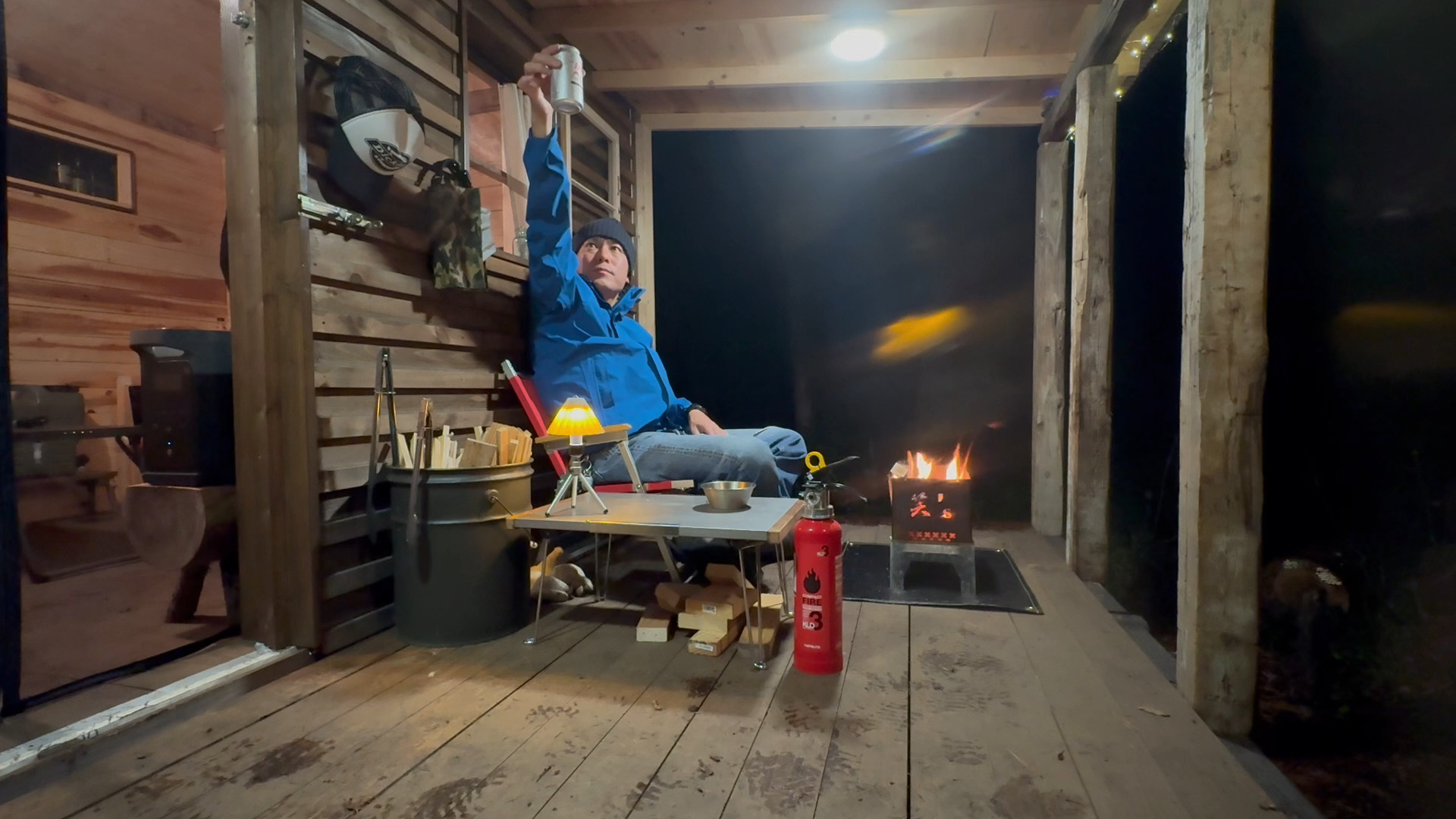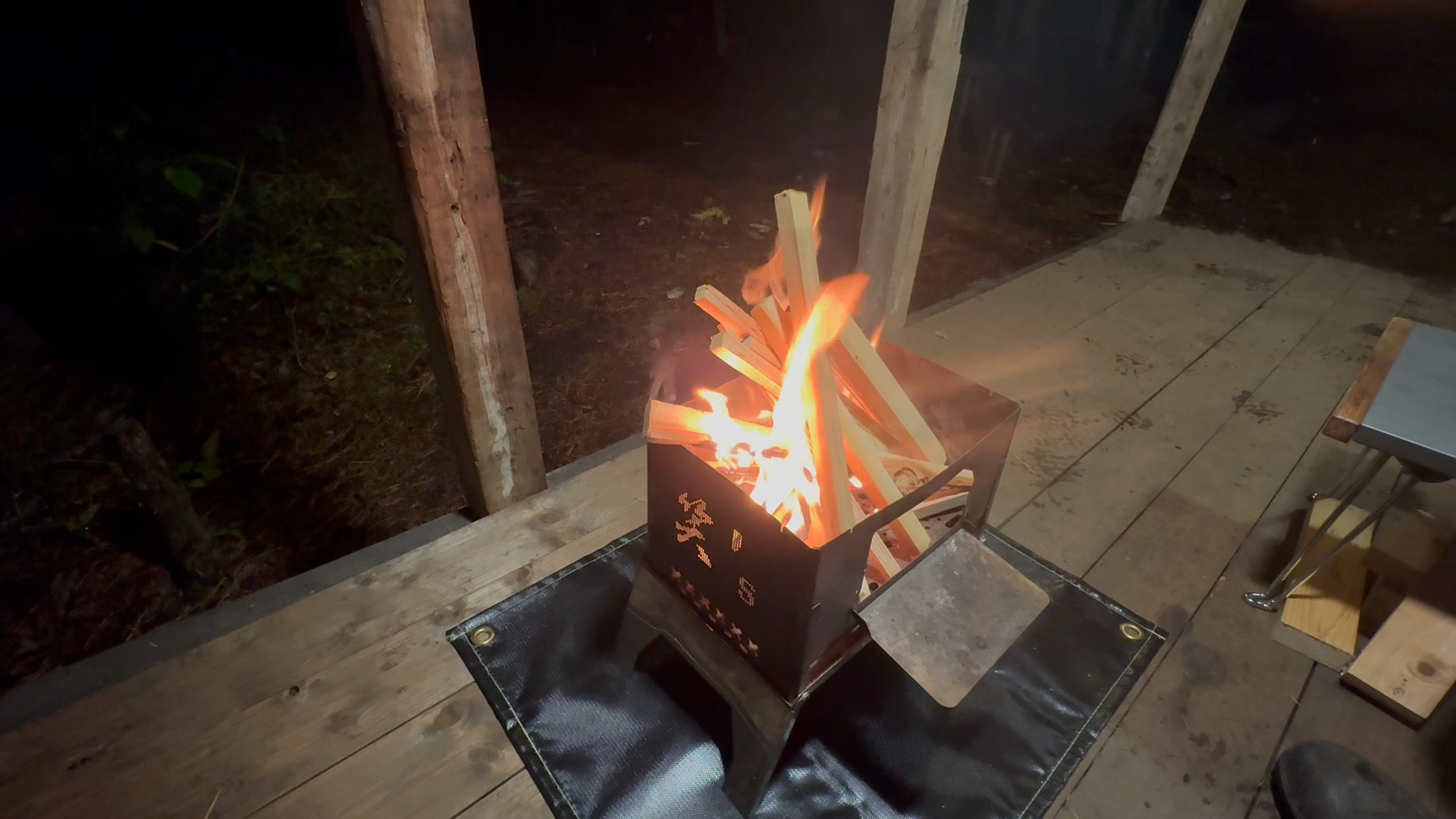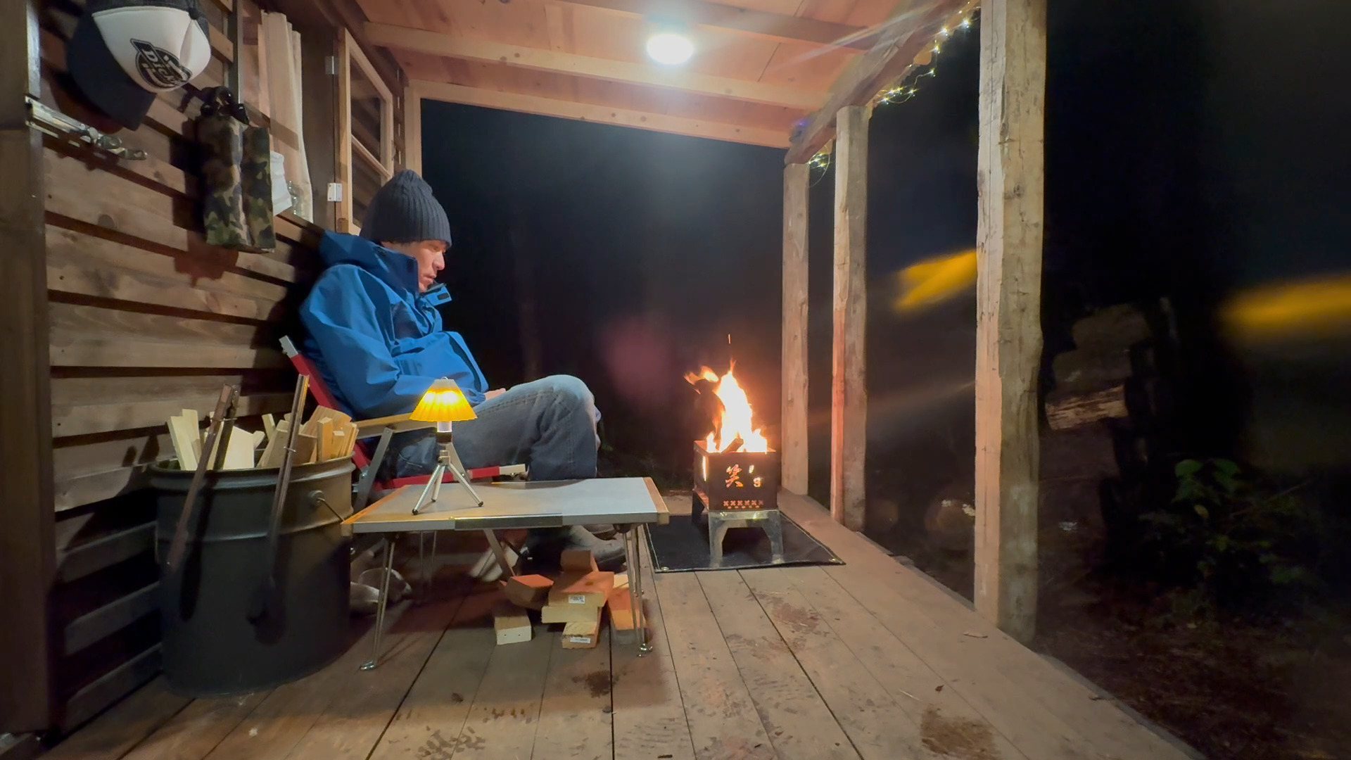 昼間に作業をして夕方に近場の温泉で疲れを癒し最近増築した屋根付きデッキで焚き火の準備をします。