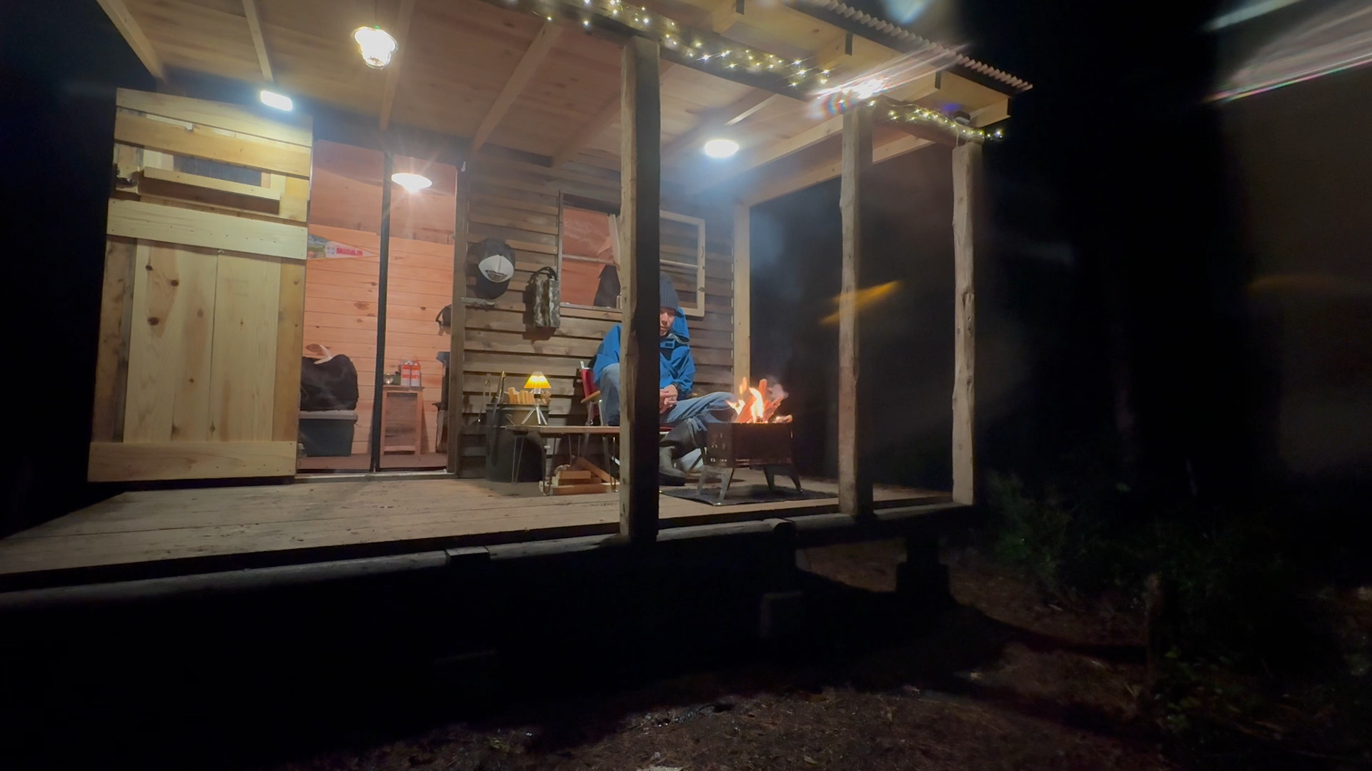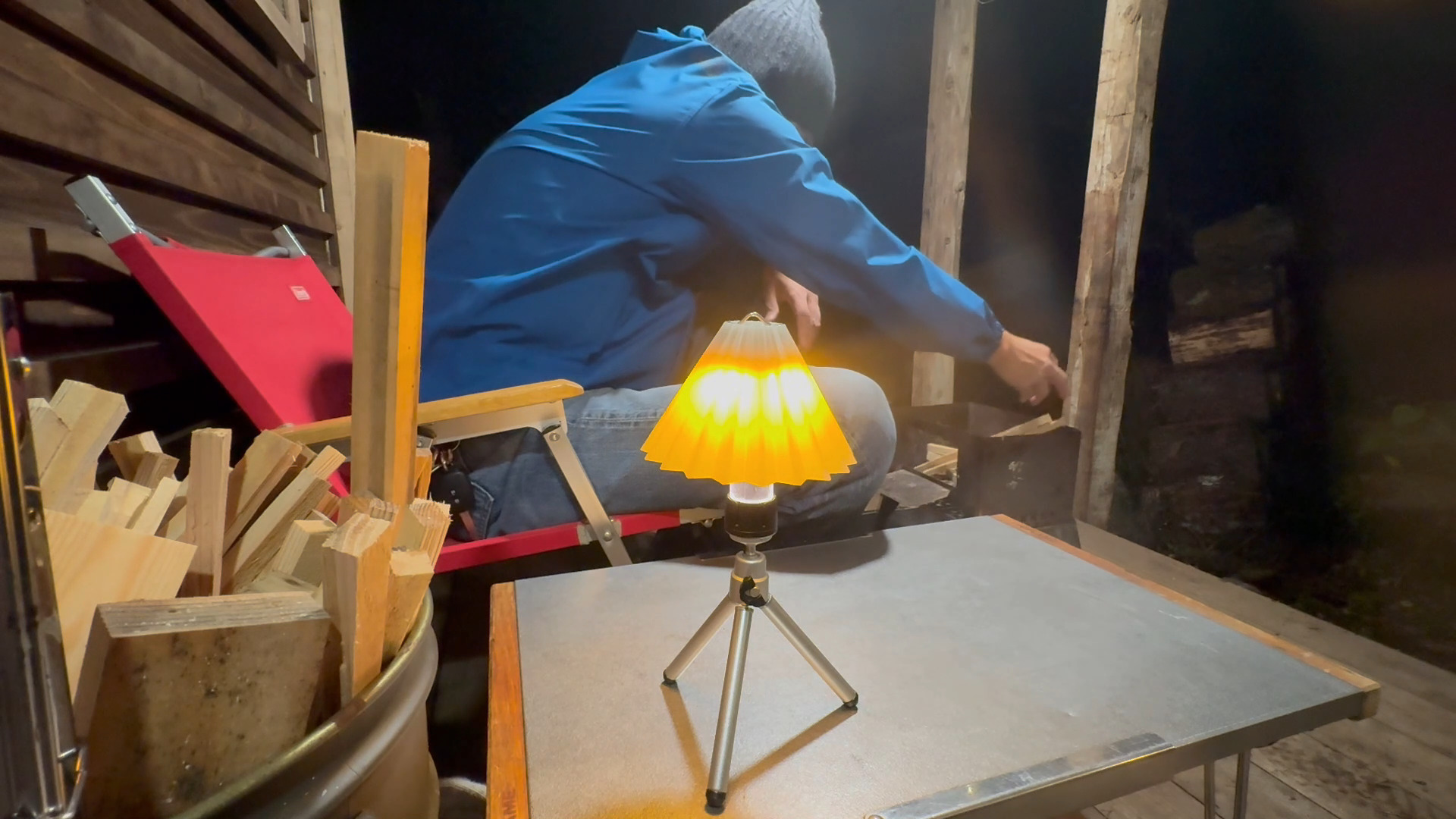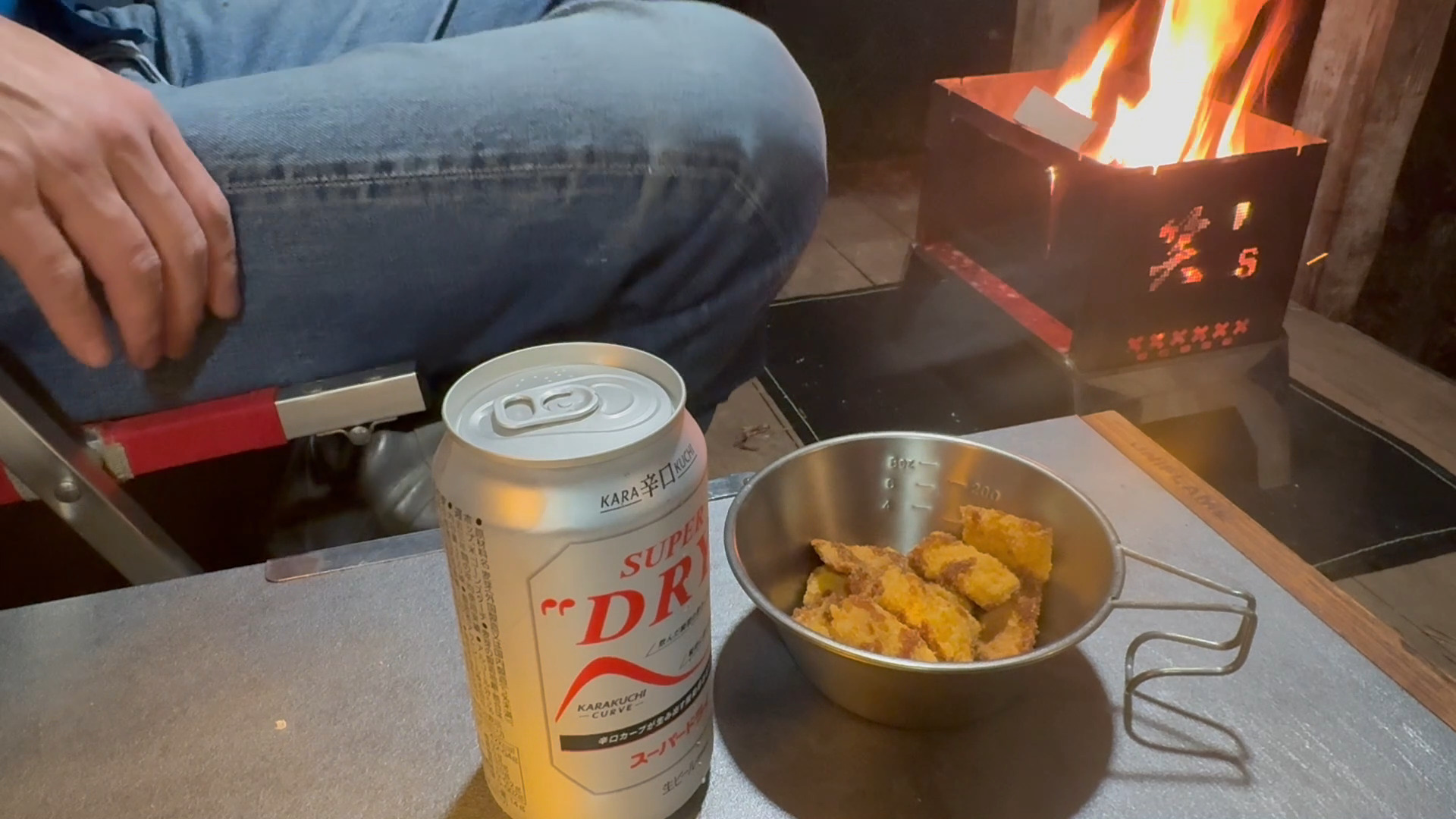 昼間に作業をして夕方に近場の温泉で疲れを癒し最近増築した屋根付きデッキで焚き火の準備をします。