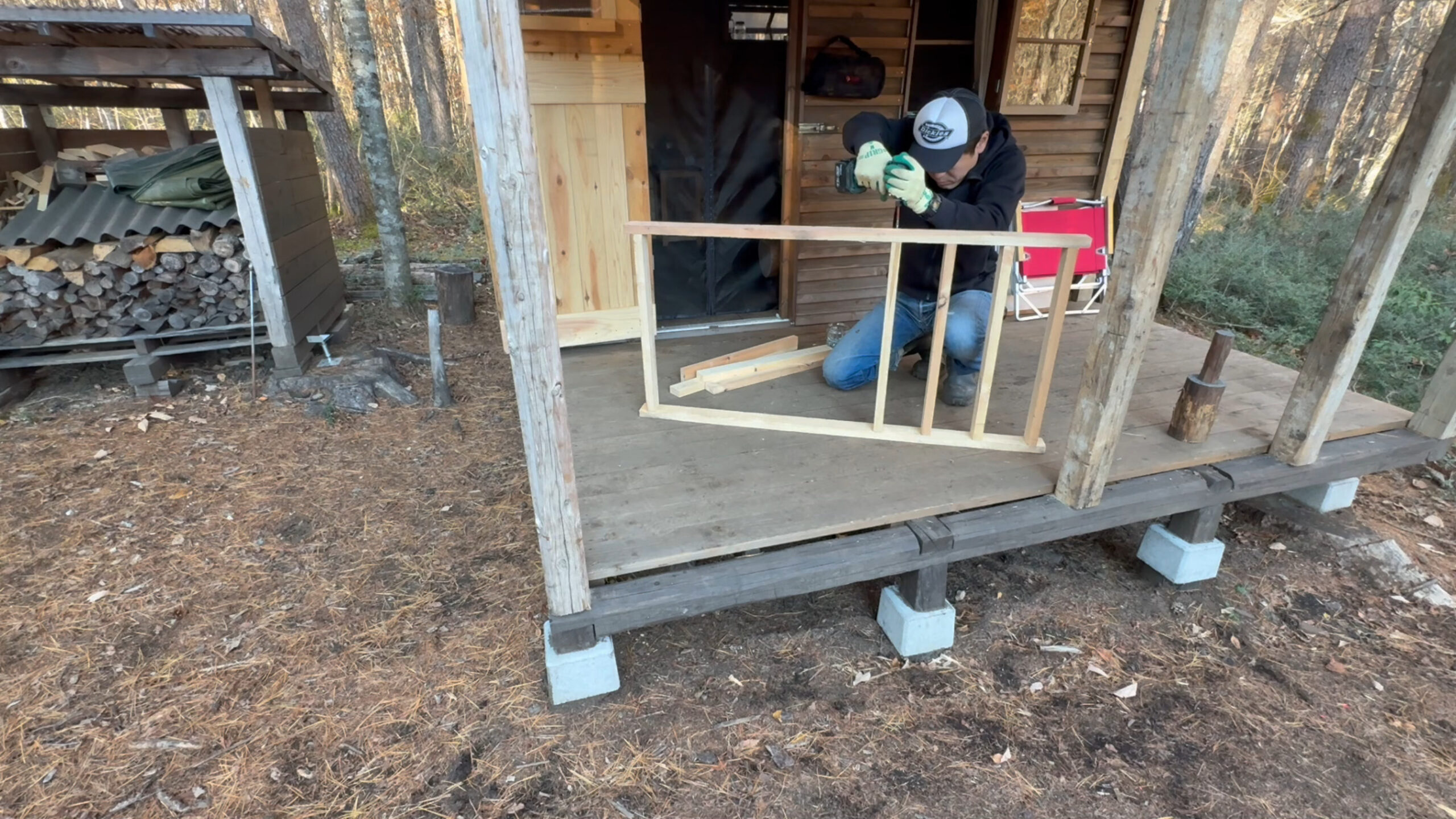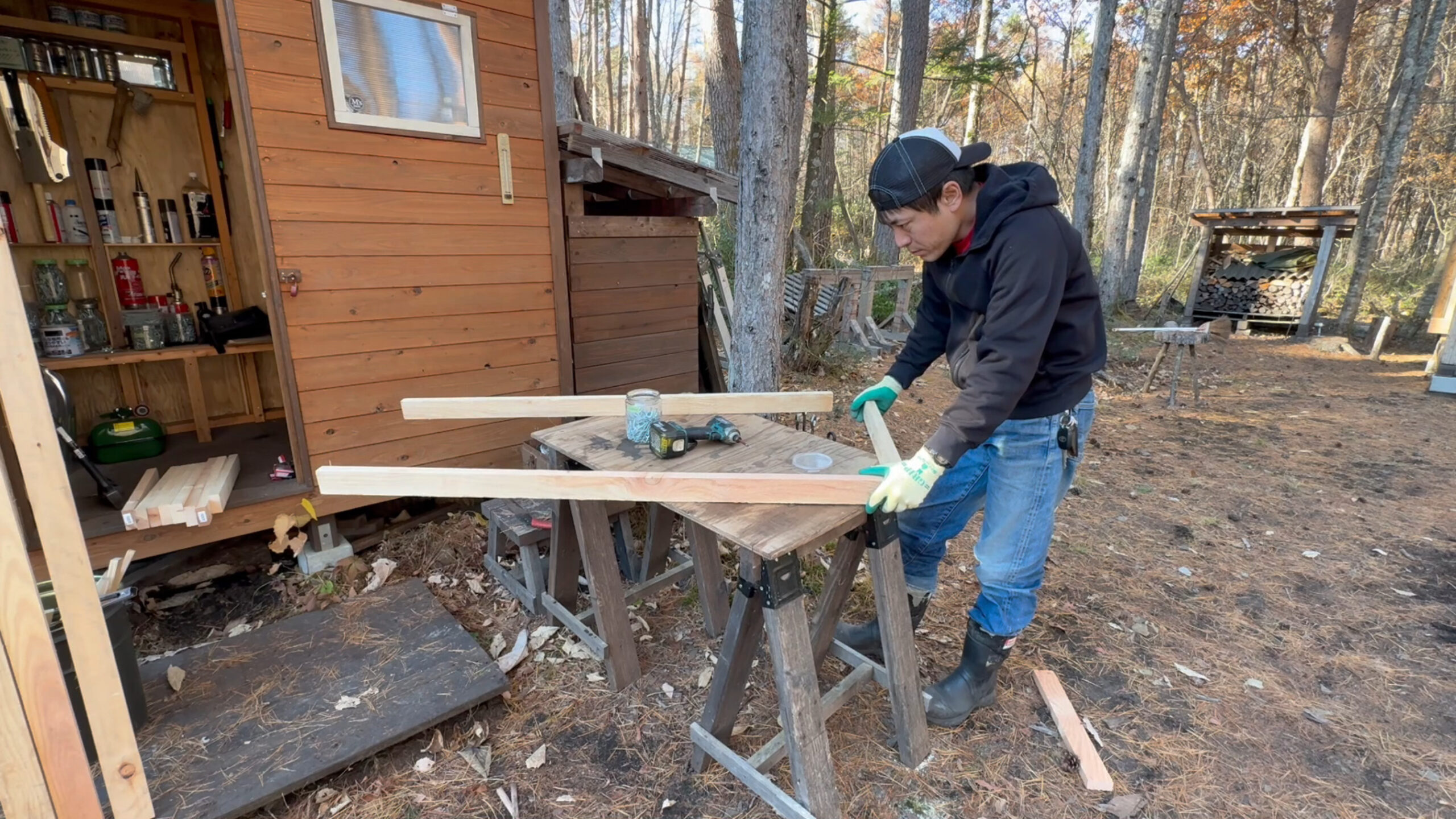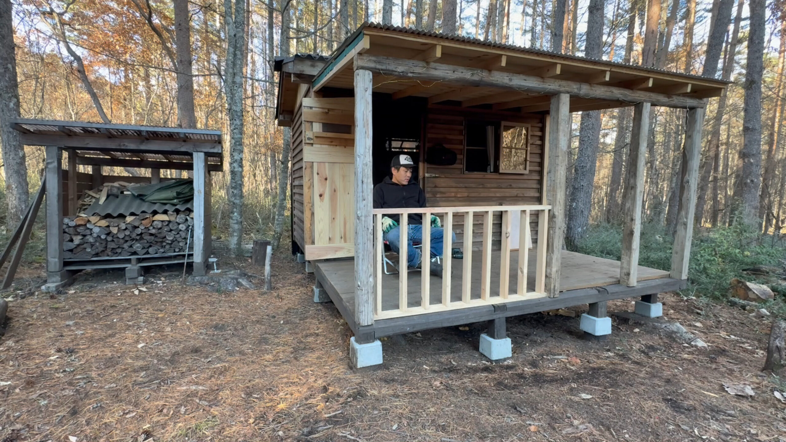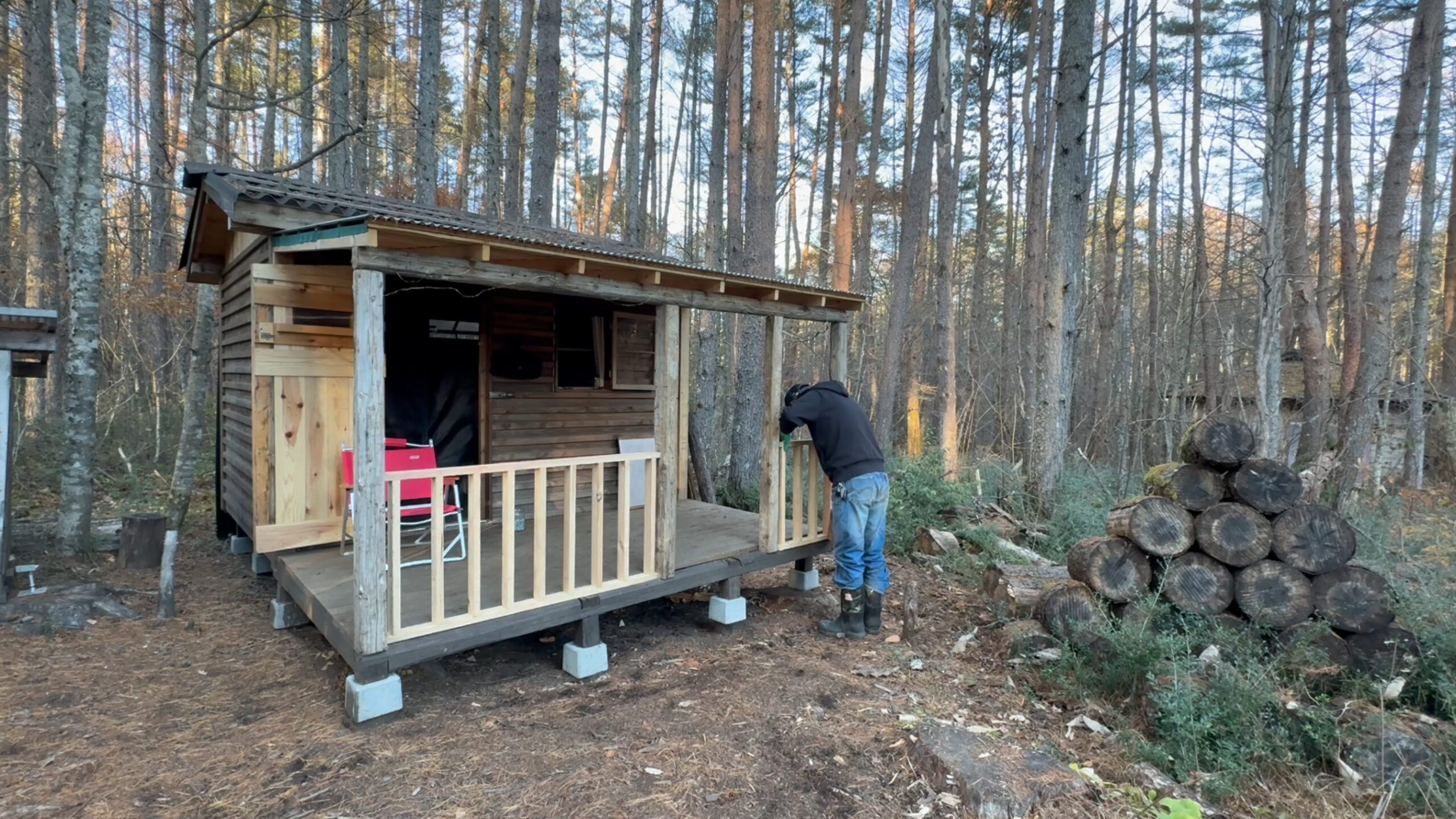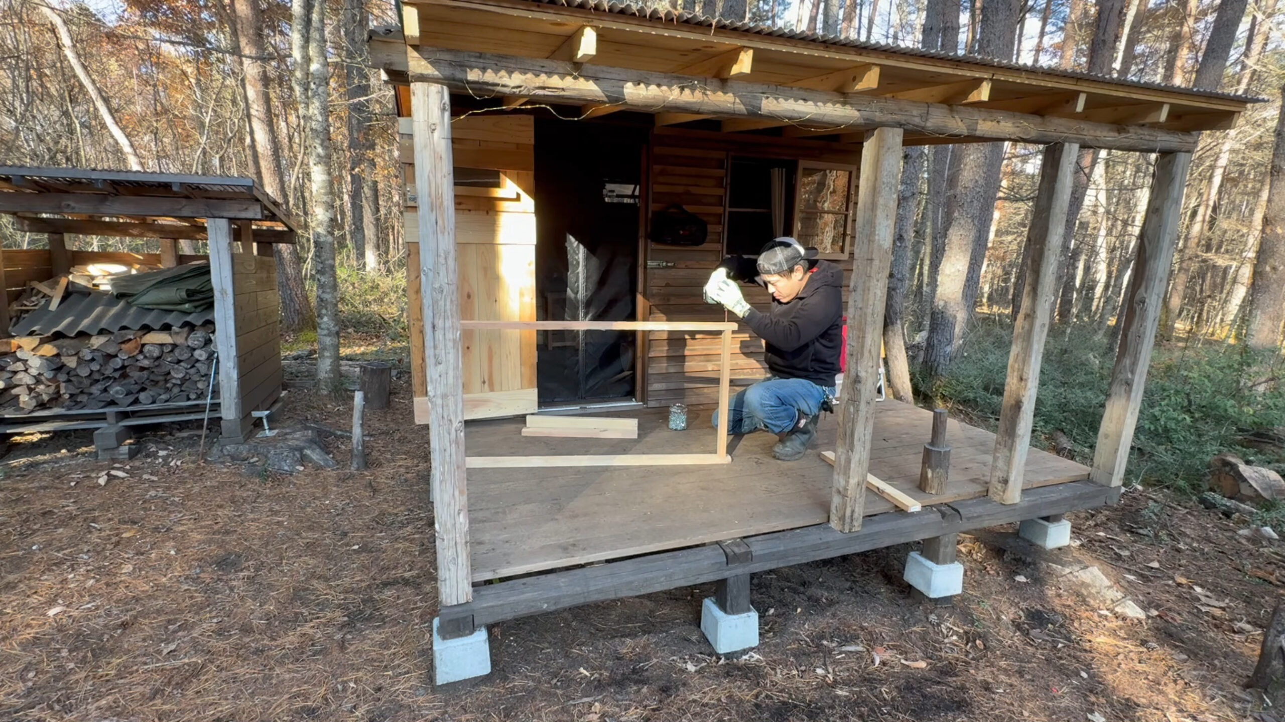 今回は山小屋に増築した屋根付きウッドデッキの正面の柵の製作をしたのでその様子をお送りしたいと思います。